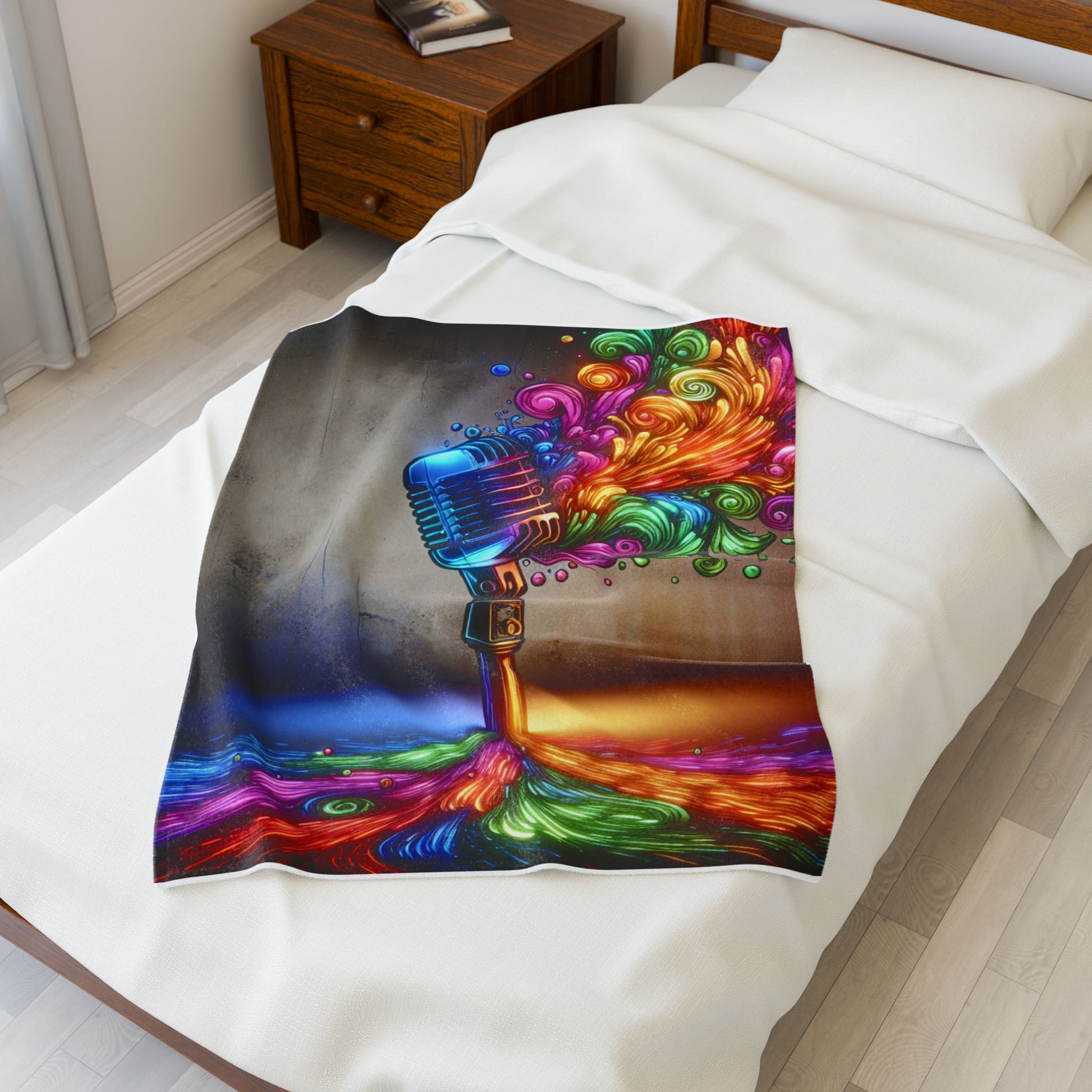 A vintage microphone erupts into a vibrant explosion of swirling, neon colors, spilling onto the floor. The dynamic, flowing energy creates a stunning contrast against the rustic background, blending music and art in a vivid celebration of creativity. Create a cozy and warm atmosphere at home with this plush velveteen blanket. It is soft to touch and perfect for any home. Customize with a one-sided print to add your personal touch or create a gift for your friends and family. Available in three sizes: 30x40", 50x60", 60x80".