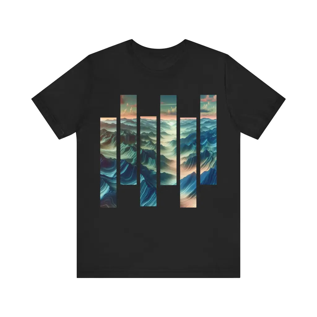 This image features abstract landscapes, fragmented into vertical panels. Swirling textures and gradients create a dreamy effect, blending natural mountain contours with an artistic, ethereal atmosphere. The soft pastels contrast dramatically against deep blues, capturing a sense of harmony and surreal beauty.. This classic unisex jersey short sleeve tee fits like a well-loved favorite. Soft cotton and quality print make users fall in love with it over and over again. These t-shirts have-ribbed knit collars to bolster shaping. The shoulders are tapered for a better fit over time. Dual side seams hold the garment's shape for longer.