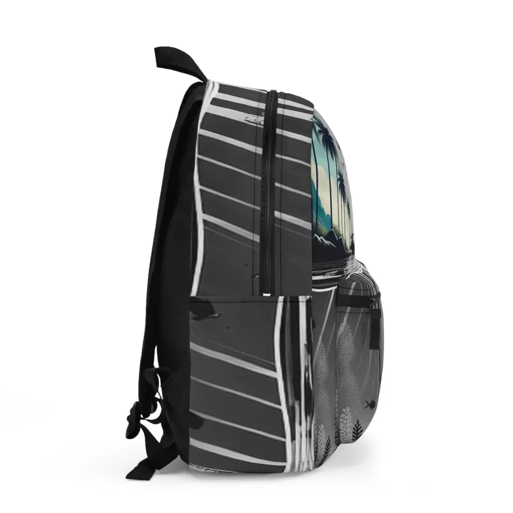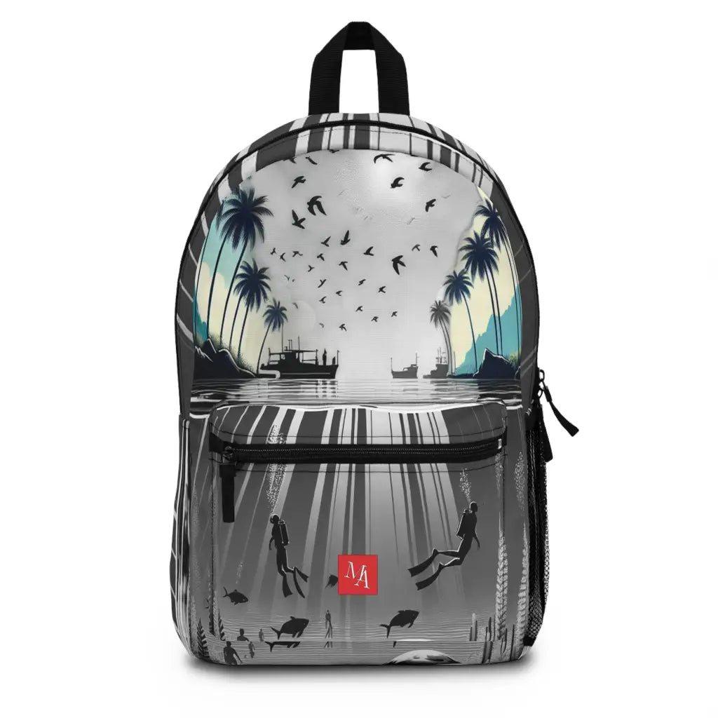A vibrant blend of tropical serenity and underwater wonder, featuring cascading sunbeams, diverse marine life, and adventurous divers. Towering palms frame the ocean, merging the mysterious depths with the idyllic surface, creating a harmonious fusion of nature's elements. Introducing the ultimate backpack for fashion-forward adventurers! Our backpack boasts a striking textile design that will make a statement wherever you go. With its durable construction and spacious compartments, it is perfect for carrying all your essentials. Get ready to turn heads and stay organized with our backpack. #textiledesign #backpack #fashionforward #adventure #durable #spacious #statementpiece #organized #essentials #travel #explore