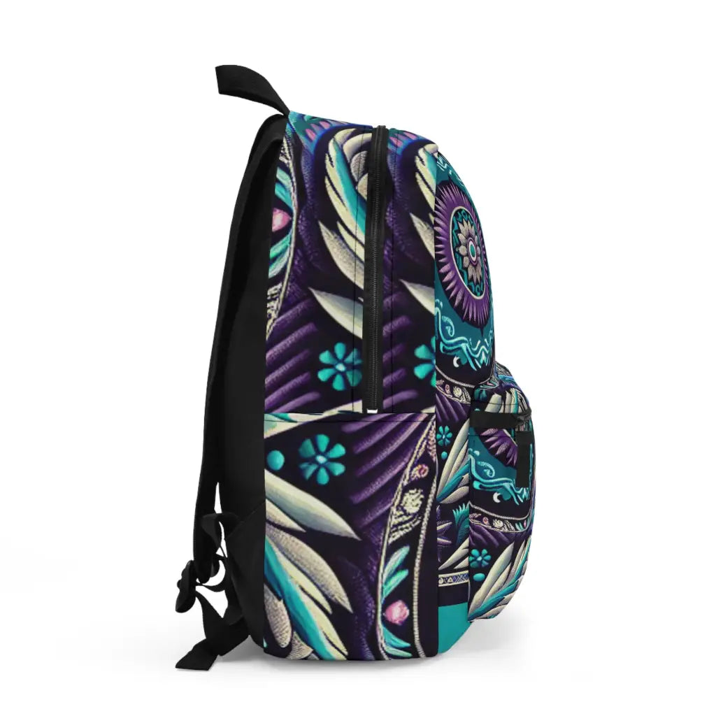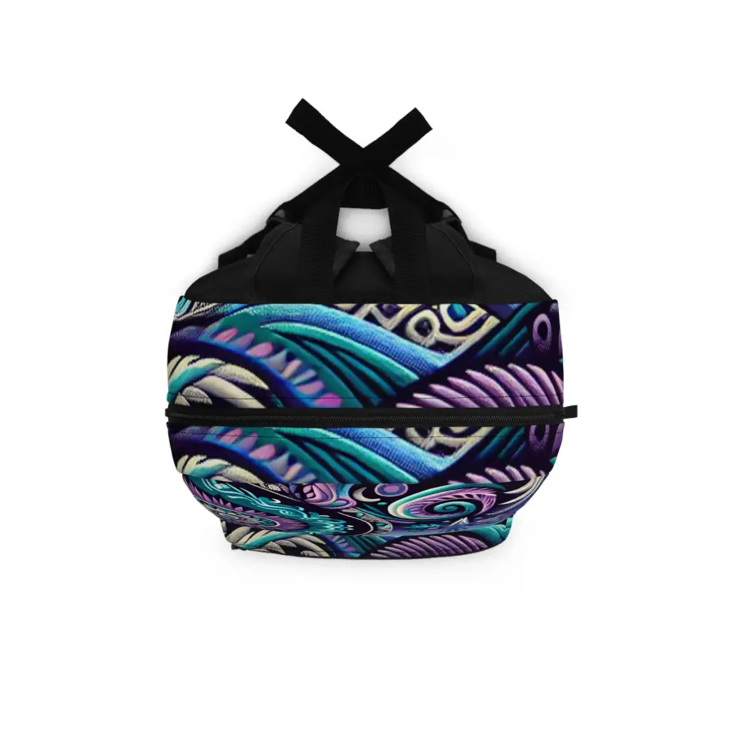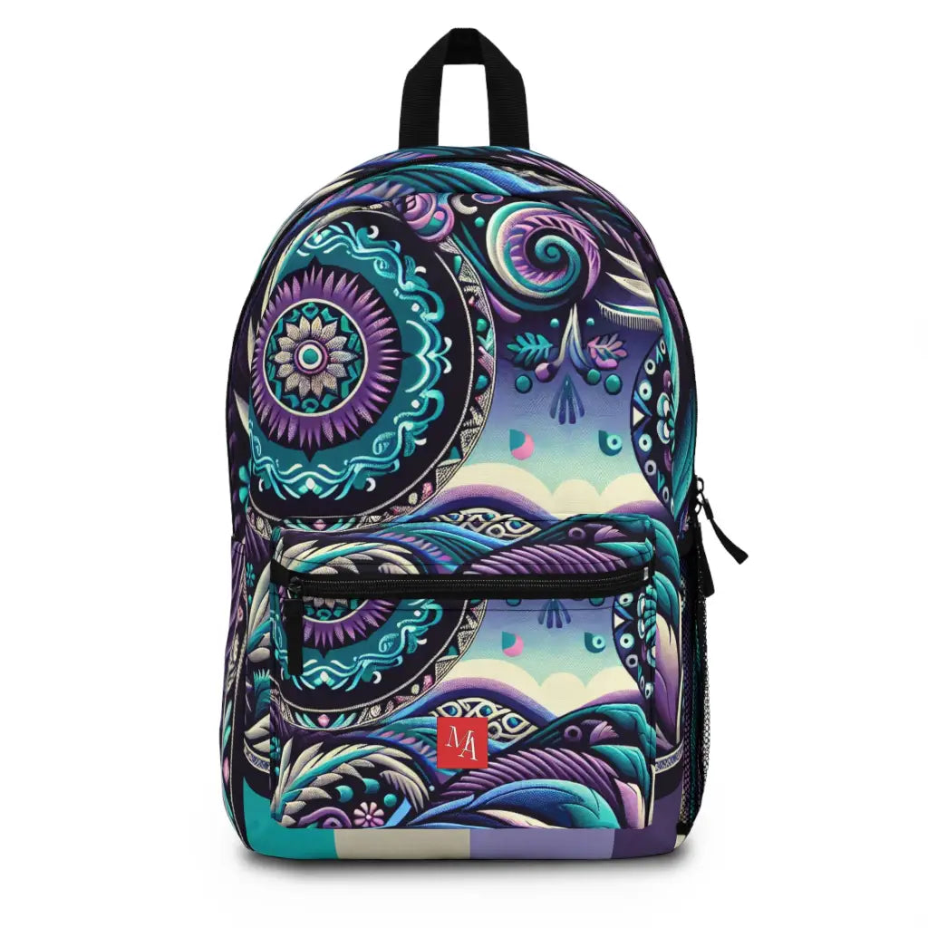The image displays ornate, mandala-inspired artwork with a rich color palette, blending deep blues, vibrant purples, and subtle pinks. Intricate patterns and floral motifs create a tapestry of symmetry and elegance, evoking a sense of serene complexity. Introducing the ultimate backpack for fashion-forward adventurers! Our backpack boasts a striking textile design that will make a statement wherever you go. With its durable construction and spacious compartments, it is perfect for carrying all your essentials. Get ready to turn heads and stay organized with our backpack. #textiledesign #backpack #fashionforward #adventure #durable #spacious #statementpiece #organized #essentials #travel #explore