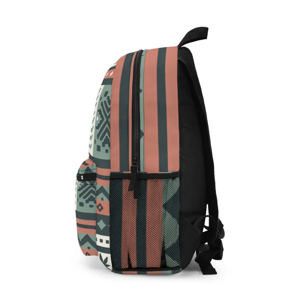 The image features a stylized, tribal-like pattern with a harmonious earth-toned color palette. In the center, a profile of a character with distinct facial paint adds a focal point amidst the geometric symmetry and recurring motifs reminiscent of traditional textiles. Introducing the ultimate backpack for fashion-forward adventurers! Our backpack boasts a striking textile design that will make a statement wherever you go. With its durable construction and spacious compartments, it is perfect for carrying all your essentials. Get ready to turn heads and stay organized with our backpack. #textiledesign #backpack #fashionforward #adventure #durable #spacious #statementpiece #organized #essentials #travel #explore