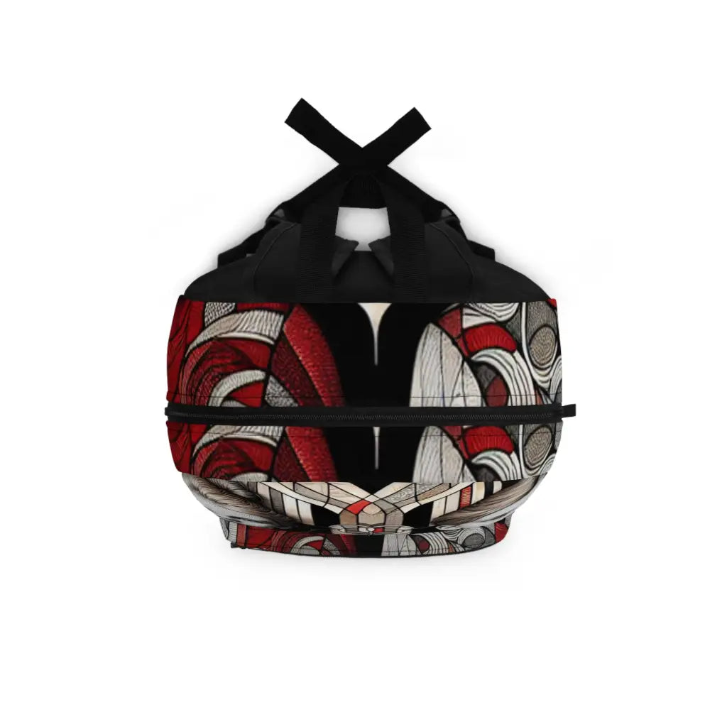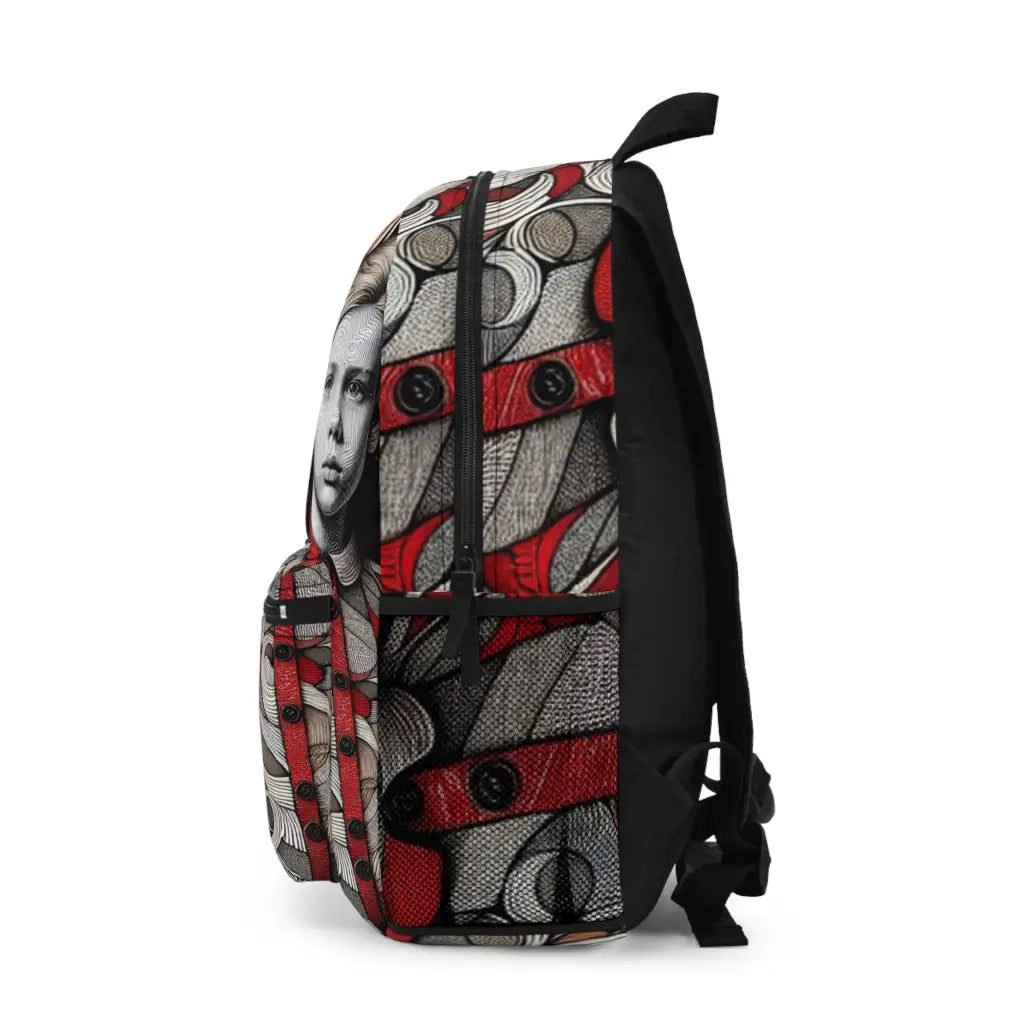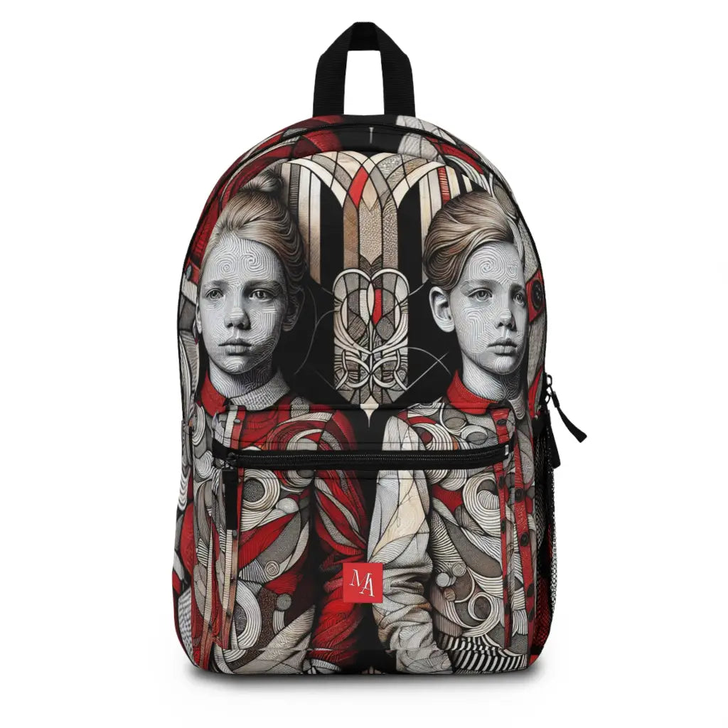 Abstract portraits of two figures adorned with intricate, maze-like patterns blend with monochrome backgrounds. The swirling lines create a mesmerizing contrast, transforming traditional imagery into an avant-garde expression. The vivid colors and hypnotic designs evoke a sense of movement and depth, enhancing the image's artistic allure. Introducing the ultimate backpack for fashion-forward adventurers! Our backpack boasts a striking textile design that will make a statement wherever you go. With its durable construction and spacious compartments, it is perfect for carrying all your essentials. Get ready to turn heads and stay organized with our backpack. #textiledesign #backpack #fashionforward #adventure #durable #spacious #statementpiece #organized #essentials #travel #explore
