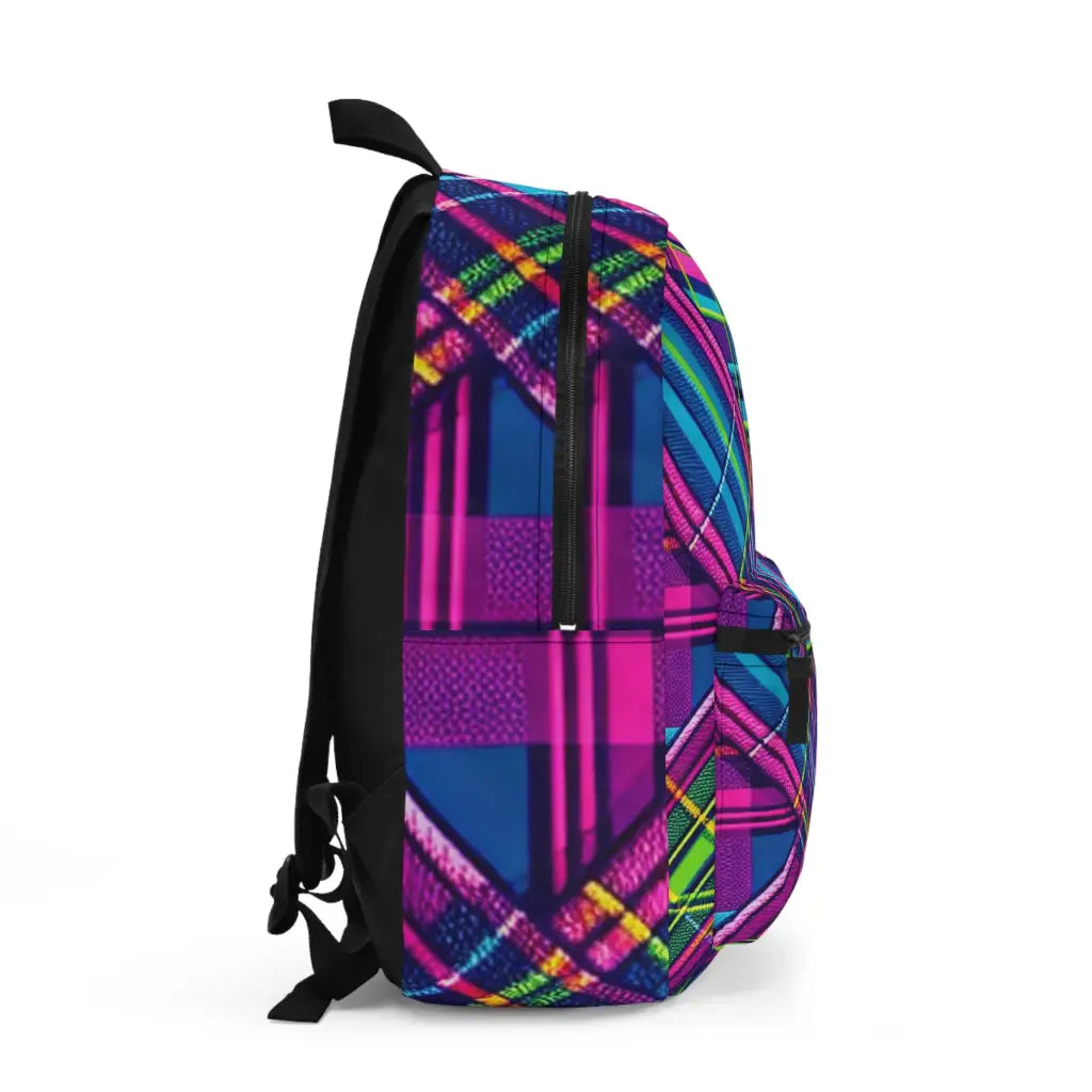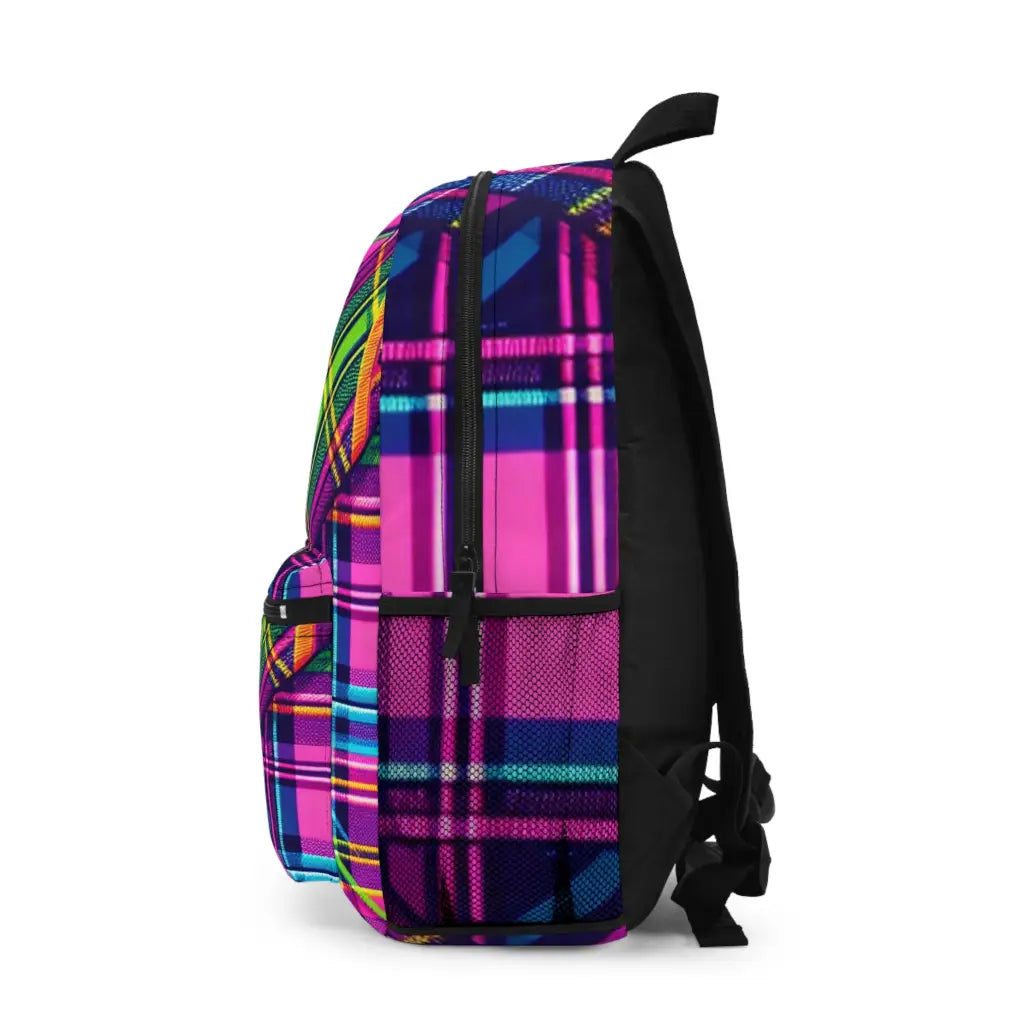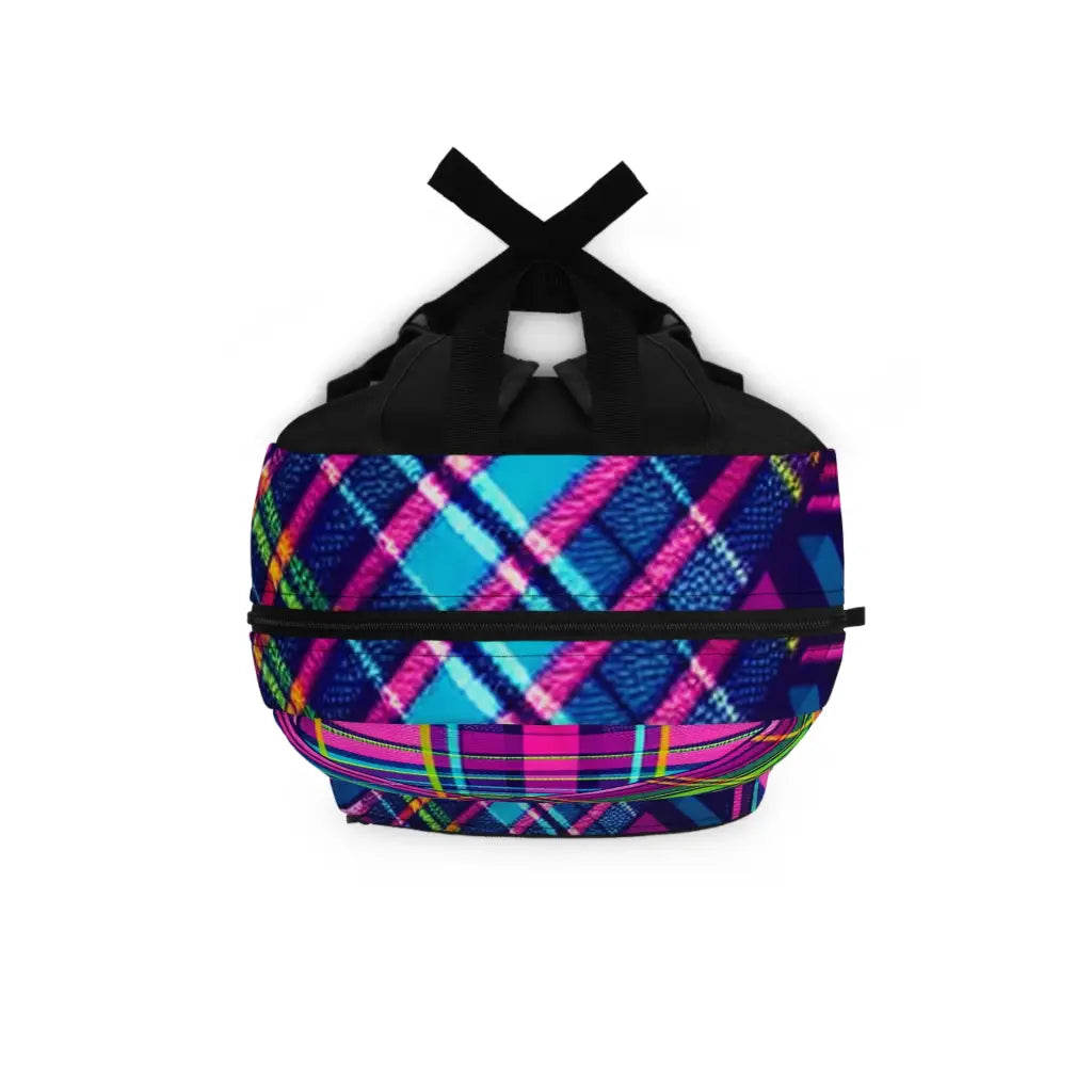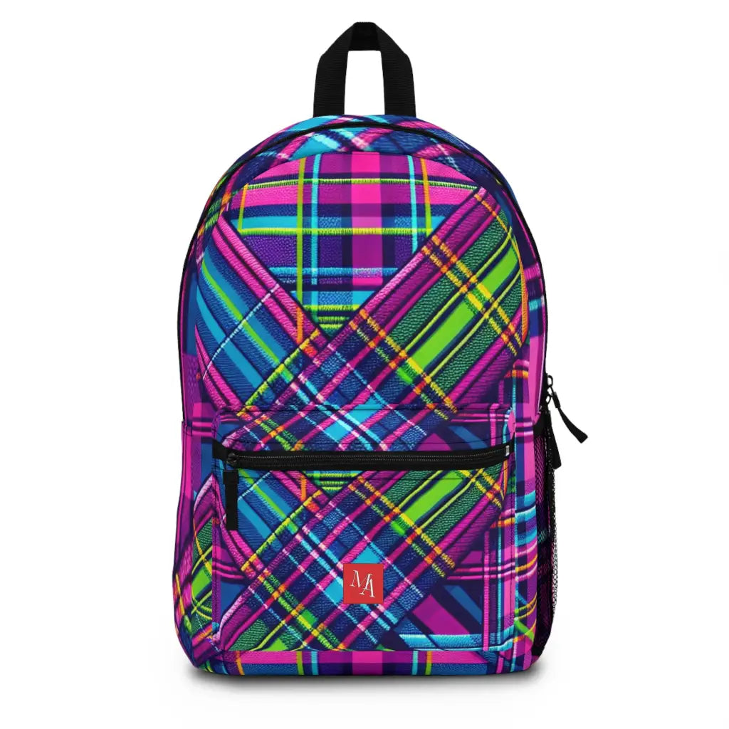 A vibrant cacophony of overlapping tartan patterns, this image offers a visual feast of intersecting lines and clashing colors that challenge the traditional plaid design with a contemporary digital twist. Introducing the ultimate backpack for fashion-forward adventurers! Our backpack boasts a striking textile design that will make a statement wherever you go. With its durable construction and spacious compartments, it is perfect for carrying all your essentials. Get ready to turn heads and stay organized with our backpack. #textiledesign #backpack #fashionforward #adventure #durable #spacious #statementpiece #organized #essentials #travel #explore
