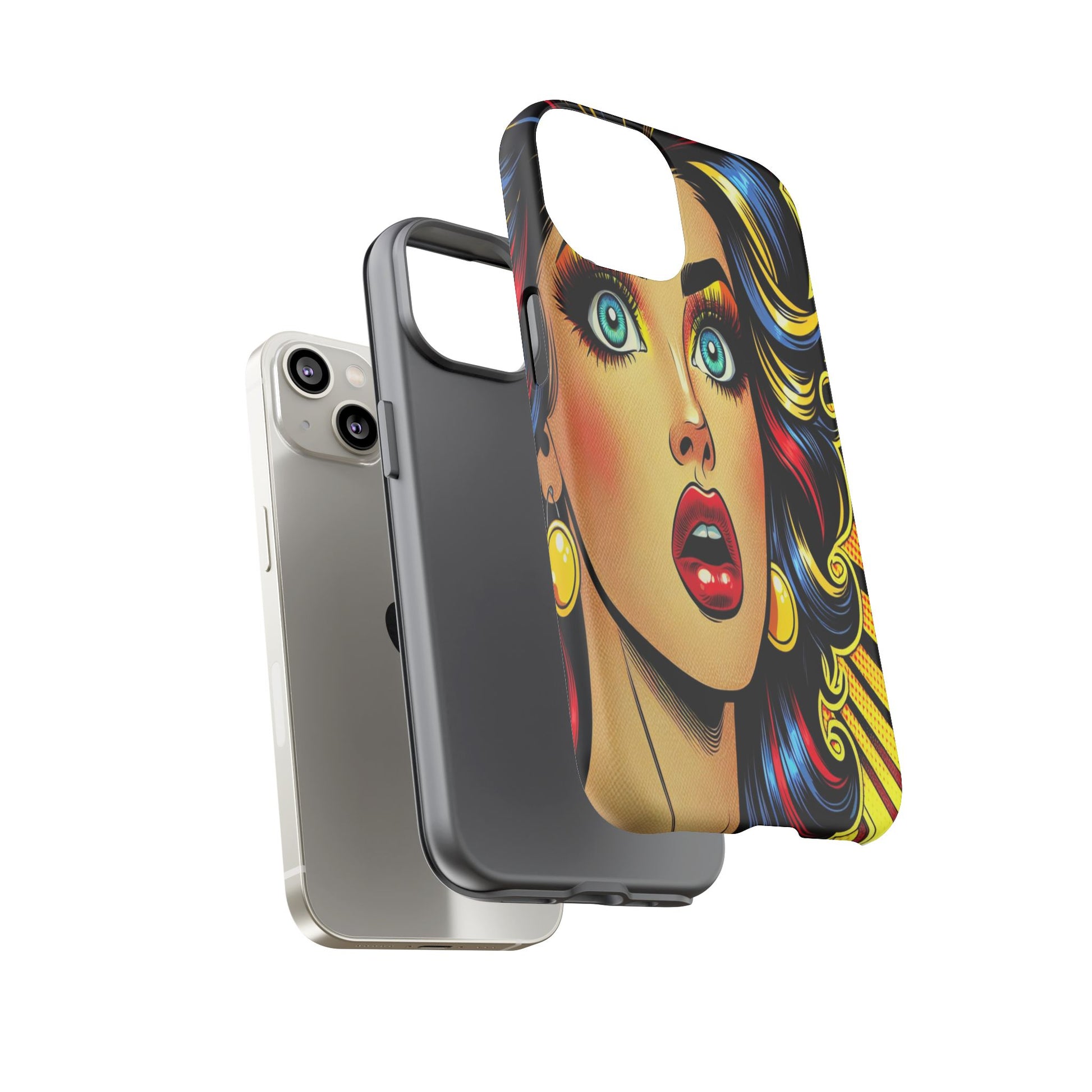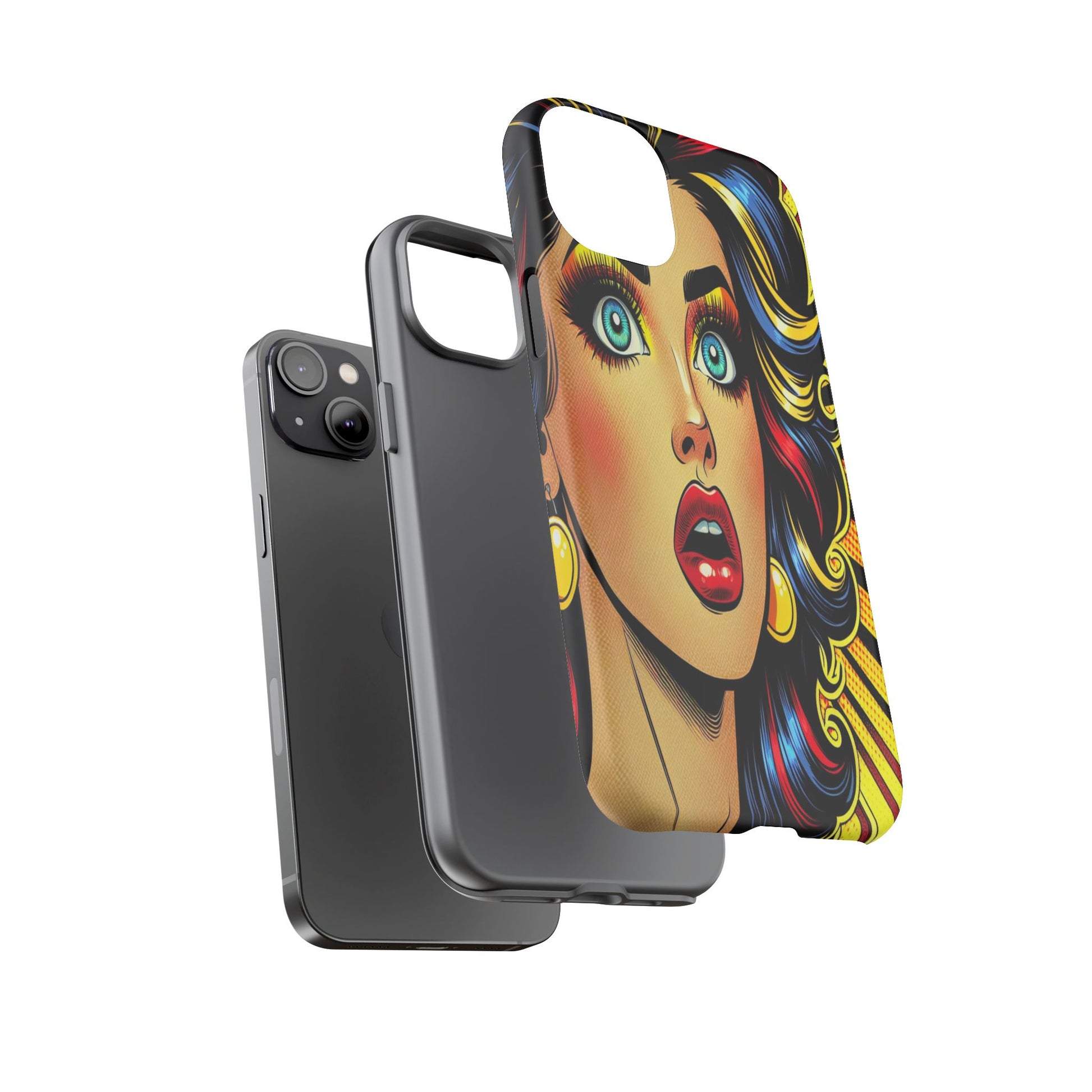 Vivid pop art portrait captures retro flair with electrifying colors and bold outlines. A striking expression of wonder, framed by swirling, multicolored hair and exaggerated makeup, draws the eye in a vibrant storytelling burst. iPhone, Samsung Galaxy, and Google Pixel devices with premium-quality custom protective phone cases. Every case has double layers for extra durability and protection while the clear, open ports stay out of your way when it comes to charging. The outer polycarbonate shell will resist daily impacts. Choose between matte or glossy finish and enjoy adding a unique touch to your phone with our custom protective phone cases sourced from Korea.