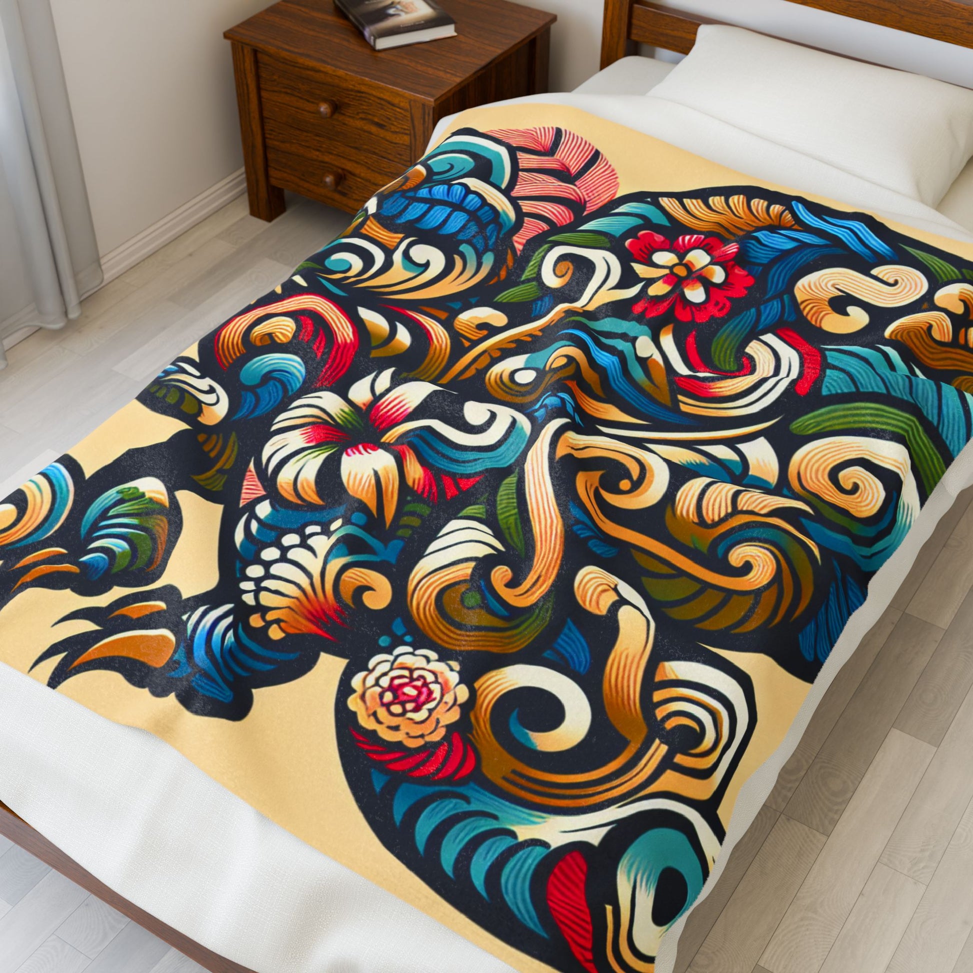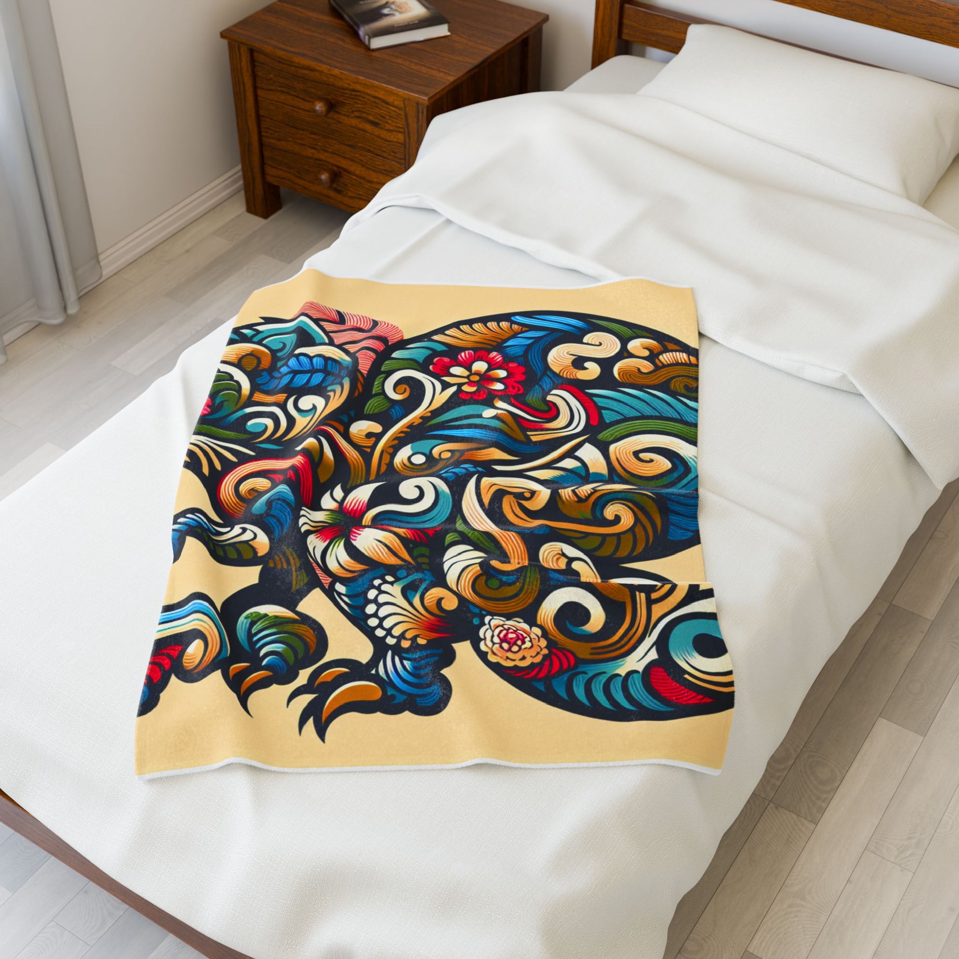 This vibrant image showcases an intricately detailed dinosaur composed of swirling floral motifs. The bold colors of teal, red, and gold blend seamlessly, creating a dynamic fusion of nature and fantasy on a soft beige background. Its ornate design and imaginative execution captivate the viewer. Create a cozy and warm atmosphere at home with this plush velveteen blanket. It is soft to touch and perfect for any home. Customize with a one-sided print to add your personal touch or create a gift for your friends and family. Available in three sizes: 30x40", 50x60", 60x80".