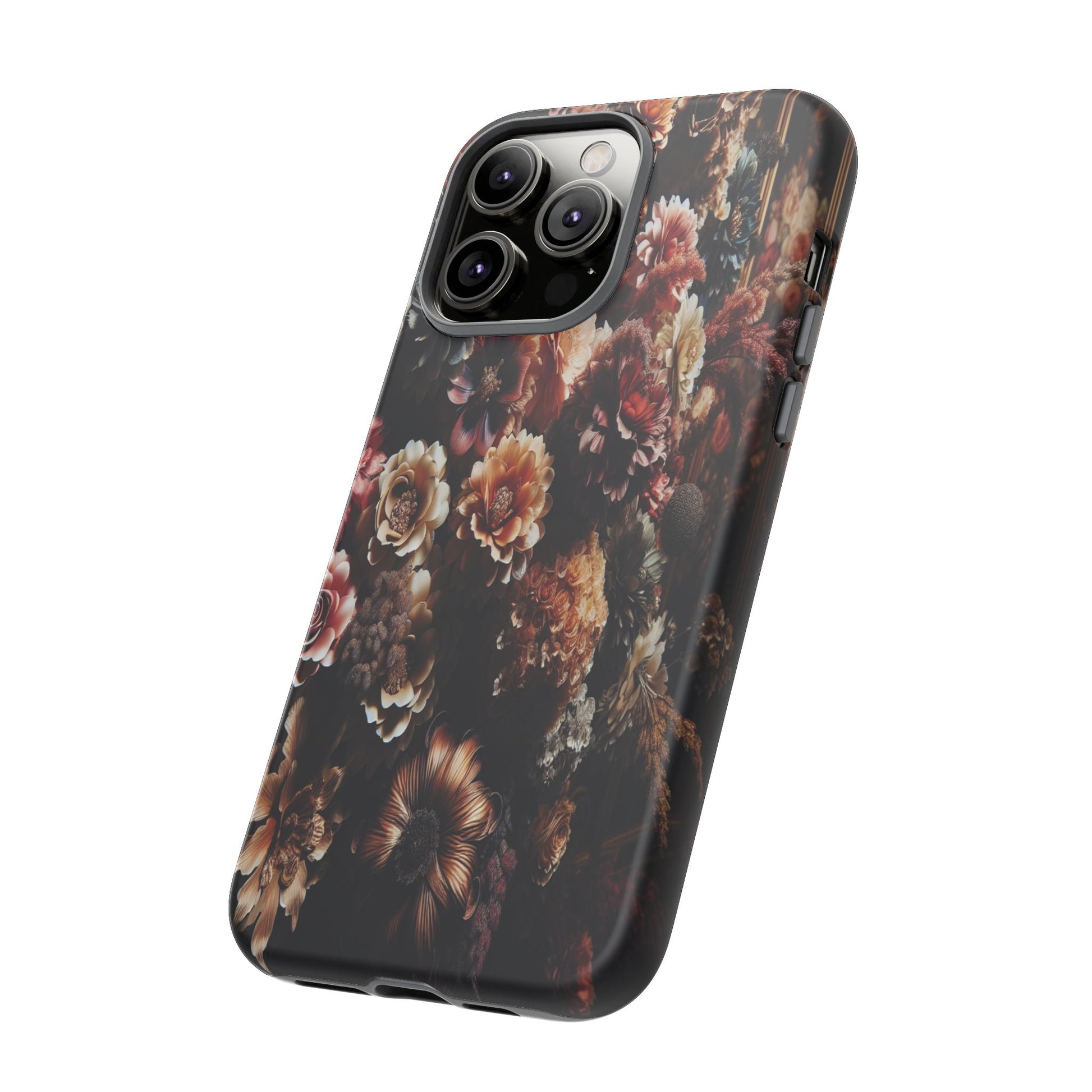 Luxurious floral montage bursting with rich, autumnal hues against an ornate backdrop. Each blossom is meticulously arranged, blending realistic textures with artistic brilliance. The intricate play of light and shadow adds depth, creating a dynamic, immersive visual experience. Protect your phone in style with our premium-quality custom protective phone cases, designed to fit iPhones from the latest iPhone 16 to earlier models like iPhone XR, XS, and X. Each case features double-layer protection with a durable polycarbonate outer shell and a soft TPU lining for extra impact resistance, making it ideal for daily use.