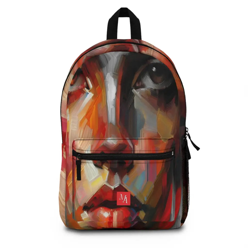 A vibrant, dynamic portrait that blends bold, brush-stroke textures with a vivid color palette. The striking interplay of reds, blues, and yellows creates an intense, expressive gaze, blending realism with abstract flair. Introducing the ultimate backpack for fashion-forward adventurers! Our backpack boasts a striking textile design that will make a statement wherever you go. With its durable construction and spacious compartments, it is perfect for carrying all your essentials. Get ready to turn heads and stay organized with our backpack. #textiledesign #backpack #fashionforward #adventure #durable #spacious #statementpiece #organized #essentials #travel #explore