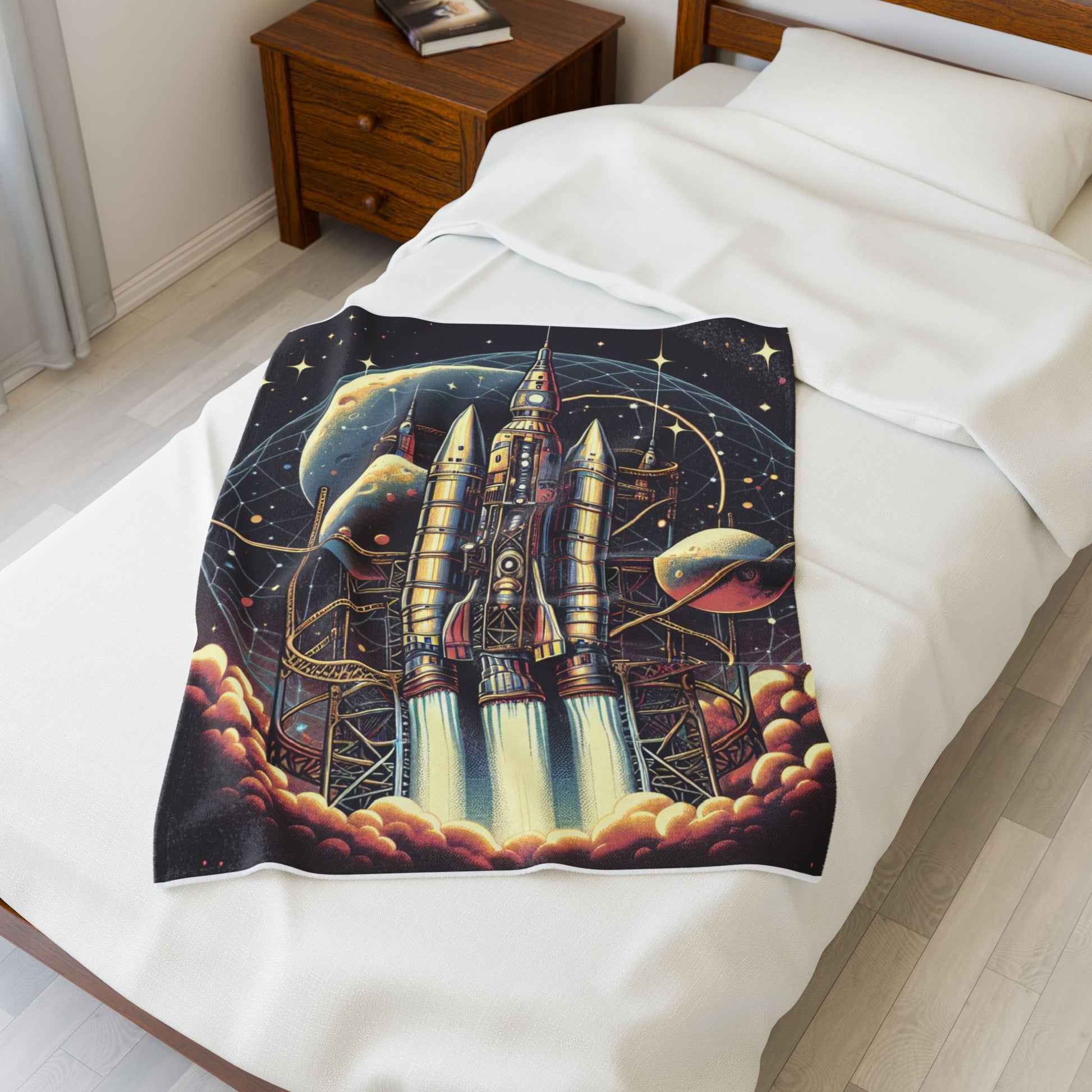 A retro-futuristic rocket launches amidst swirling clouds and planets, encased in a celestial grid. The intricate, metallic design contrasts with vibrant cosmic hues, highlighting an imaginative blend of vintage sci-fi and modern artistry. Captivatingly adventurous. Create a cozy and warm atmosphere at home with this plush velveteen blanket. It is soft to touch and perfect for any home. Customize with a one-sided print to add your personal touch or create a gift for your friends and family. Available in three sizes: 30x40", 50x60", 60x80".