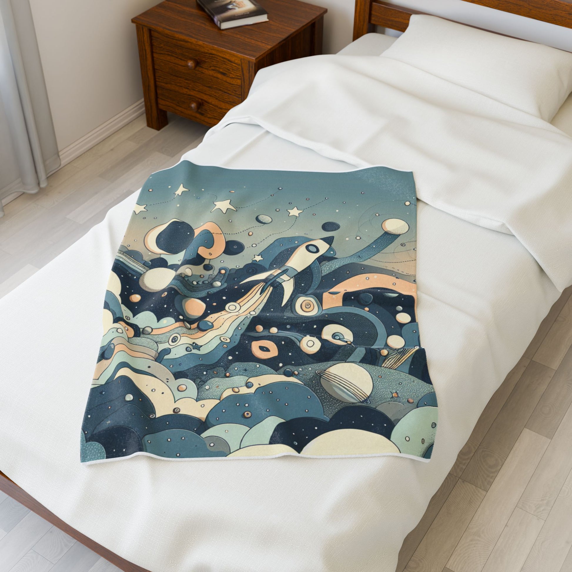 This surreal artwork features a rocket soaring through abstract celestial landscapes, dotted with swirling stars and planets. Soft curves and muted tones create a whimsical, dreamlike universe, blending retro-futurism with imaginative fantasy elements. The scene captures the boundless adventure of cosmic exploration. Create a cozy and warm atmosphere at home with this plush velveteen blanket. It is soft to touch and perfect for any home. Customize with a one-sided print to add your personal touch or create a gift for your friends and family. Available in three sizes: 30x40", 50x60", 60x80".