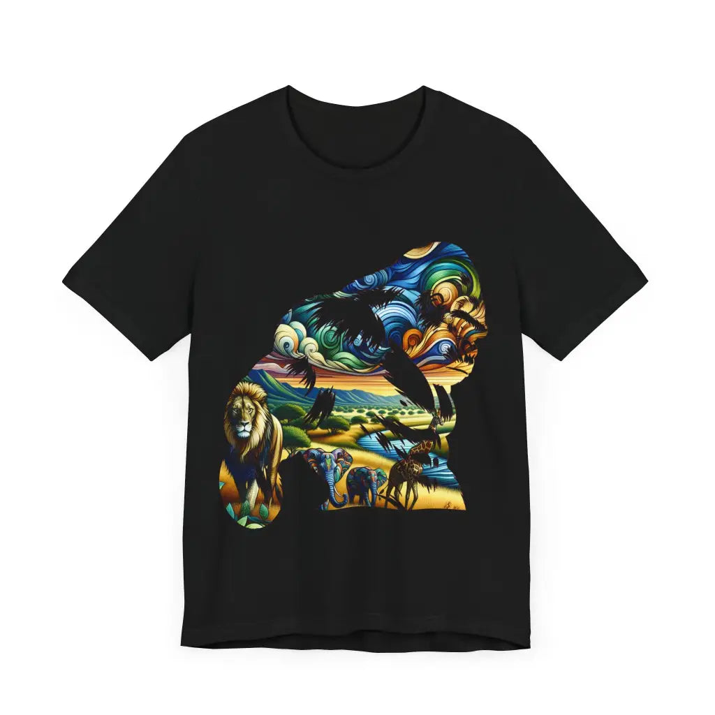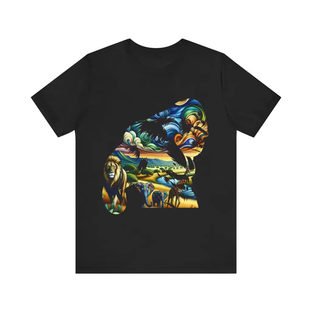 Silhouetted gorilla frames a vibrant African safari scene, featuring swirling skies, a majestic lion, intricately patterned elephants, and a graceful giraffe. The fusion of organic lines and vivid colors creates a dynamic, dreamlike tapestry, blending wildlife and landscape in harmonious unity.. This classic unisex jersey short sleeve tee fits like a well-loved favorite. Soft cotton and quality print make users fall in love with it over and over again. These t-shirts have-ribbed knit collars to bolster shaping. The shoulders are tapered for a better fit over time. Dual side seams hold the garment's shape for longer.