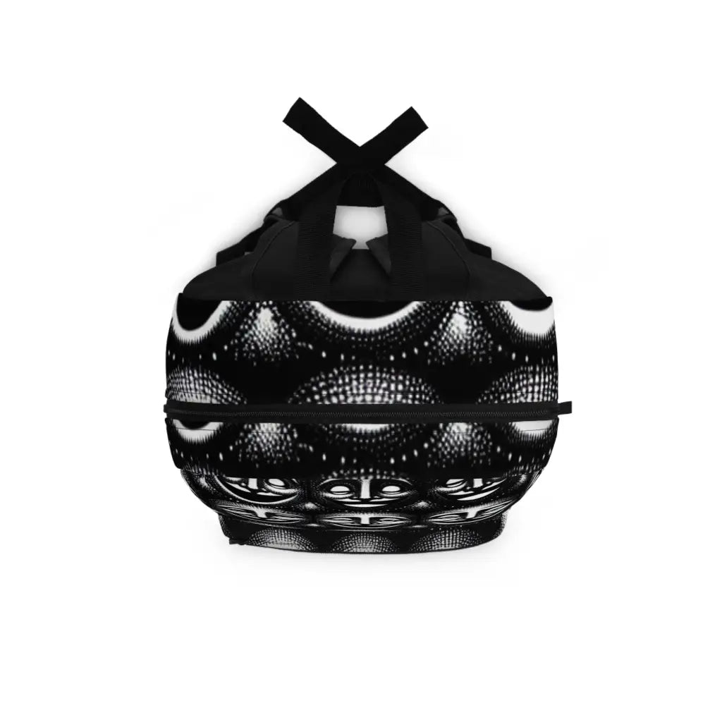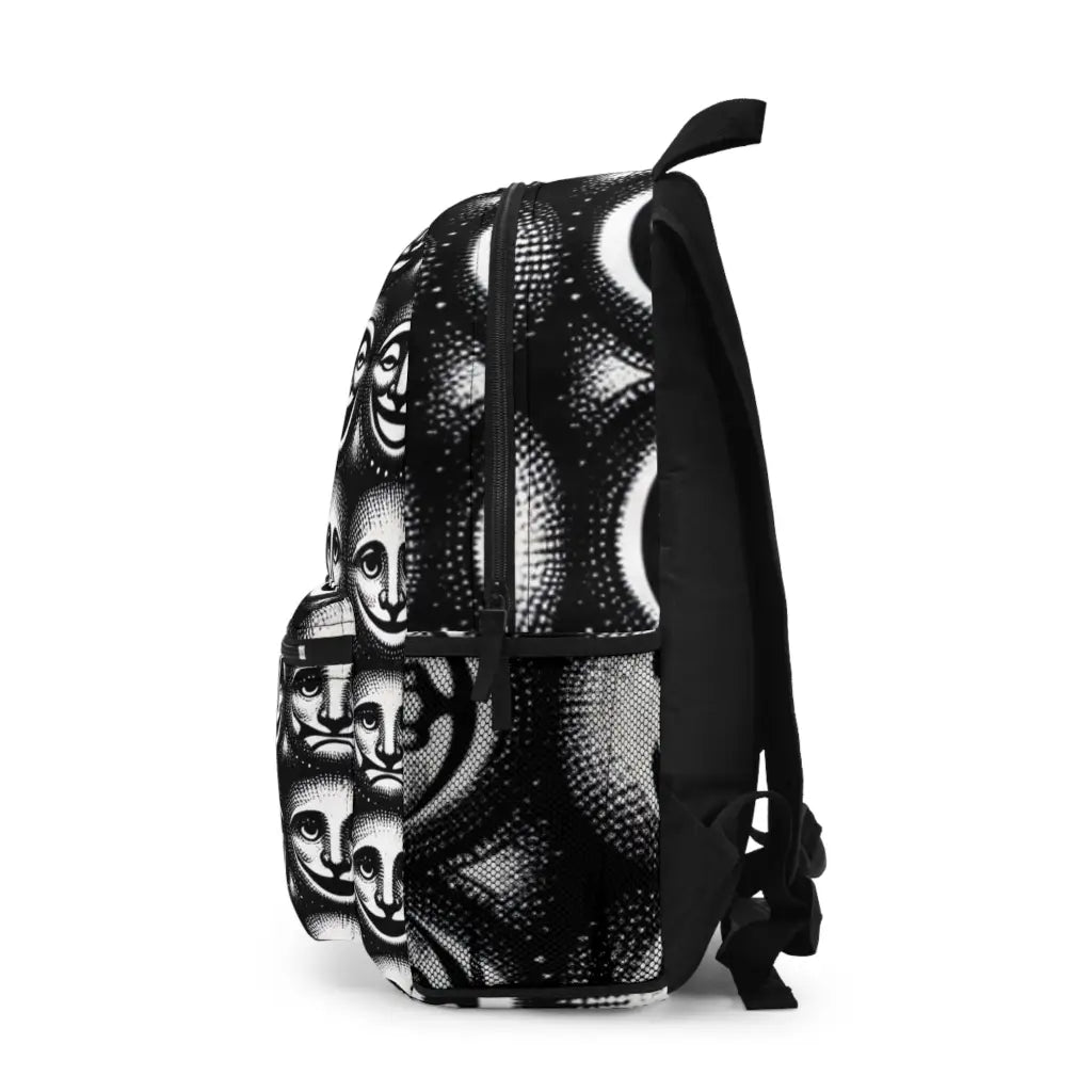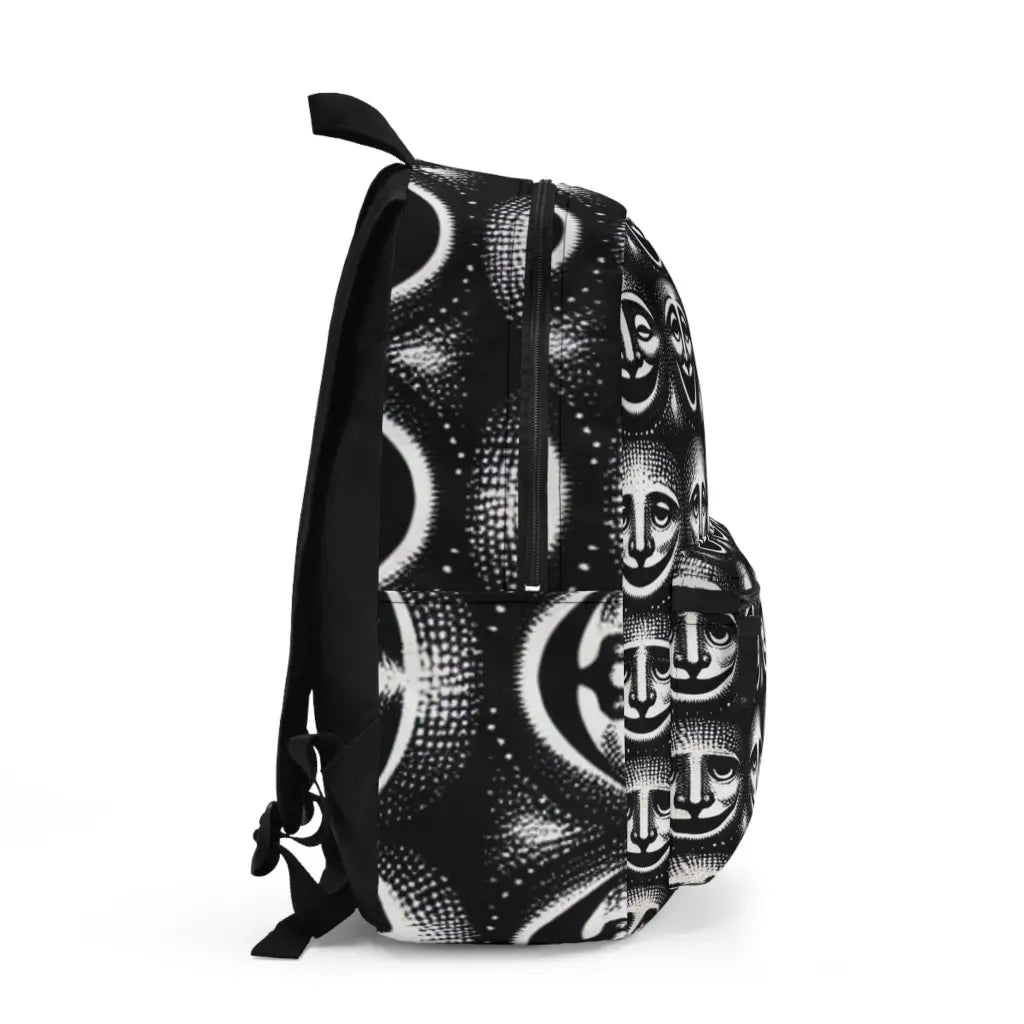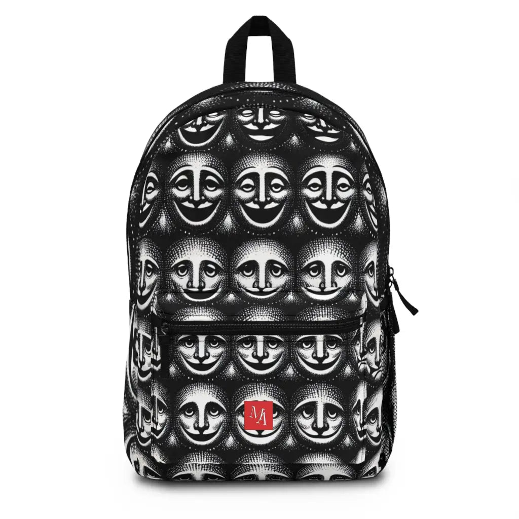 A playful pattern of white smiling faces with heart eyes on a black background creates a whimsical, minimalist aesthetic. The repetition of the design lends a sense of rhythm and modernity, adding a touch of joyful simplicity and bold contrast. Introducing the ultimate backpack for fashion-forward adventurers! Our backpack boasts a striking textile design that will make a statement wherever you go. With its durable construction and spacious compartments, it is perfect for carrying all your essentials. Get ready to turn heads and stay organized with our backpack. #textiledesign #backpack #fashionforward #adventure #durable #spacious #statementpiece #organized #essentials #travel #explore