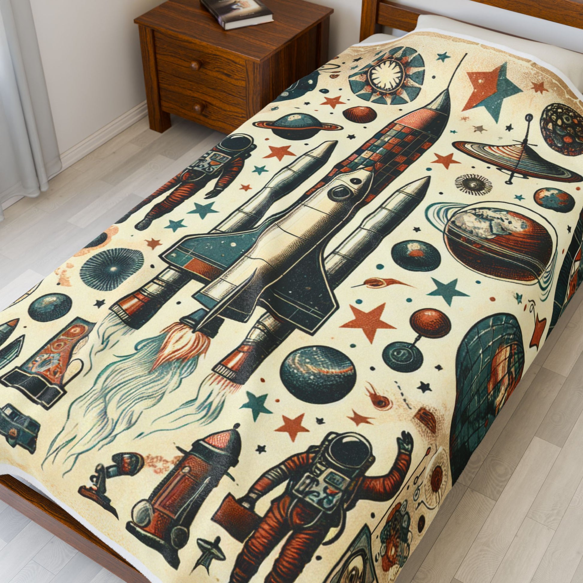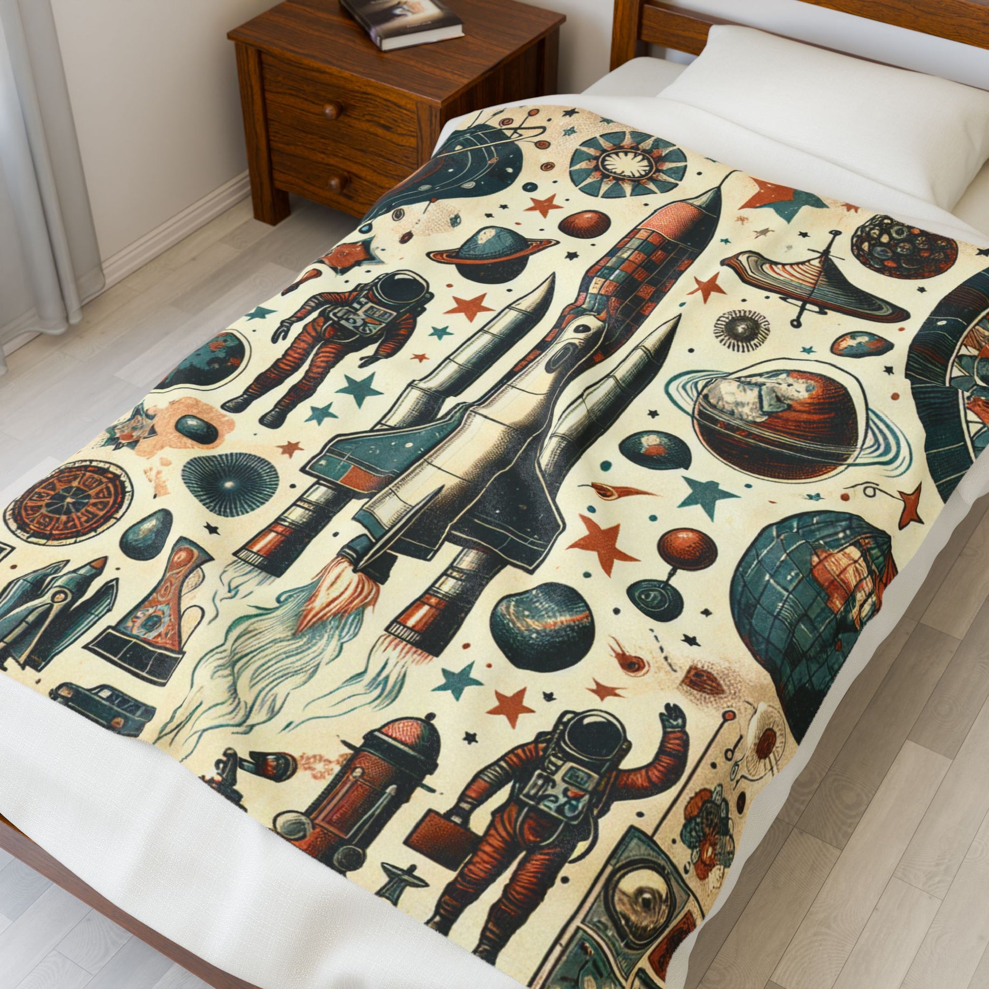 Retro-futuristic collage blends classic space exploration symbols: rockets, planets, astronauts. Detailed layering and a vintage color palette evoke nostalgia and curiosity, seamlessly merging science with imagination. Each element invites exploration, creating a visually engaging narrative of space adventure. Create a cozy and warm atmosphere at home with this plush velveteen blanket. It is soft to touch and perfect for any home. Customize with a one-sided print to add your personal touch or create a gift for your friends and family. Available in three sizes: 30x40", 50x60", 60x80".