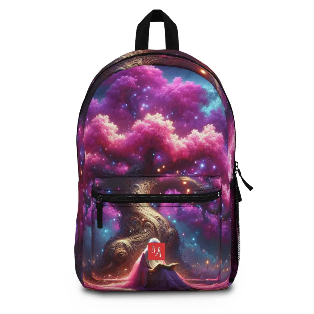 A whimsical scene features a girl reading under a glowing tree with vibrant pink leaves. Enchanted light orbs float around, illuminating her with a magical aura. The stormy sky crackles with lightning, blending elements of tranquility and energy in a surreal, dreamlike atmosphere. Introducing the ultimate backpack for fashion-forward adventurers! Our backpack boasts a striking textile design that will make a statement wherever you go. With its durable construction and spacious compartments, it is perfect for carrying all your essentials. Get ready to turn heads and stay organized with our backpack. #textiledesign #backpack #fashionforward #adventure #durable #spacious #statementpiece #organized #essentials #travel #explore