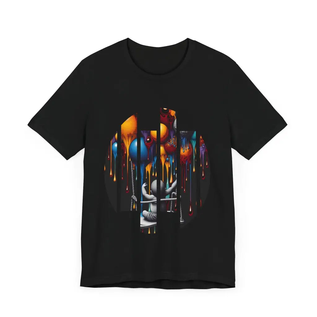 The image features a monochrome child on a swing, ascending into a vibrant cascade of dripping, colorful orbs. This surreal scene combines elements of innocence and vivid imagination, creating a dreamlike atmosphere against a stark black background.. This classic unisex jersey short sleeve tee fits like a well-loved favorite. Soft cotton and quality print make users fall in love with it over and over again. These t-shirts have-ribbed knit collars to bolster shaping. The shoulders are tapered for a better fit over time. Dual side seams hold the garment's shape for longer.
