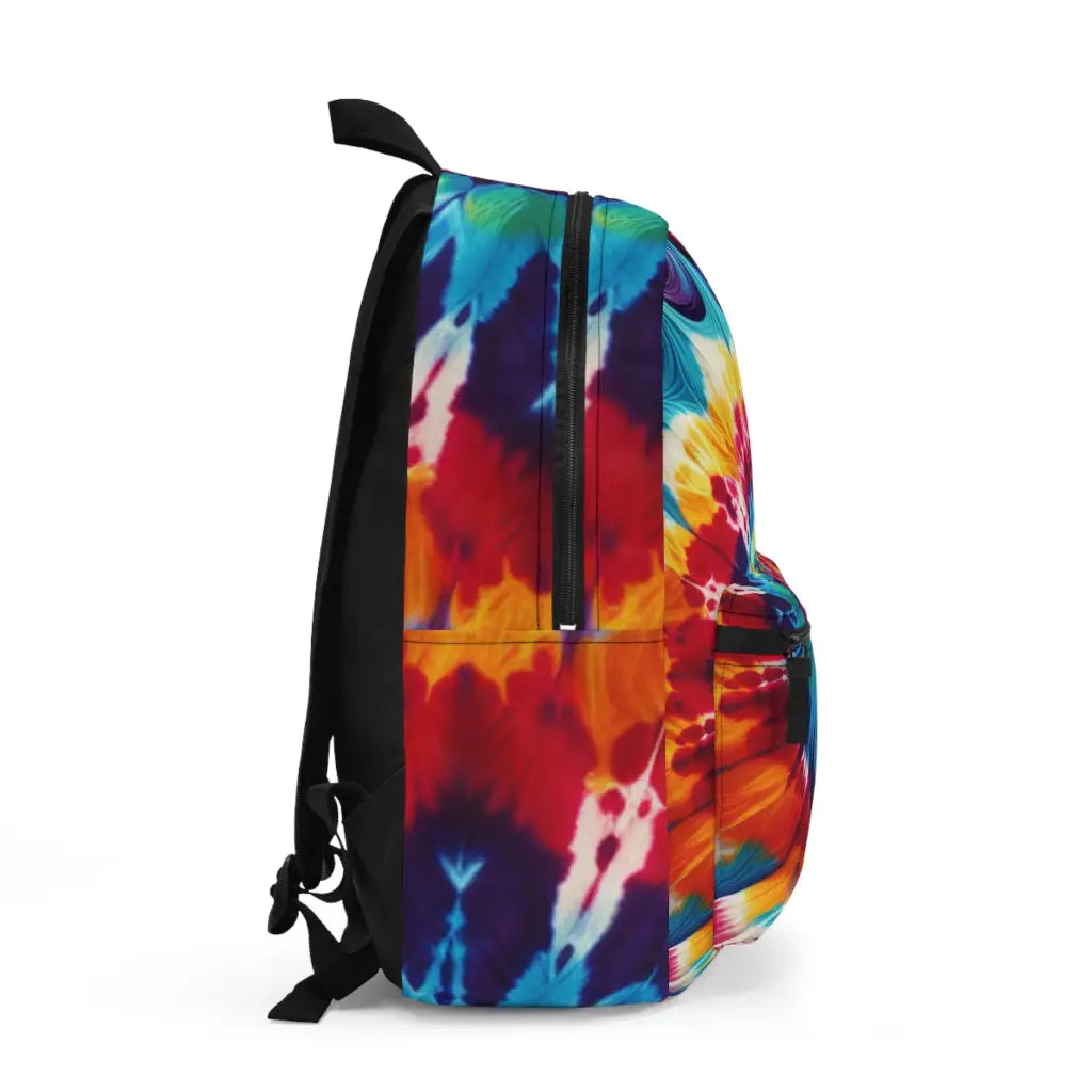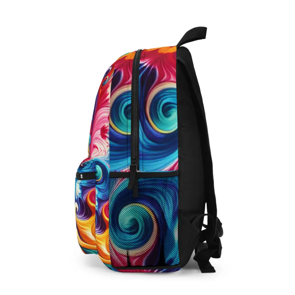 The image displays a vibrant psychedelic swirl with a rich spectrum of colors radiating from a central point, creating a mesmerizing tie-dye effect with flowing, intricate patterns reminiscent of organic textures. Introducing the ultimate backpack for fashion-forward adventurers! Our backpack boasts a striking textile design that will make a statement wherever you go. With its durable construction and spacious compartments, it is perfect for carrying all your essentials. Get ready to turn heads and stay organized with our backpack. #textiledesign #backpack #fashionforward #adventure #durable #spacious #statementpiece #organized #essentials #travel #explore