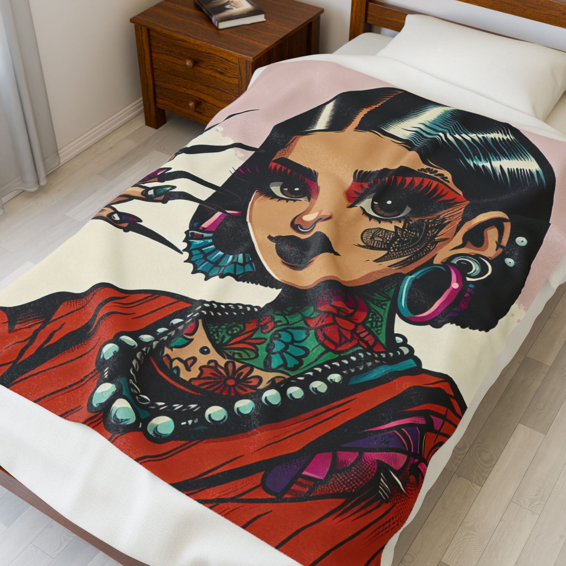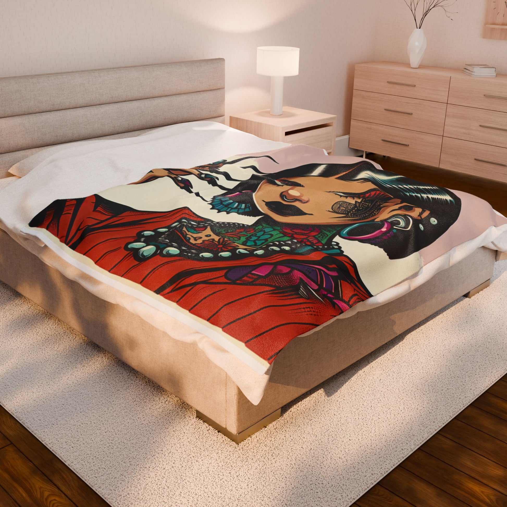 This vibrant artwork blends comic book style with a punk aesthetic. Featuring bold tattoos, striking eye makeup, and an edgy hairstyle, the character's intricate jewelry and long, pointed nails add dynamism and flair, creating a captivating and rebellious visual statement. Create a cozy and warm atmosphere at home with this plush velveteen blanket. It is soft to touch and perfect for any home. Customize with a one-sided print to add your personal touch or create a gift for your friends and family. Available in three sizes: 30x40", 50x60", 60x80".