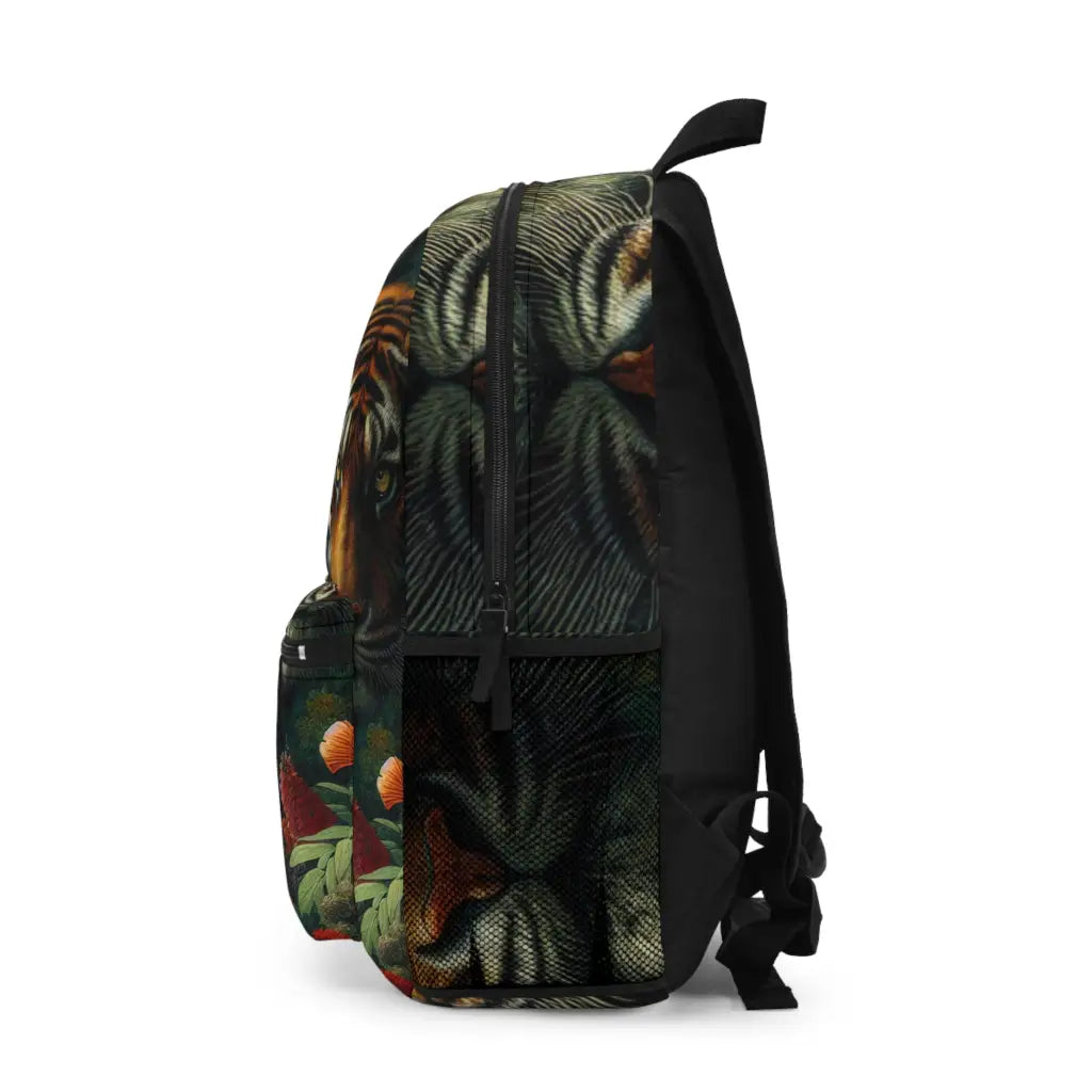 A majestic tiger emerges from lush jungle foliage, its piercing gaze framed by vibrant flowers. The vivid colors and intricate details create a striking contrast between the wild predator and the serene beauty of nature, capturing an essence of mysterious vitality. Introducing the ultimate backpack for fashion-forward adventurers! Our backpack boasts a striking textile design that will make a statement wherever you go. With its durable construction and spacious compartments, it is perfect for carrying all your essentials. Get ready to turn heads and stay organized with our backpack. #textiledesign #backpack #fashionforward #adventure #durable #spacious #statementpiece #organized #essentials #travel #explore
