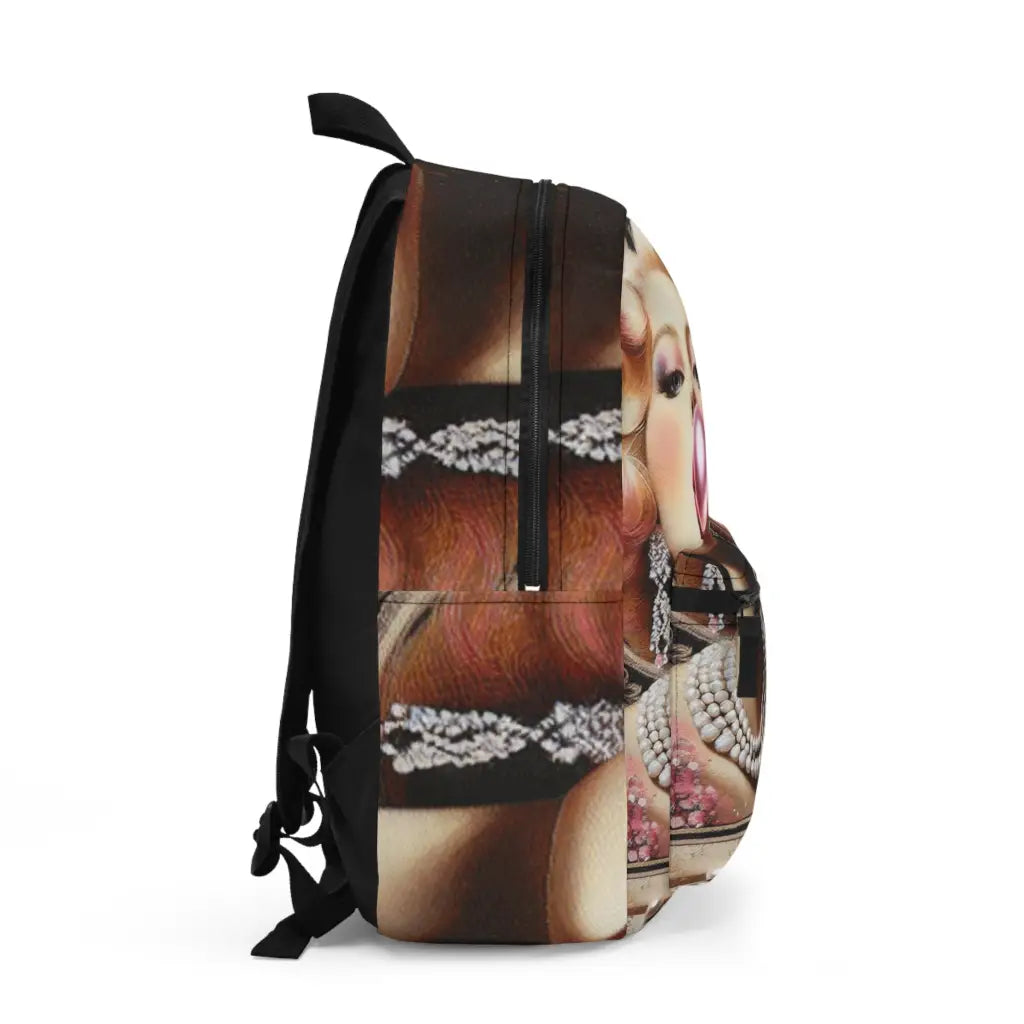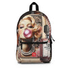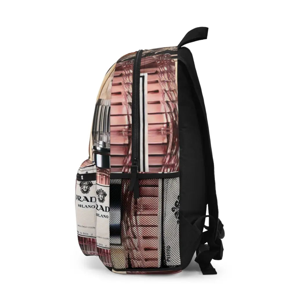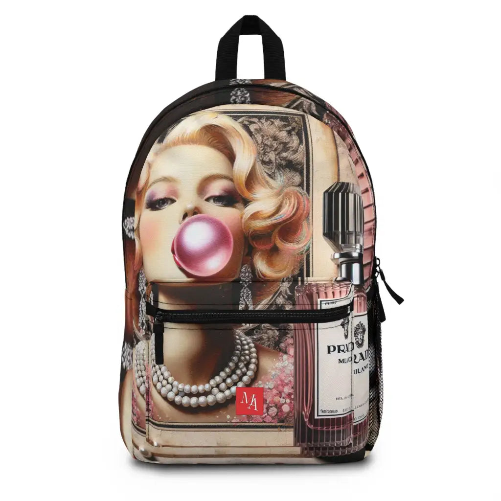 A vintage-inspired artistic fusion, featuring a glamorous woman in a Prada perfume bottle, blowing bubblegum. The pink backdrop enhances the bold, retro aesthetic, blending pop art with luxury fashion elements for a chic, innovative visual. Introducing the ultimate backpack for fashion-forward adventurers! Our backpack boasts a striking textile design that will make a statement wherever you go. With its durable construction and spacious compartments, it is perfect for carrying all your essentials. Get ready to turn heads and stay organized with our backpack. #textiledesign #backpack #fashionforward #adventure #durable #spacious #statementpiece #organized #essentials #travel #explore