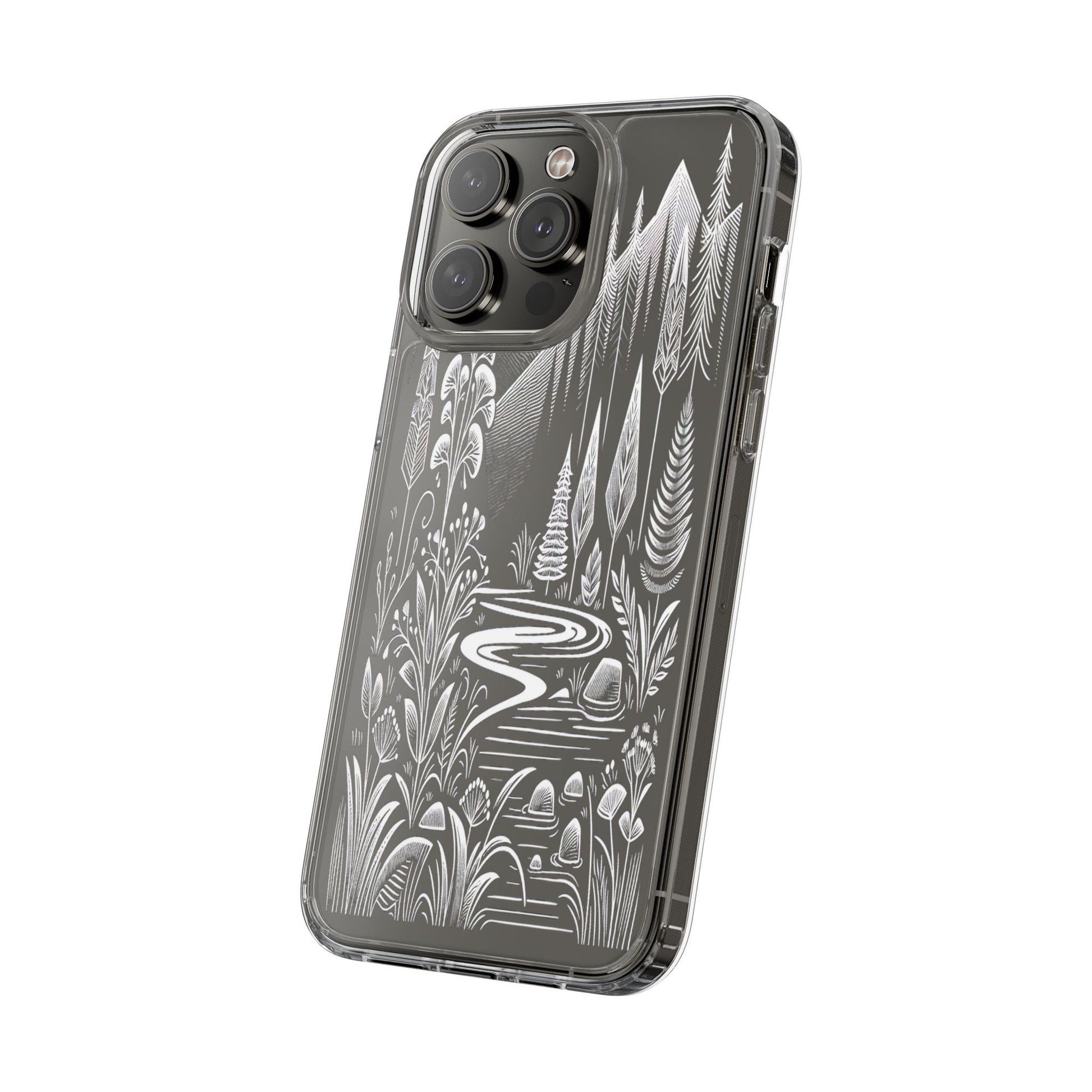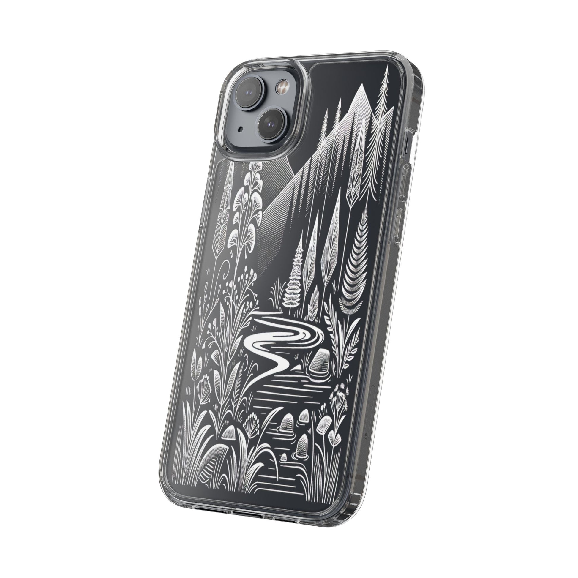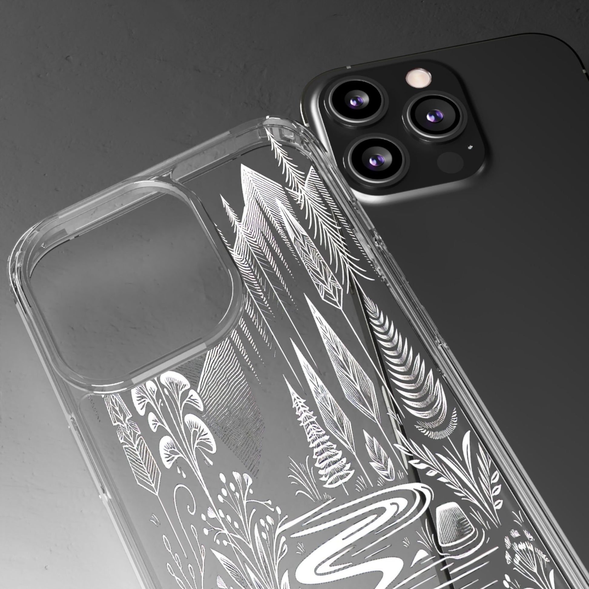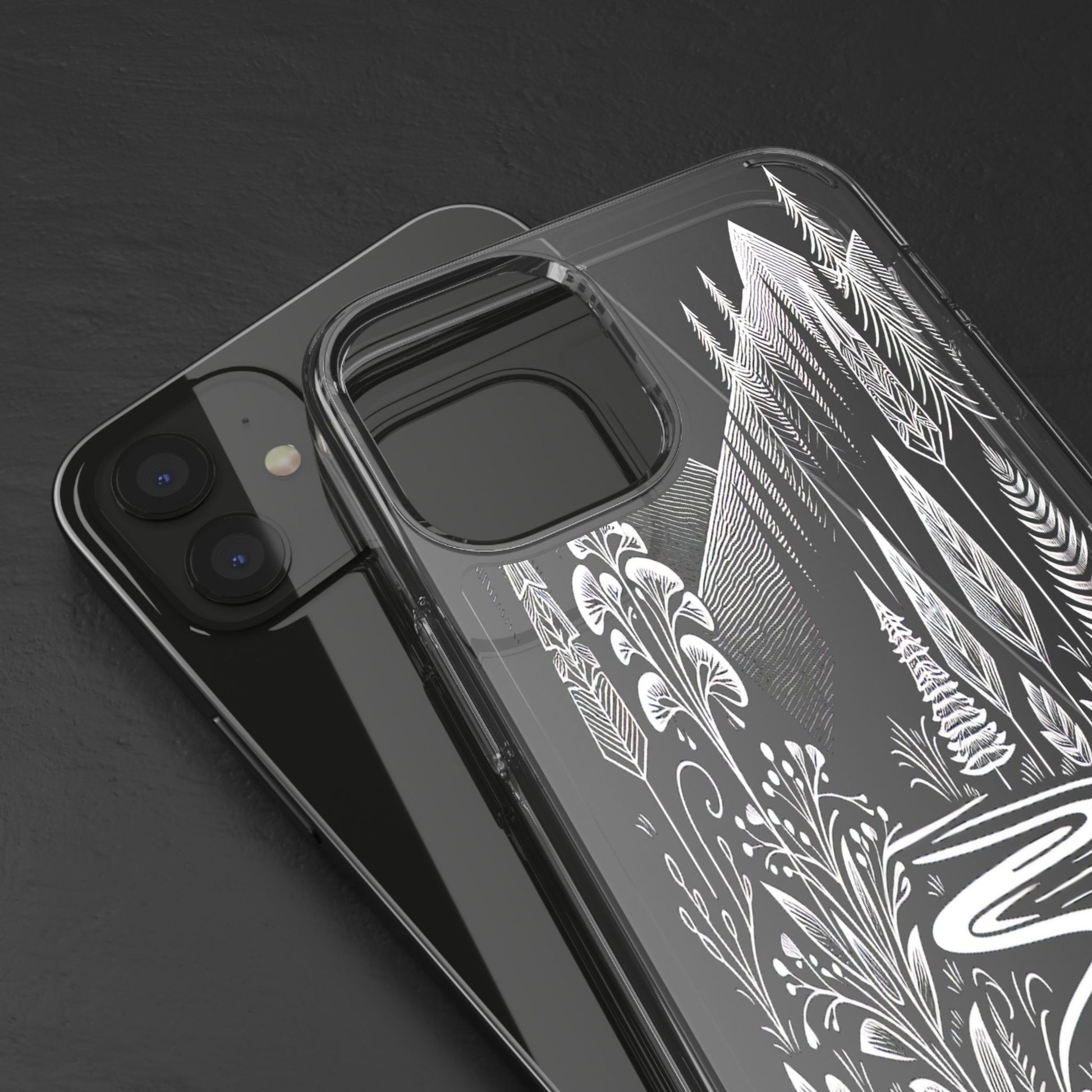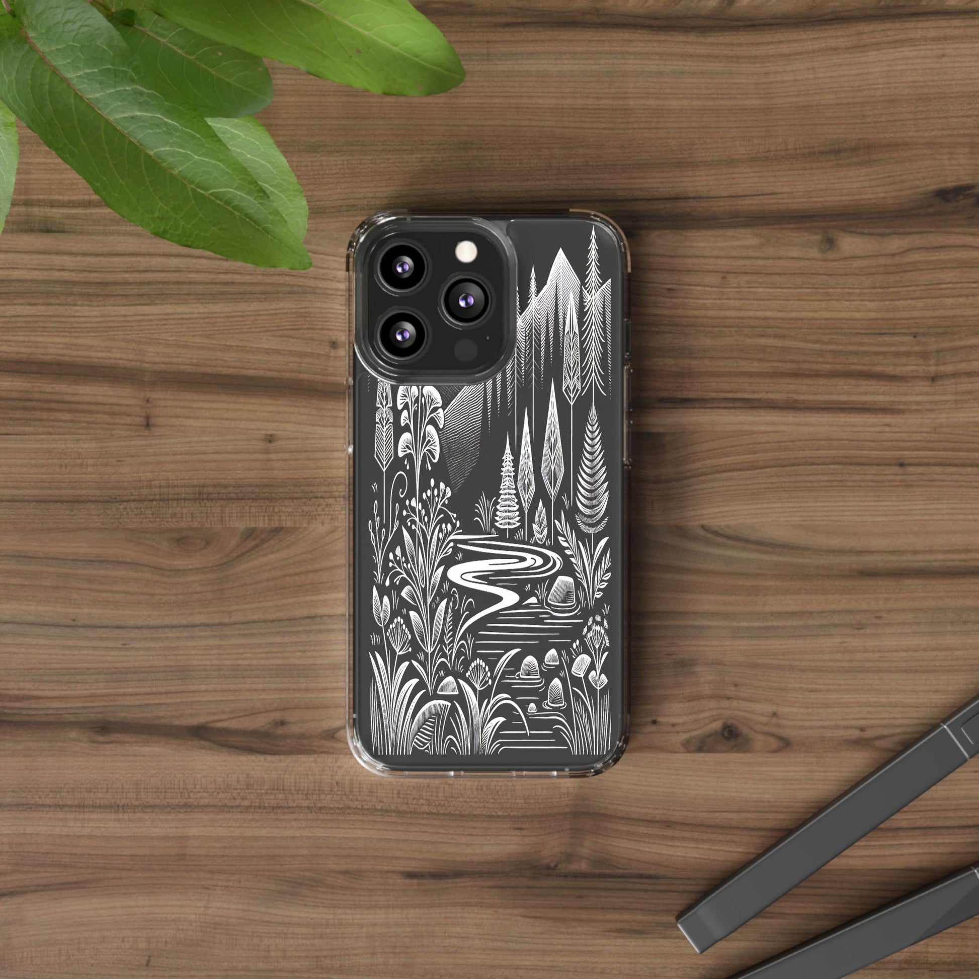 Stylized black-and-white nature drawing with intricate, line-based details. Featuring towering mountains, diverse trees, and flowing river, it blends geometric precision with organic beauty, creating a harmonious, textured landscape. Protect your phone while showcasing its sleek design with our customizable clear phone case, designed to fit iPhones from the latest iPhone 16 to earlier models like iPhone XR, XS, and X. This slim and lightweight case is perfect for guarding against daily wear and tear, offering shock-absorbing and scratch-resistant protection.