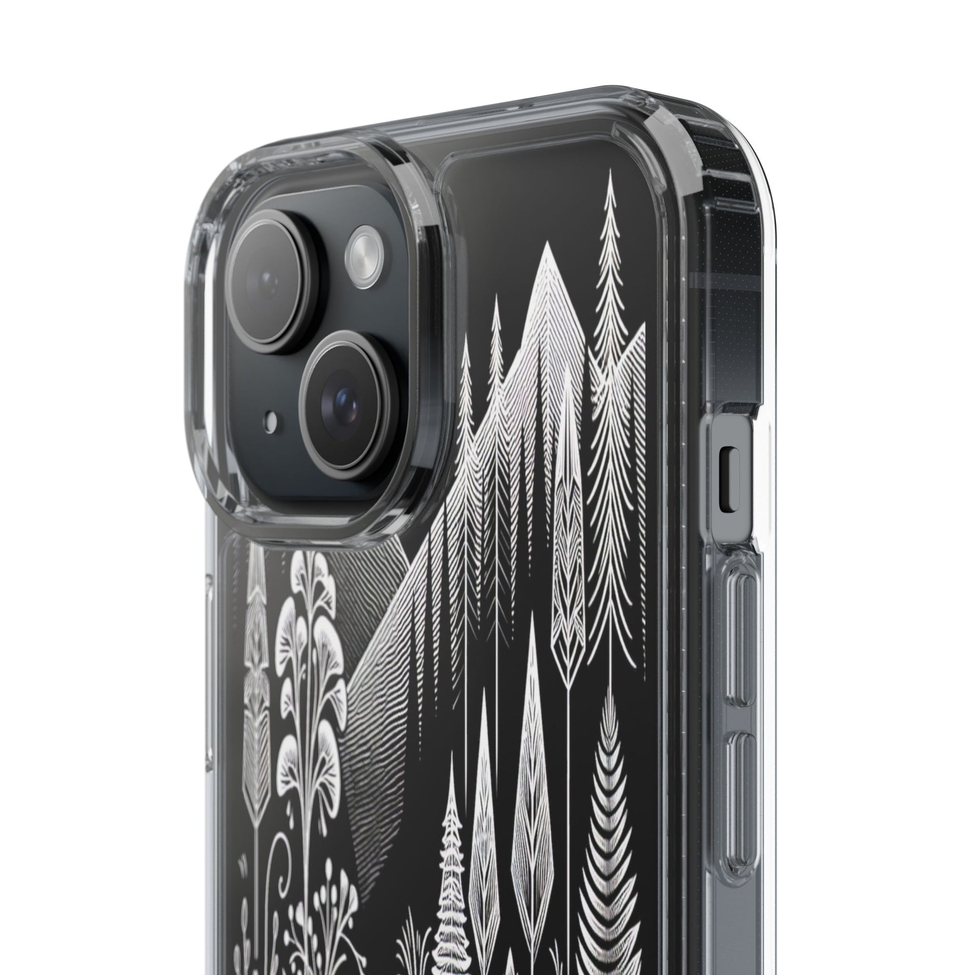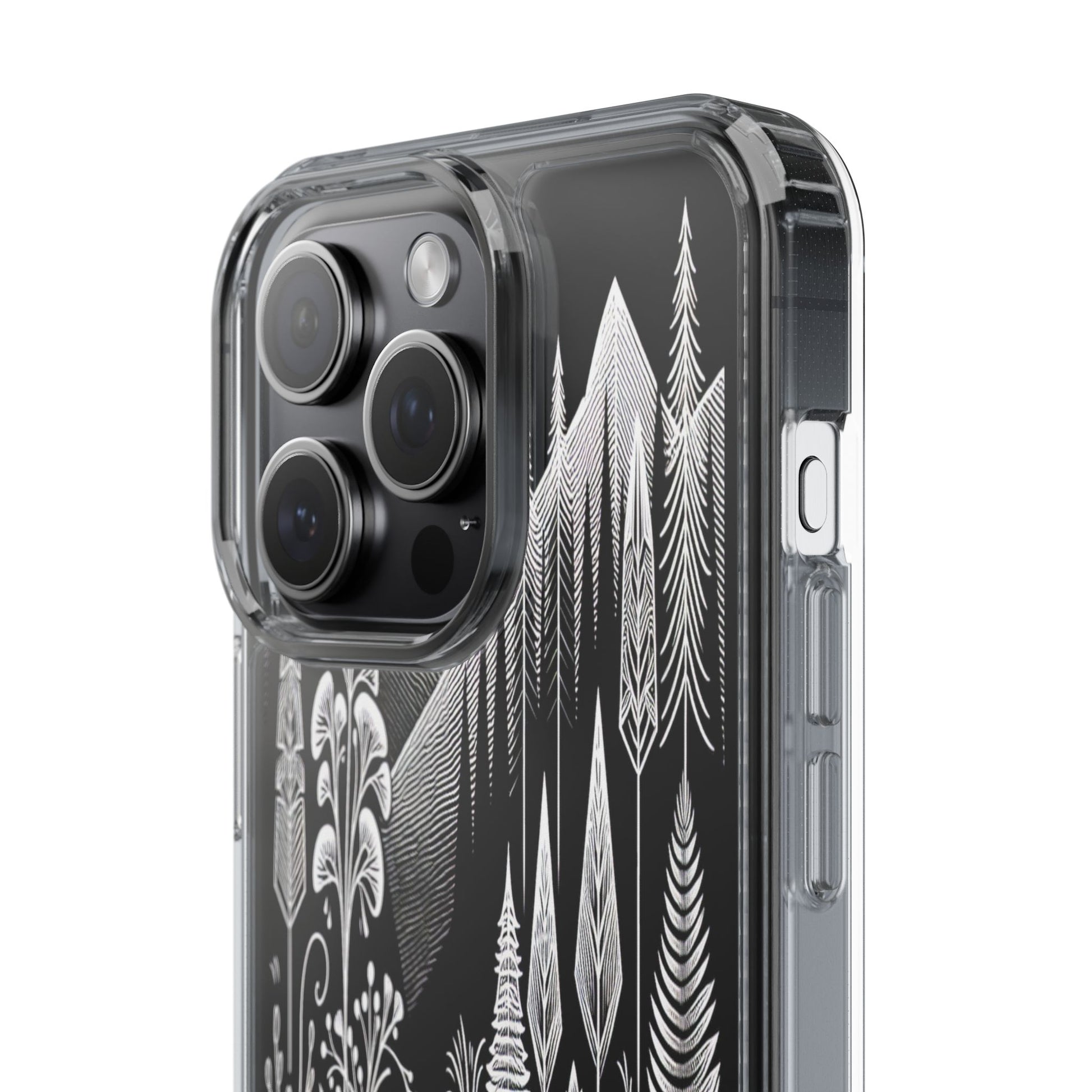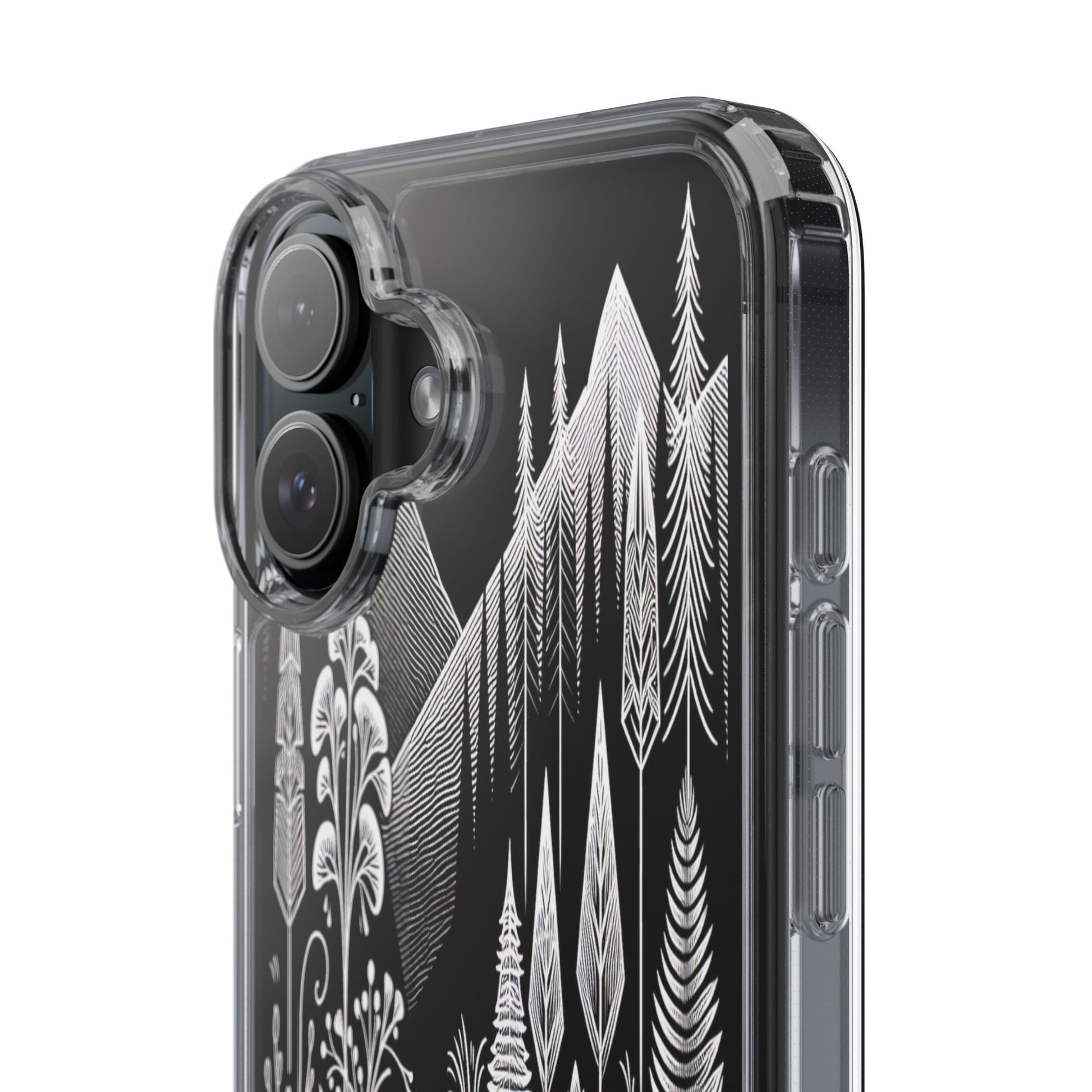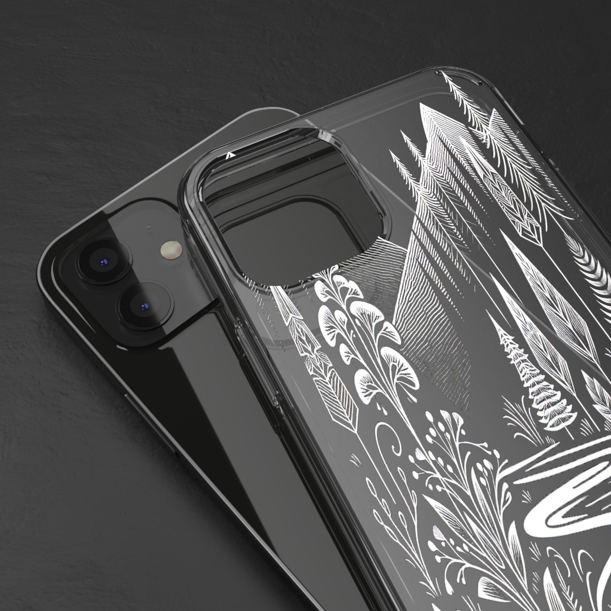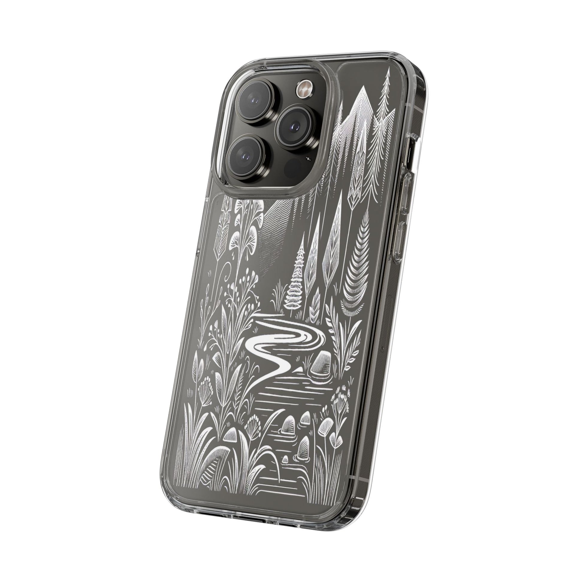 Stylized black-and-white nature drawing with intricate, line-based details. Featuring towering mountains, diverse trees, and flowing river, it blends geometric precision with organic beauty, creating a harmonious, textured landscape. Protect your phone while showcasing its sleek design with our customizable clear phone case, designed to fit iPhones from the latest iPhone 16 to earlier models like iPhone XR, XS, and X. This slim and lightweight case is perfect for guarding against daily wear and tear, offering shock-absorbing and scratch-resistant protection.