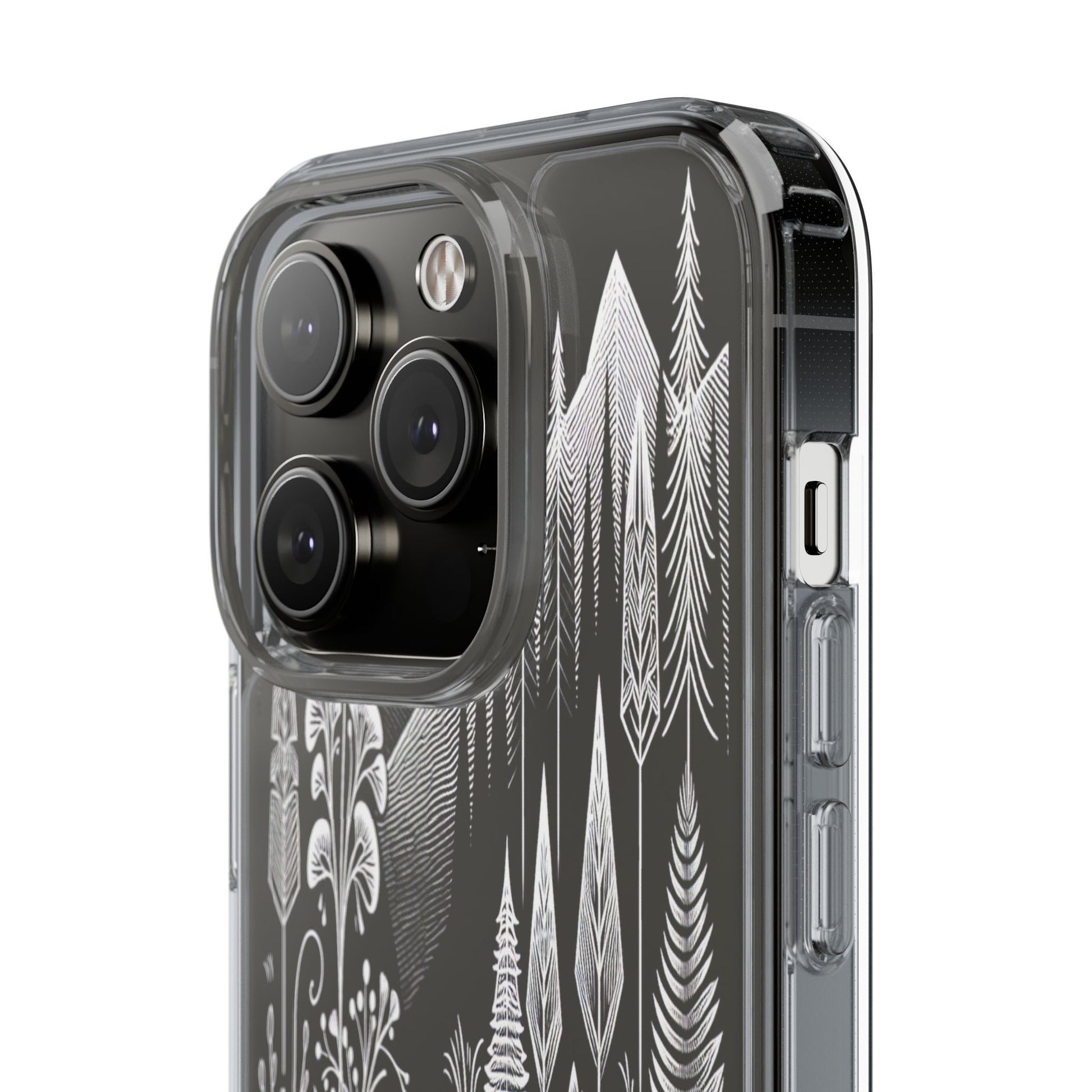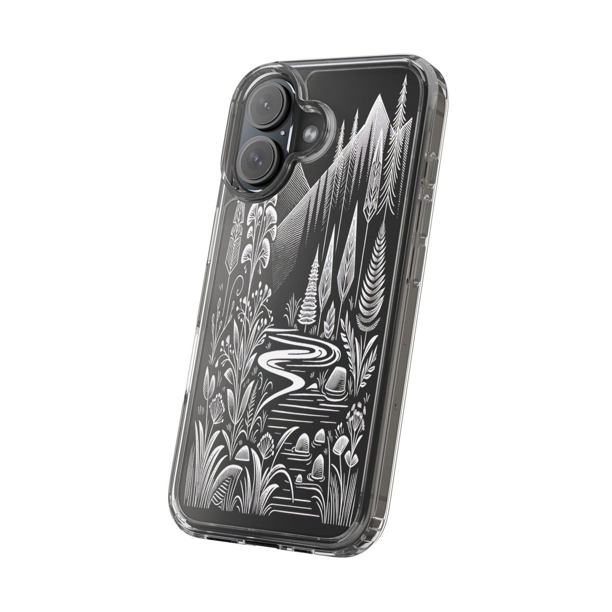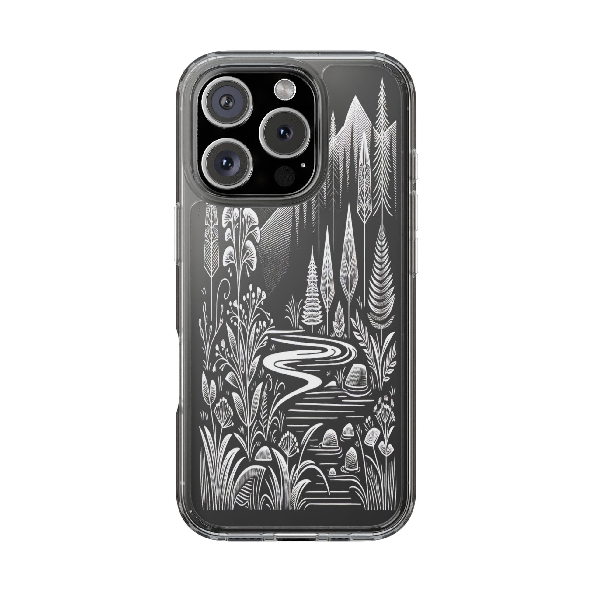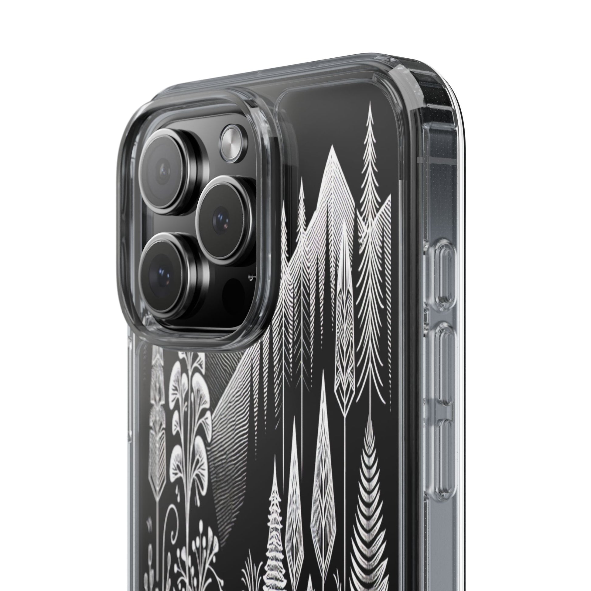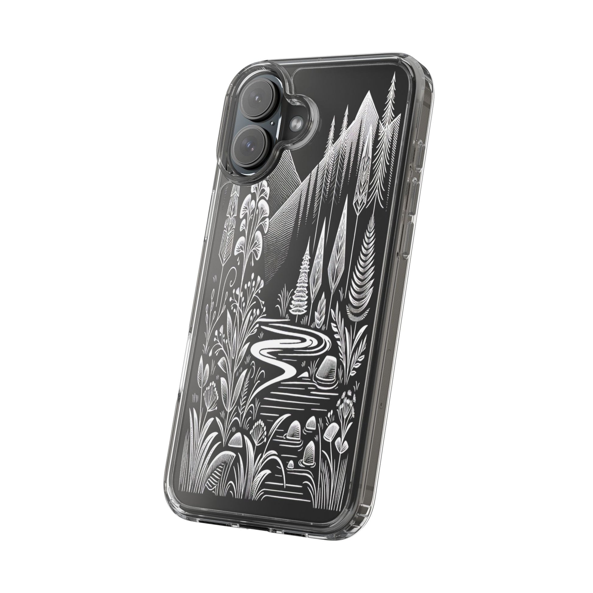 Stylized black-and-white nature drawing with intricate, line-based details. Featuring towering mountains, diverse trees, and flowing river, it blends geometric precision with organic beauty, creating a harmonious, textured landscape. Protect your phone while showcasing its sleek design with our customizable clear phone case, designed to fit iPhones from the latest iPhone 16 to earlier models like iPhone XR, XS, and X. This slim and lightweight case is perfect for guarding against daily wear and tear, offering shock-absorbing and scratch-resistant protection.