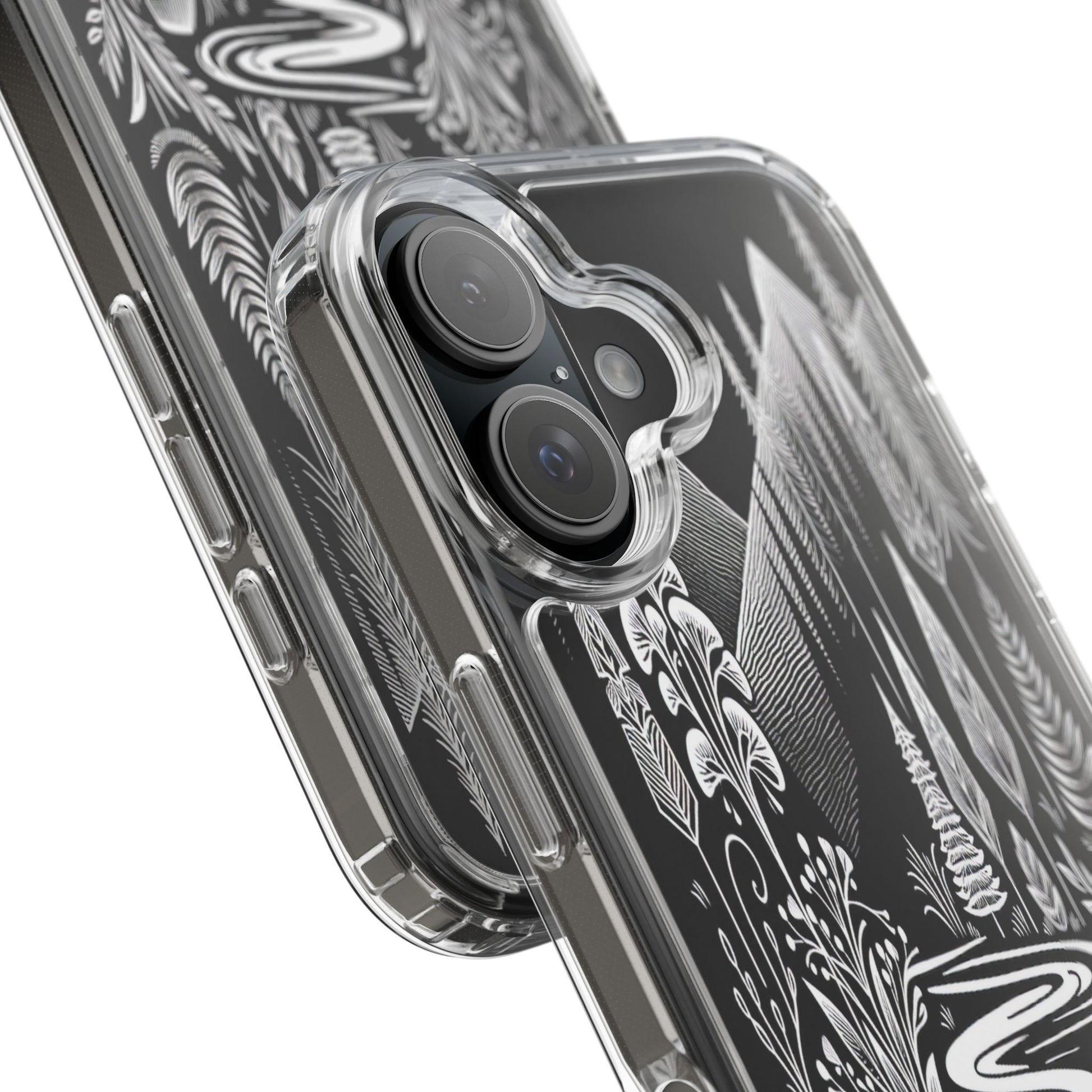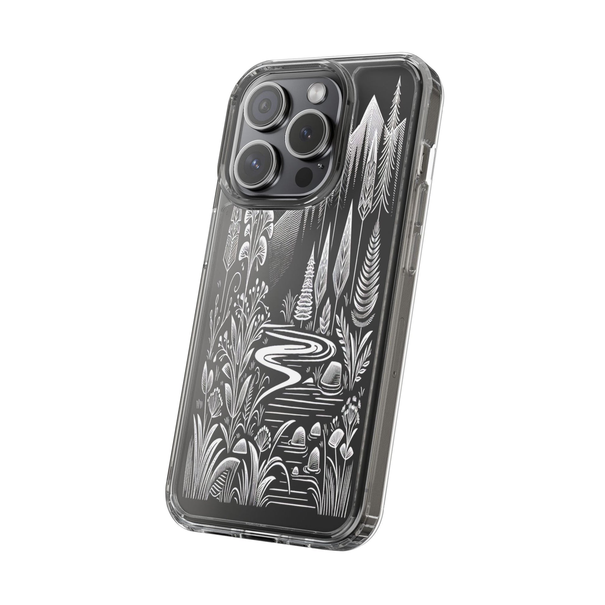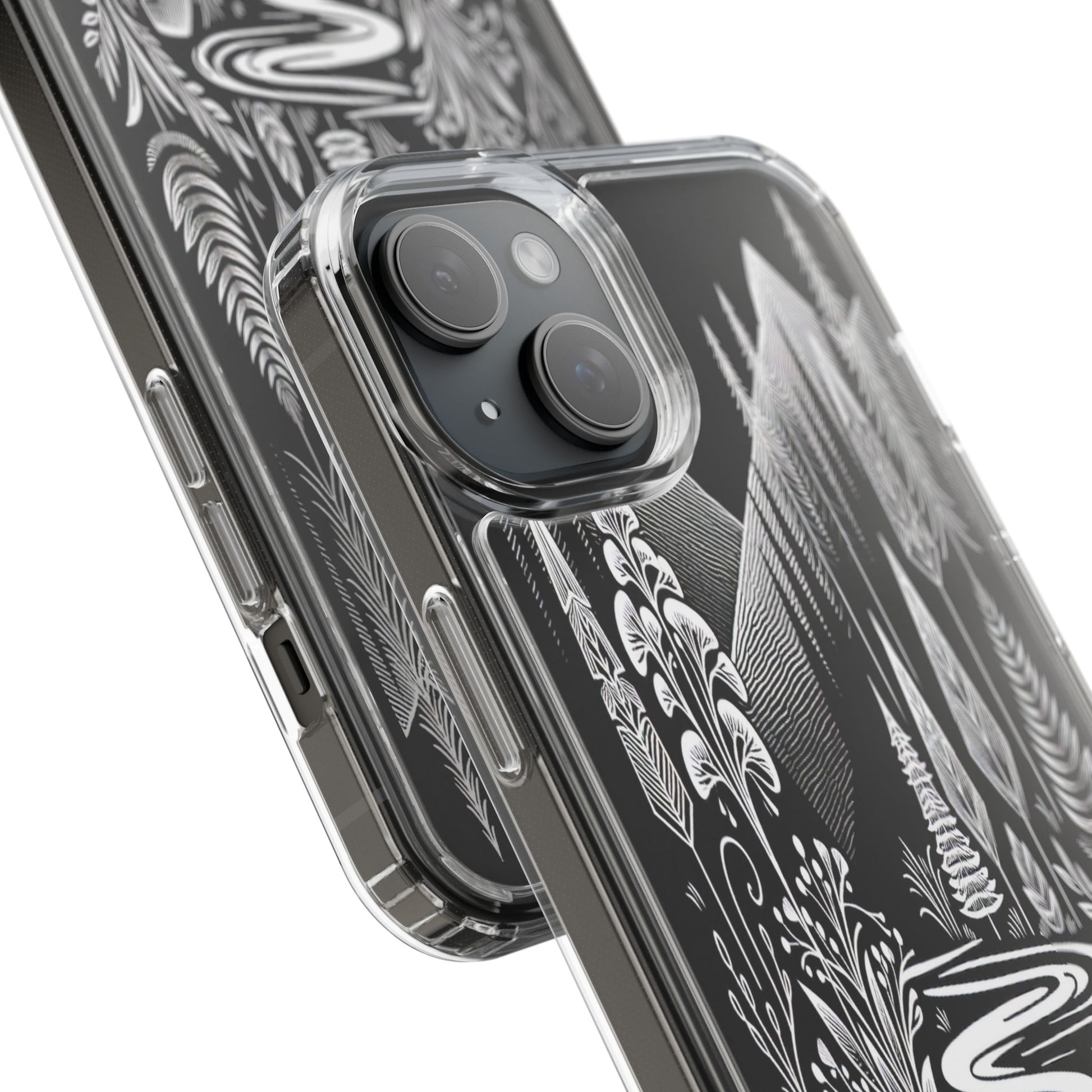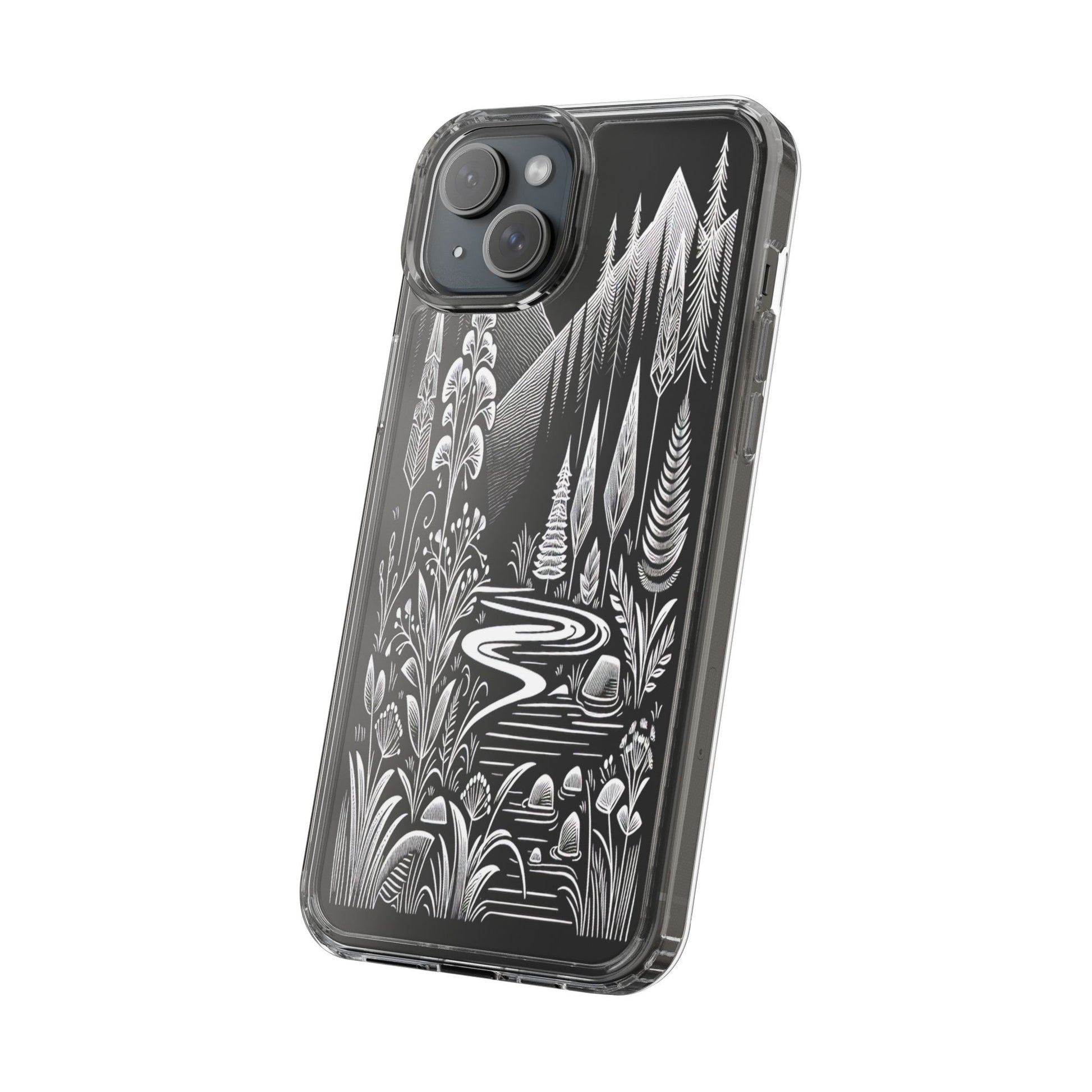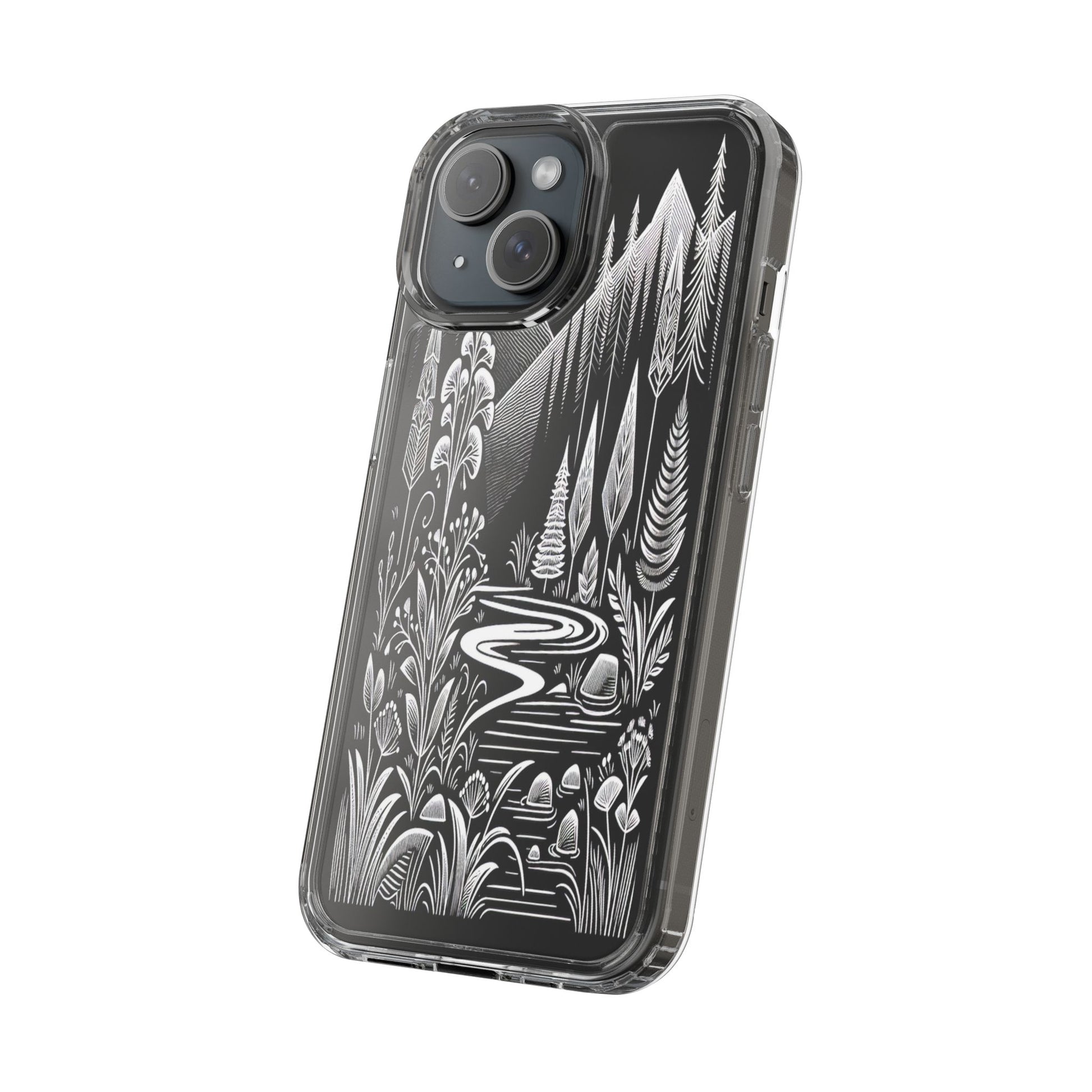 Stylized black-and-white nature drawing with intricate, line-based details. Featuring towering mountains, diverse trees, and flowing river, it blends geometric precision with organic beauty, creating a harmonious, textured landscape. Protect your phone while showcasing its sleek design with our customizable clear phone case, designed to fit iPhones from the latest iPhone 16 to earlier models like iPhone XR, XS, and X. This slim and lightweight case is perfect for guarding against daily wear and tear, offering shock-absorbing and scratch-resistant protection.