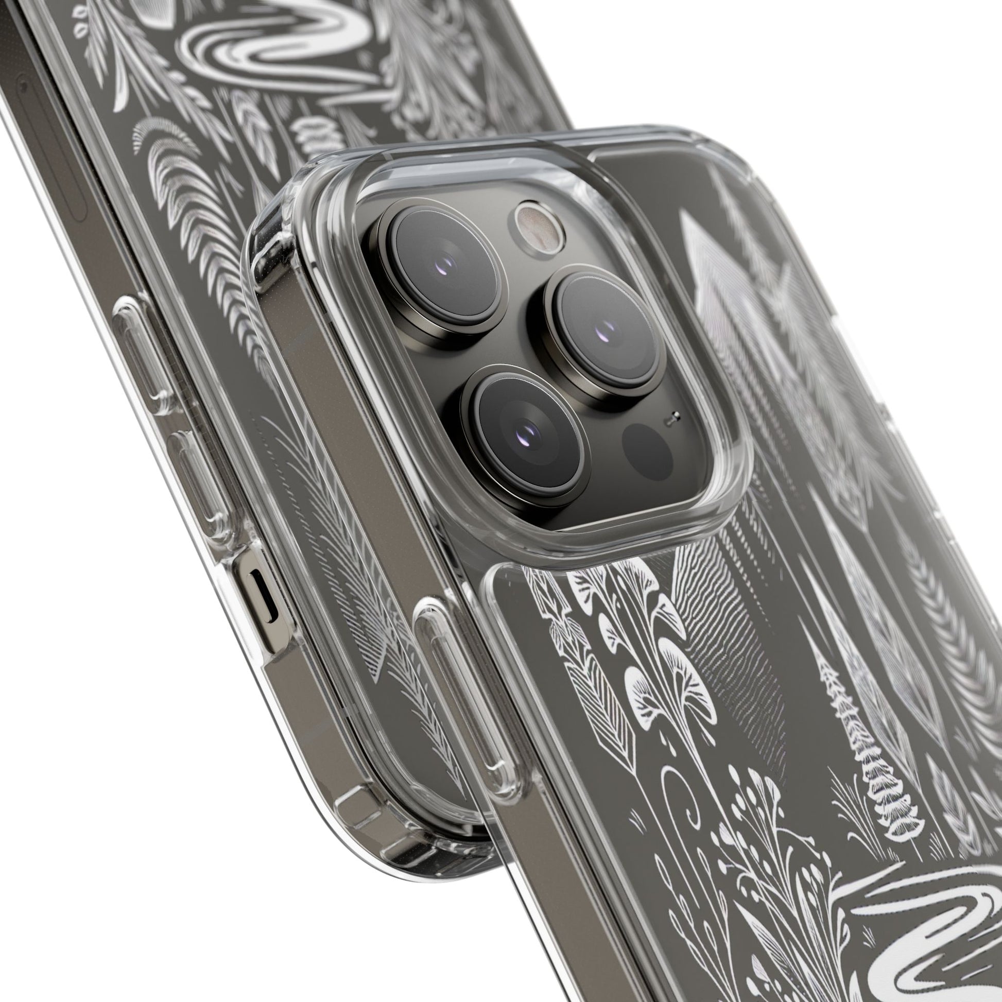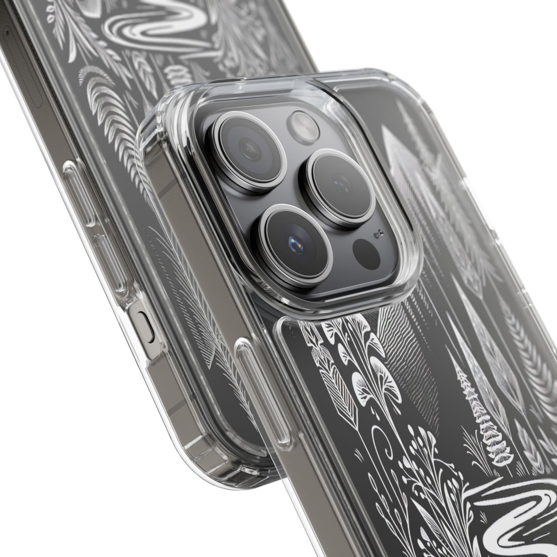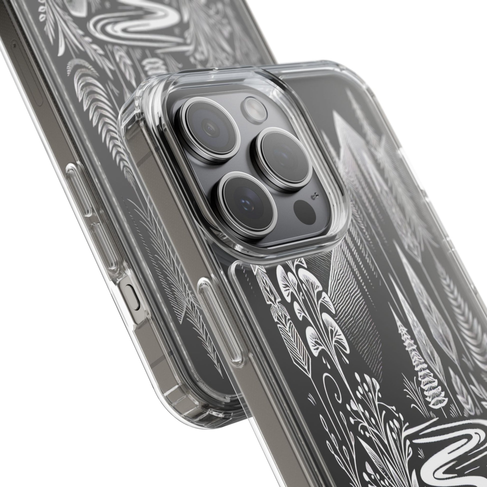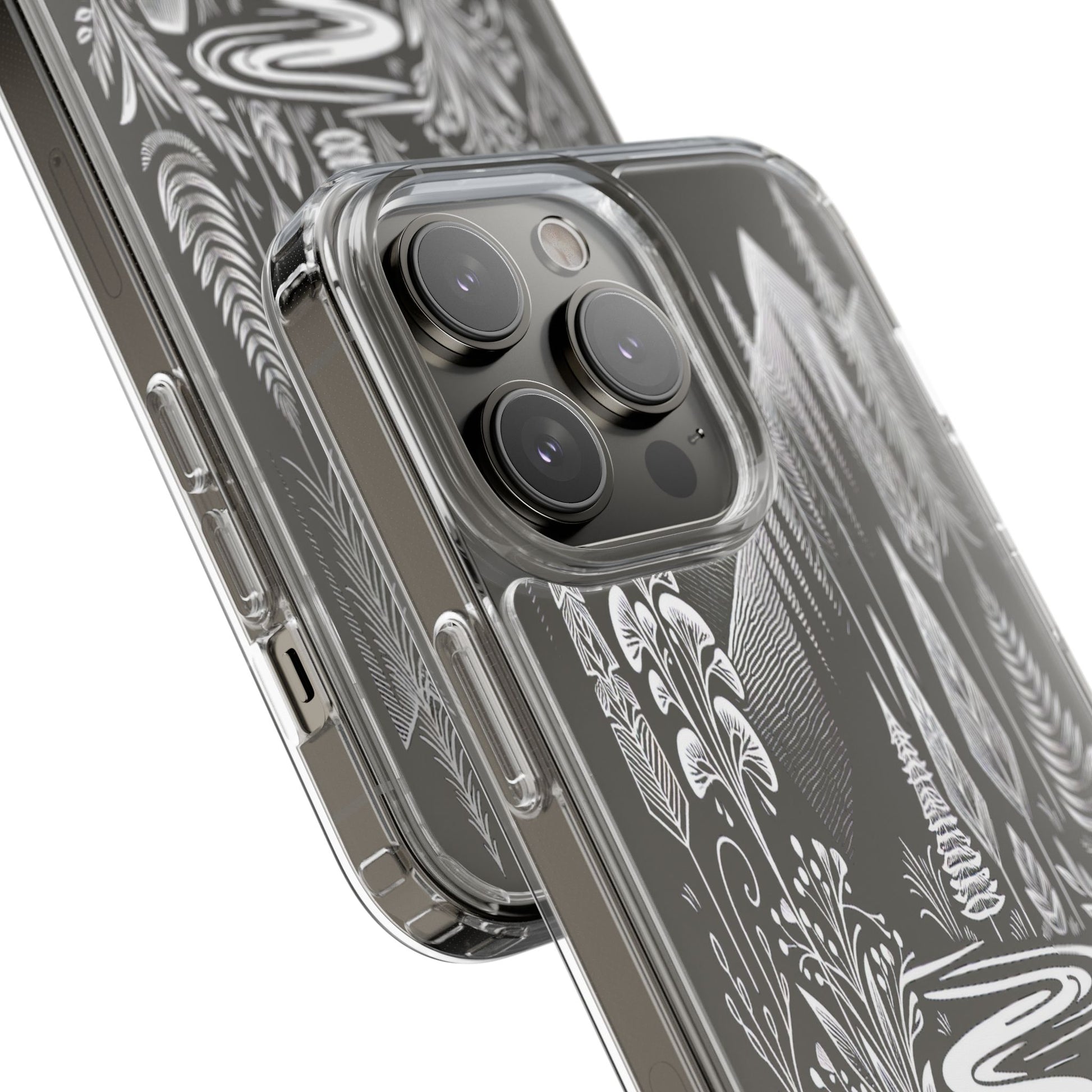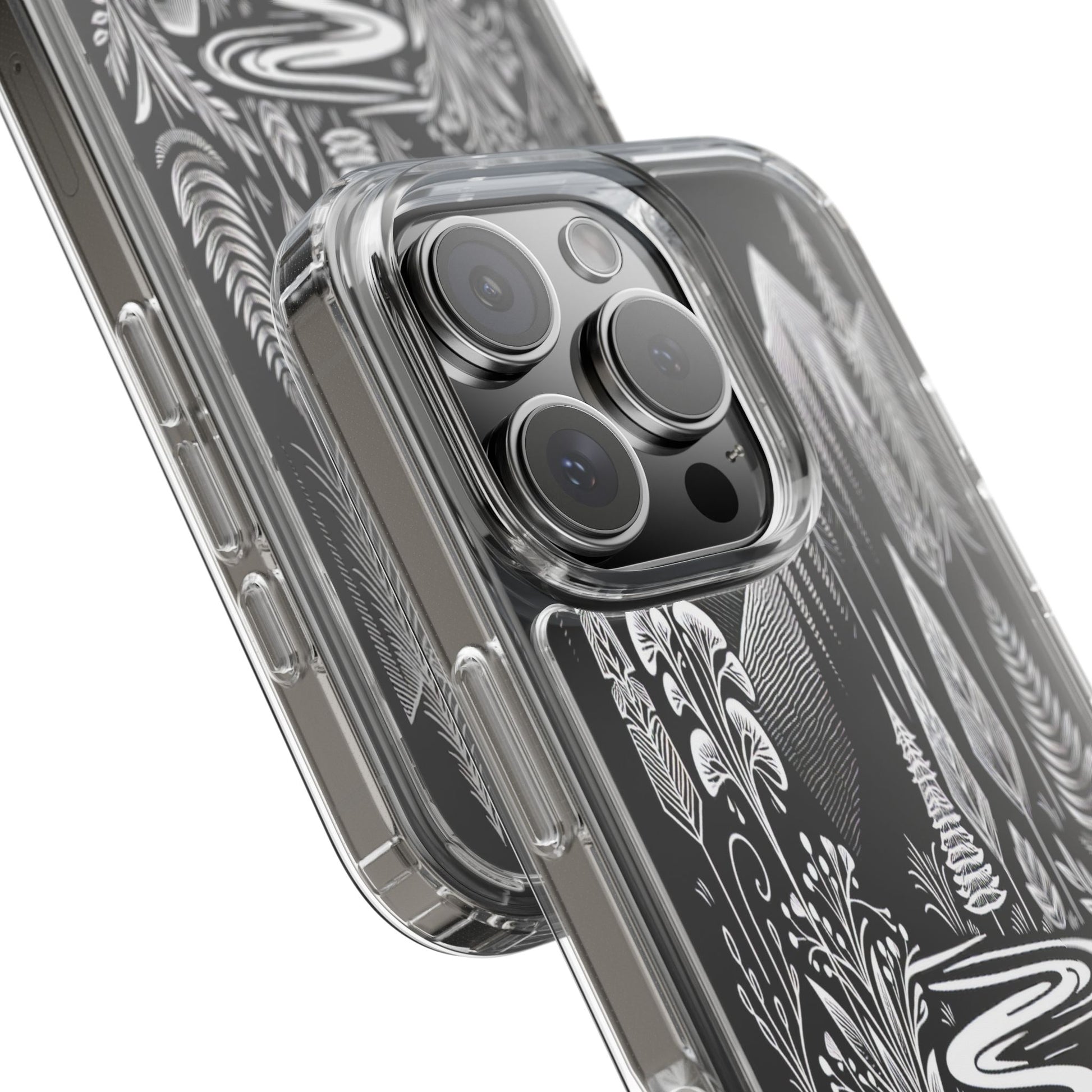 Stylized black-and-white nature drawing with intricate, line-based details. Featuring towering mountains, diverse trees, and flowing river, it blends geometric precision with organic beauty, creating a harmonious, textured landscape. Protect your phone while showcasing its sleek design with our customizable clear phone case, designed to fit iPhones from the latest iPhone 16 to earlier models like iPhone XR, XS, and X. This slim and lightweight case is perfect for guarding against daily wear and tear, offering shock-absorbing and scratch-resistant protection.
