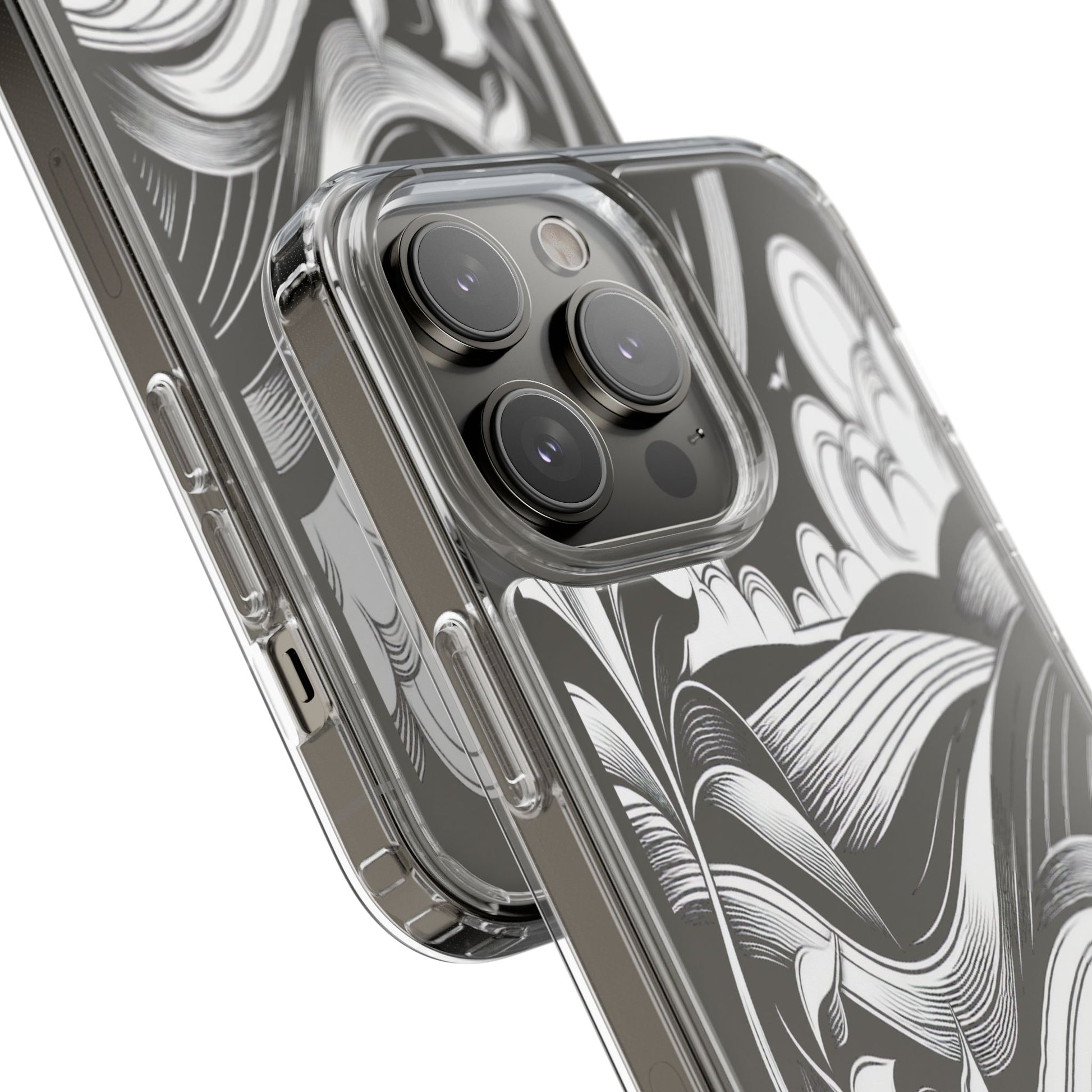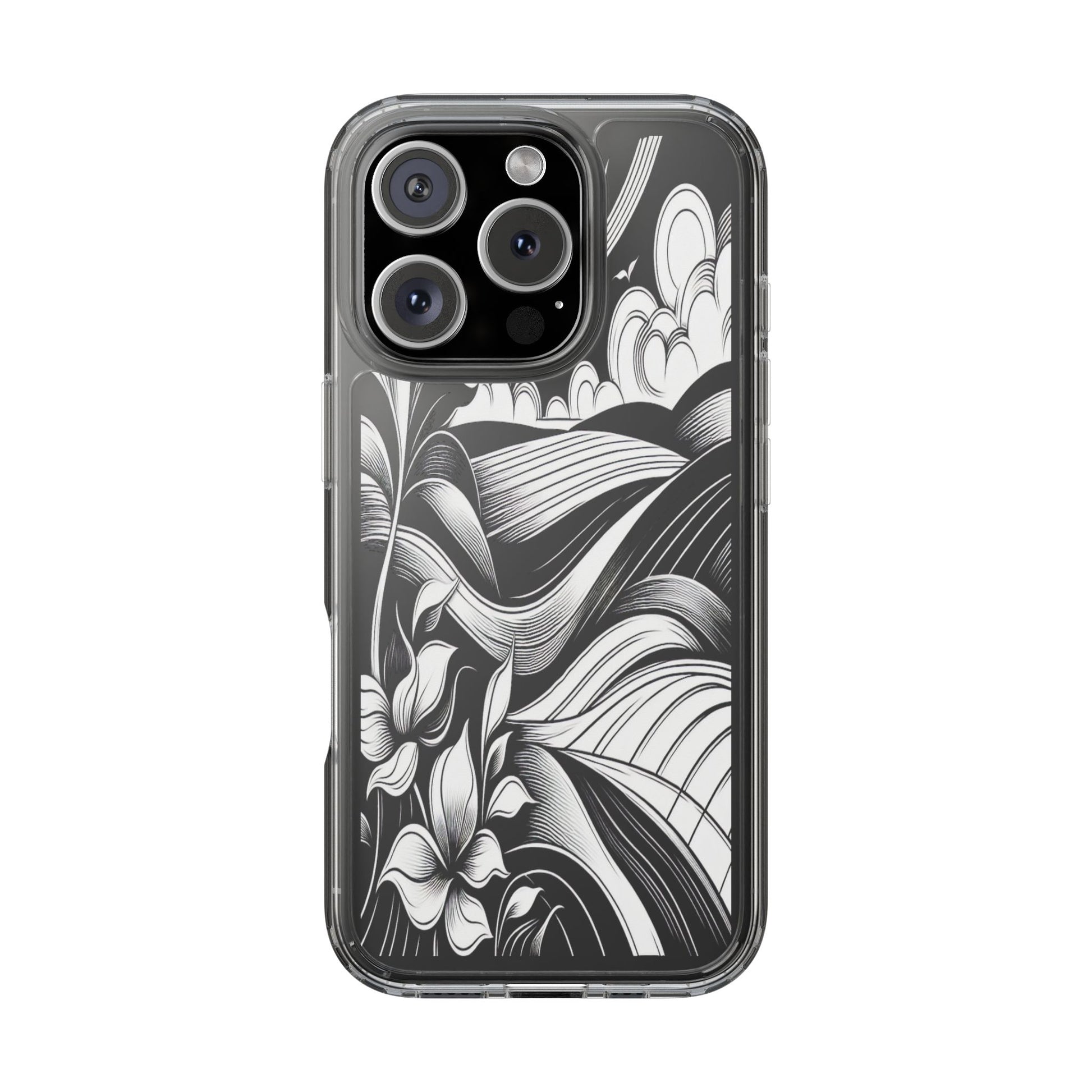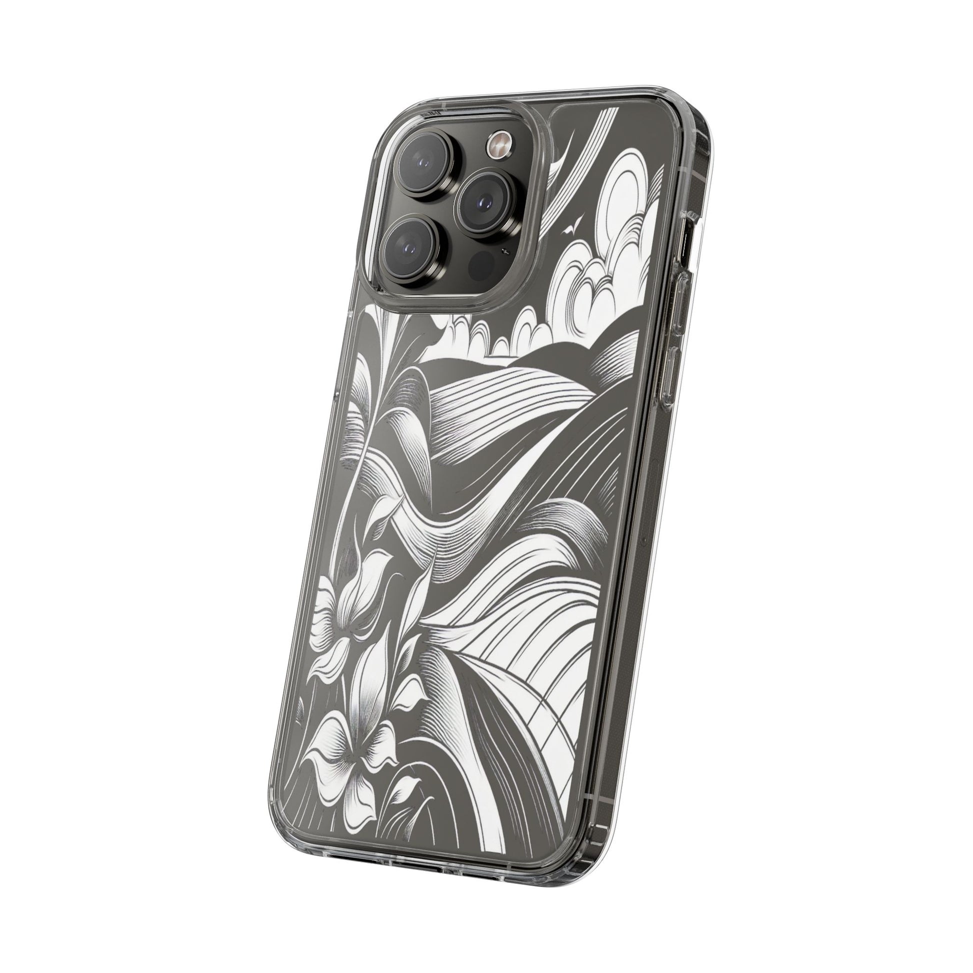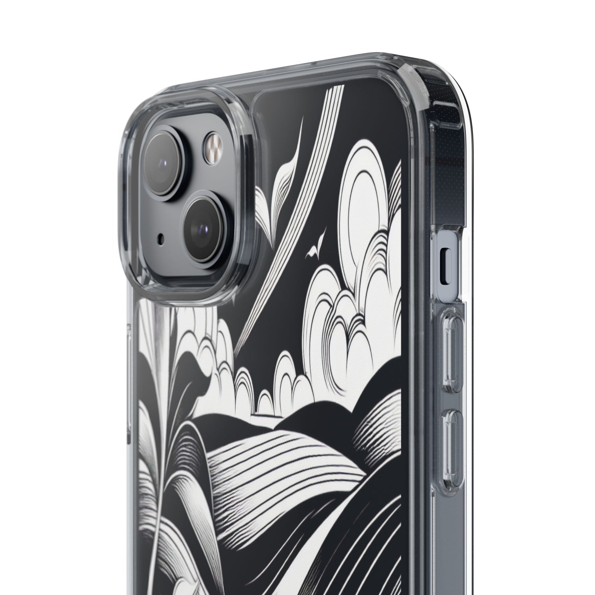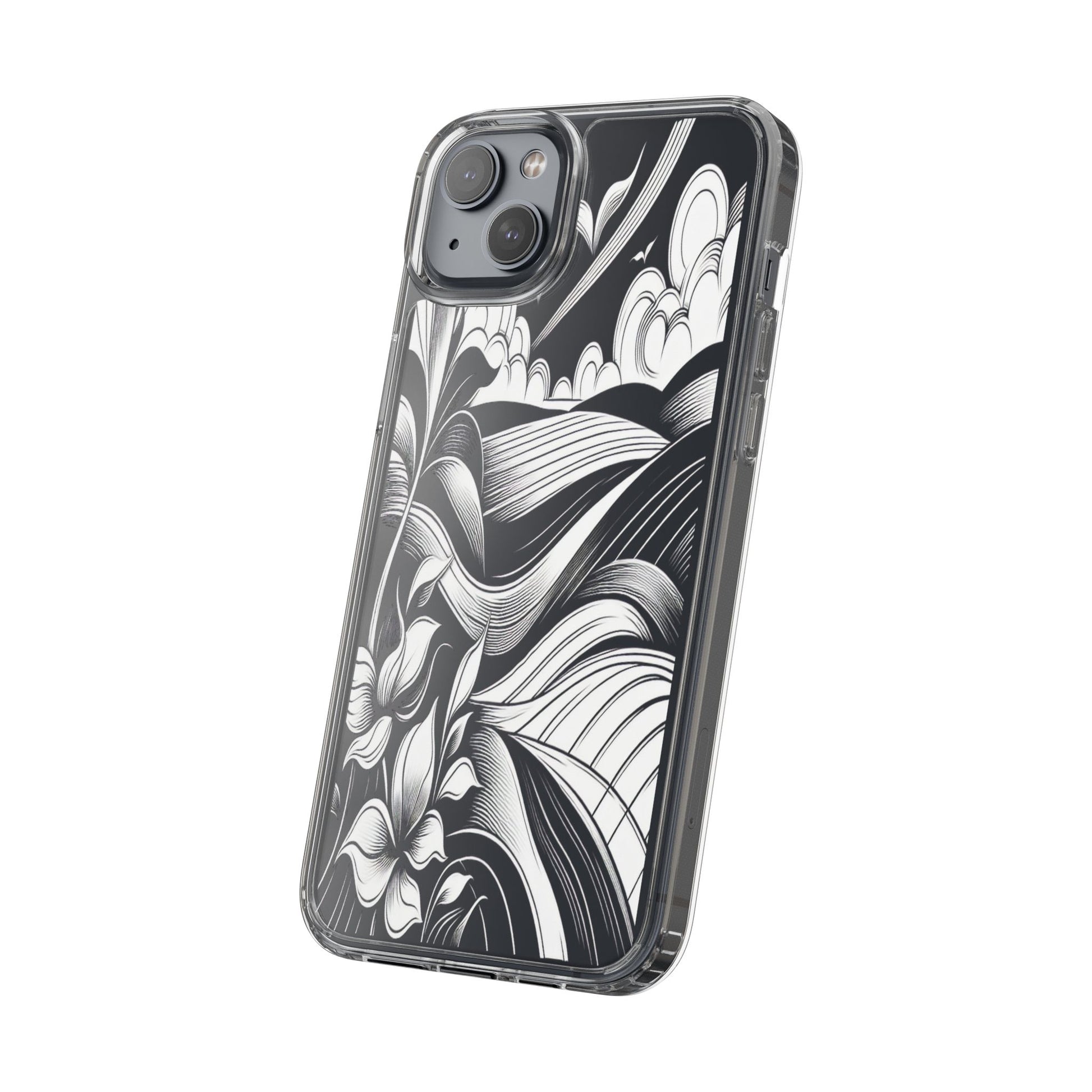 Elegant black-and-white illustration intertwining floral motifs with flowing, rhythmic lines. Clouds and birds add dynamic movement, creating a harmonious balance of nature and abstraction. Protect your phone while showcasing its sleek design with our customizable clear phone case, designed to fit iPhones from the latest iPhone 16 to earlier models like iPhone 15, 14, 13, and 12. This slim and lightweight case is perfect for guarding against daily wear and tear, offering shock-absorbing and scratch-resistant protection.
