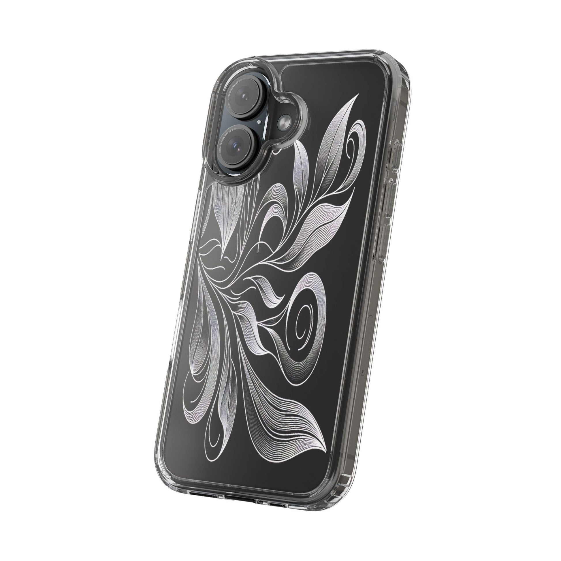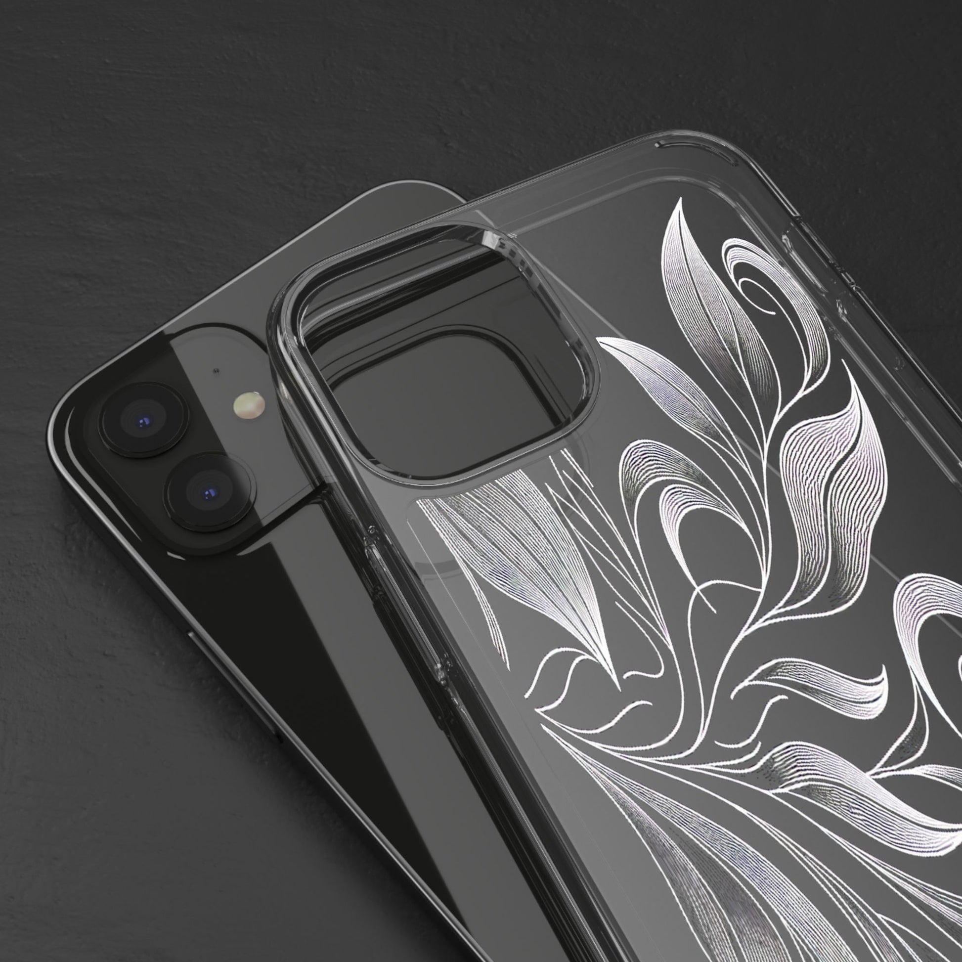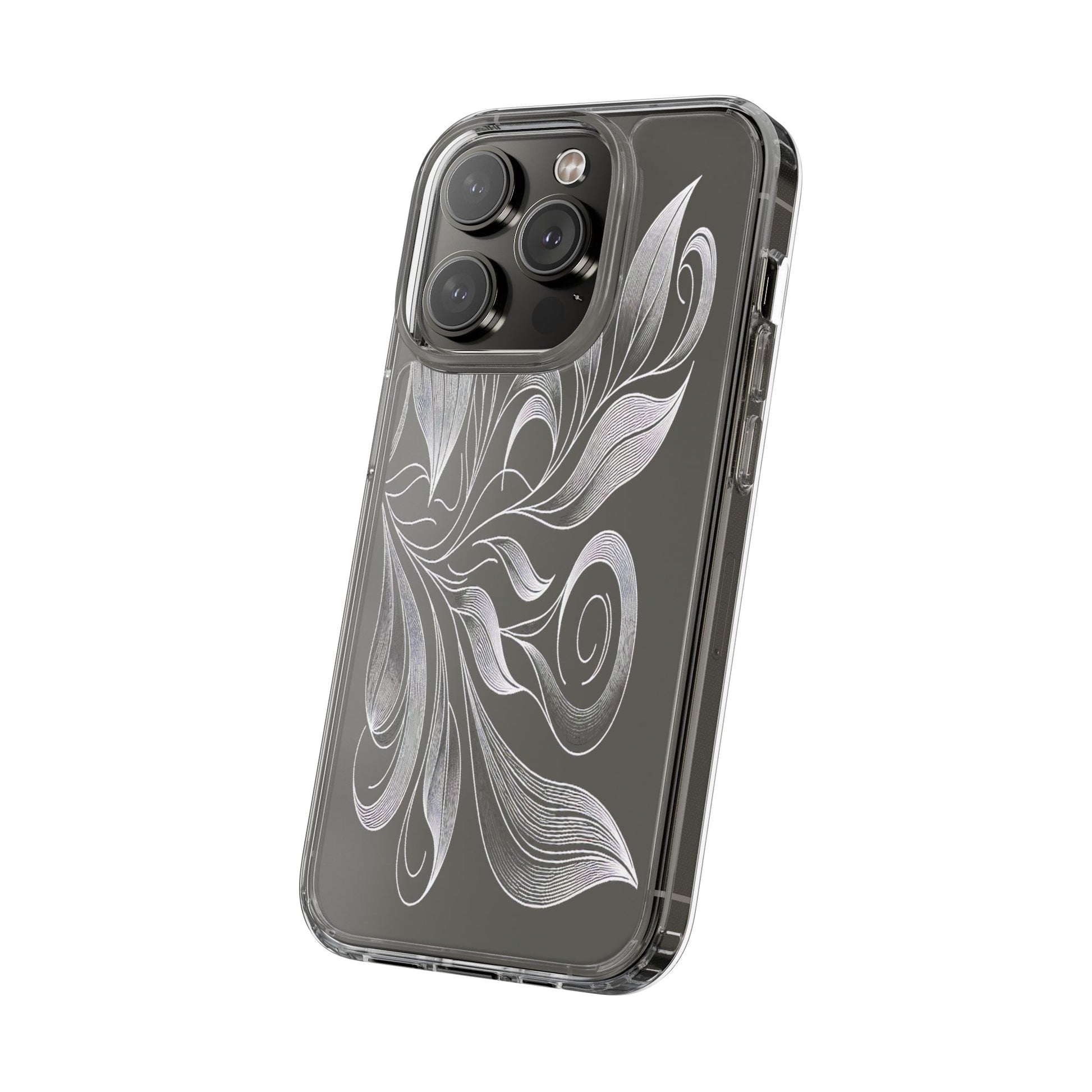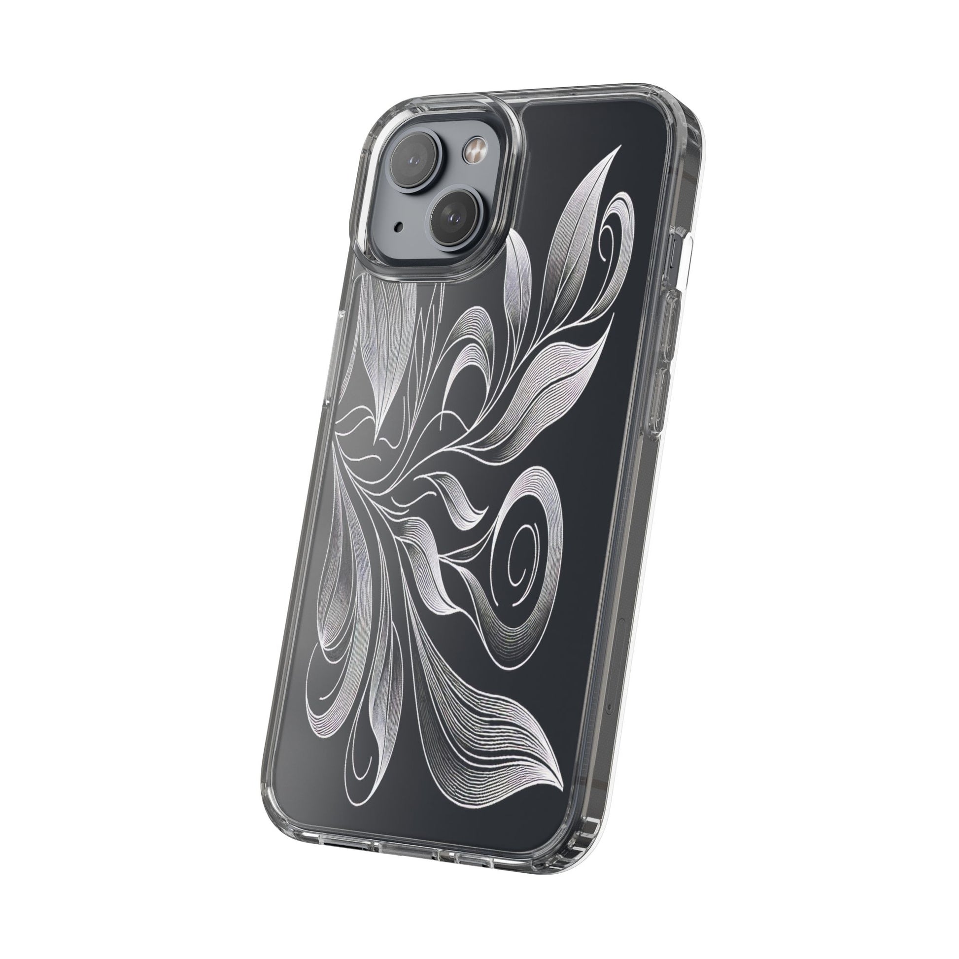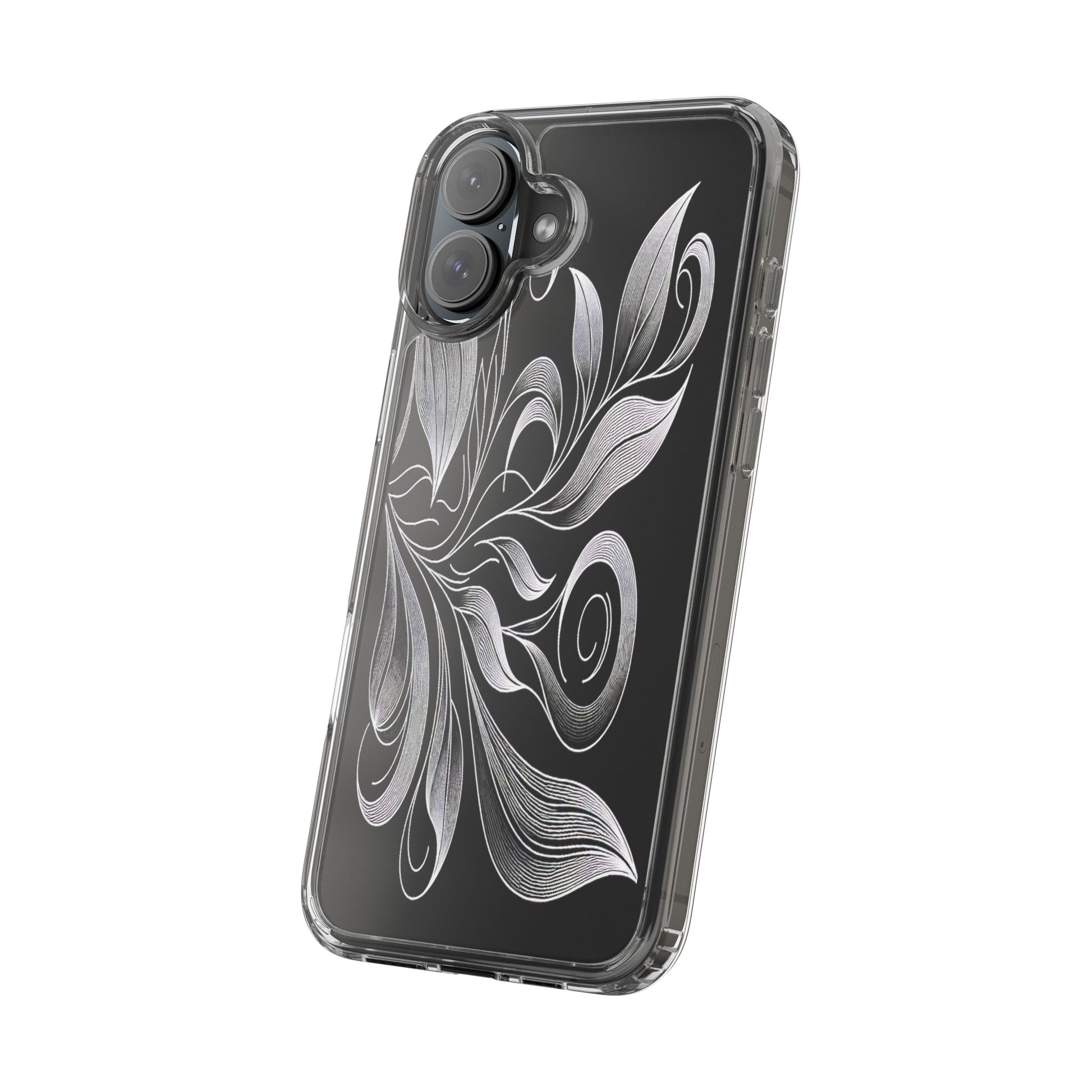 Intricate curving lines form elegant, abstract leaves and spirals on a black background. The delicate, white lines flow seamlessly, creating a dynamic and graceful pattern that evokes a sense of movement and artistic finesse. Protect your phone while showcasing its sleek design with our customizable clear phone case, designed to fit iPhones from the latest iPhone 16 to earlier models like iPhone XR, XS, and X. This slim and lightweight case is perfect for guarding against daily wear and tear, offering shock-absorbing and scratch-resistant protection.