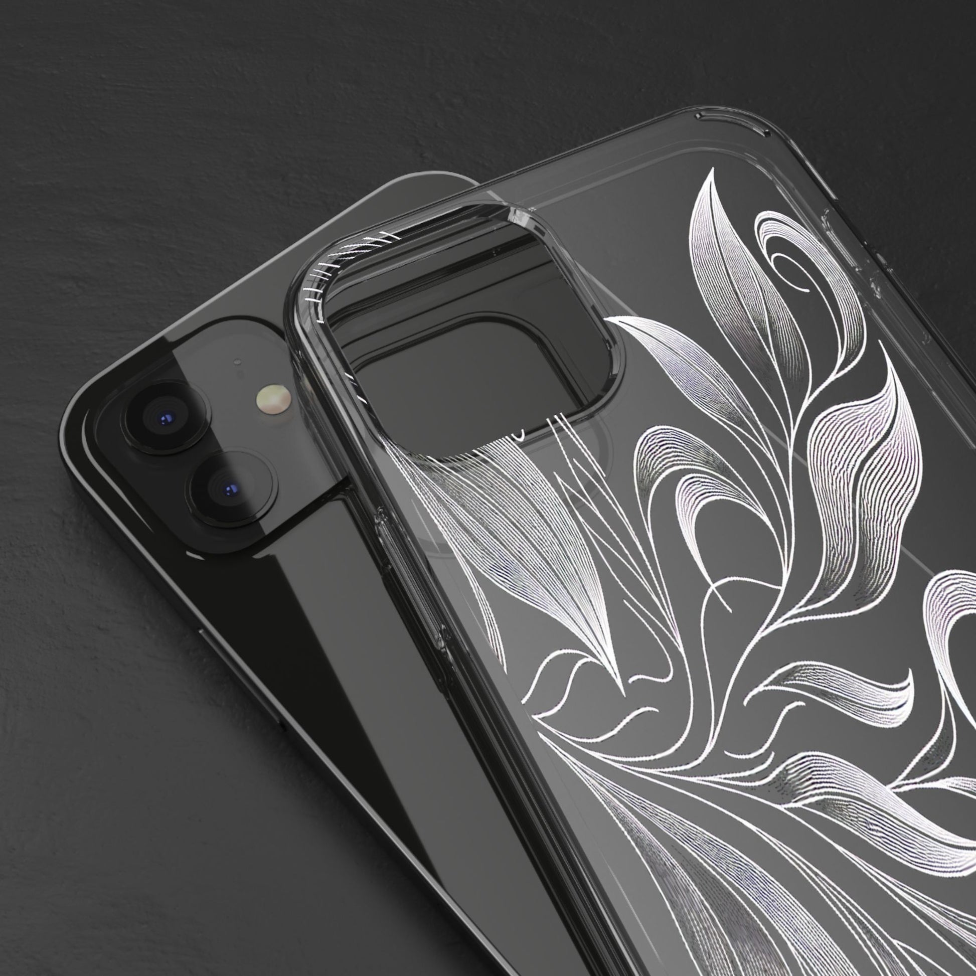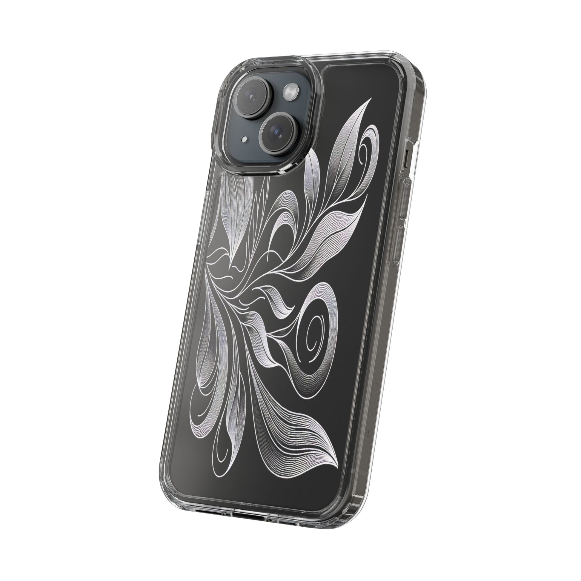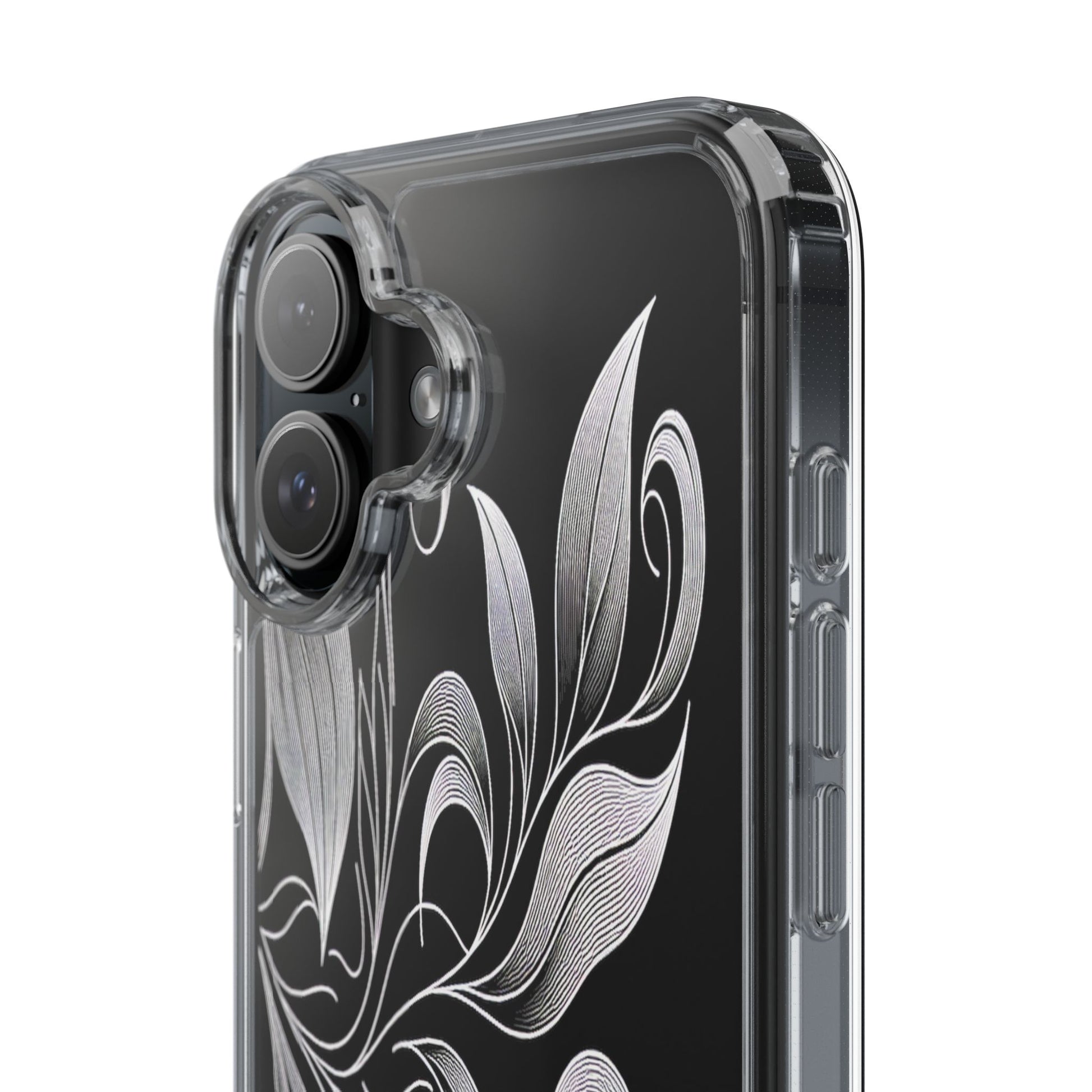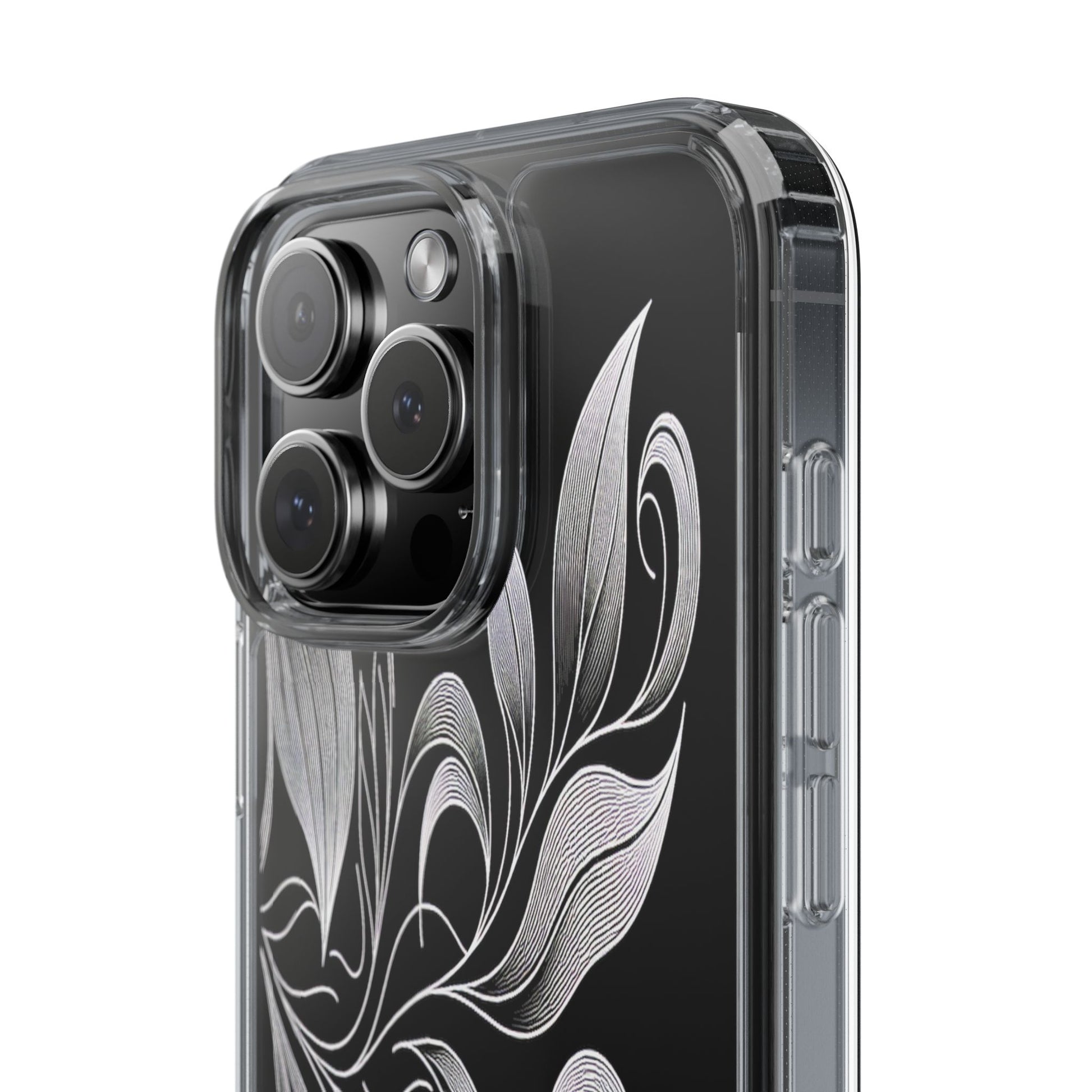 Intricate curving lines form elegant, abstract leaves and spirals on a black background. The delicate, white lines flow seamlessly, creating a dynamic and graceful pattern that evokes a sense of movement and artistic finesse. Protect your phone while showcasing its sleek design with our customizable clear phone case, designed to fit iPhones from the latest iPhone 16 to earlier models like iPhone XR, XS, and X. This slim and lightweight case is perfect for guarding against daily wear and tear, offering shock-absorbing and scratch-resistant protection.