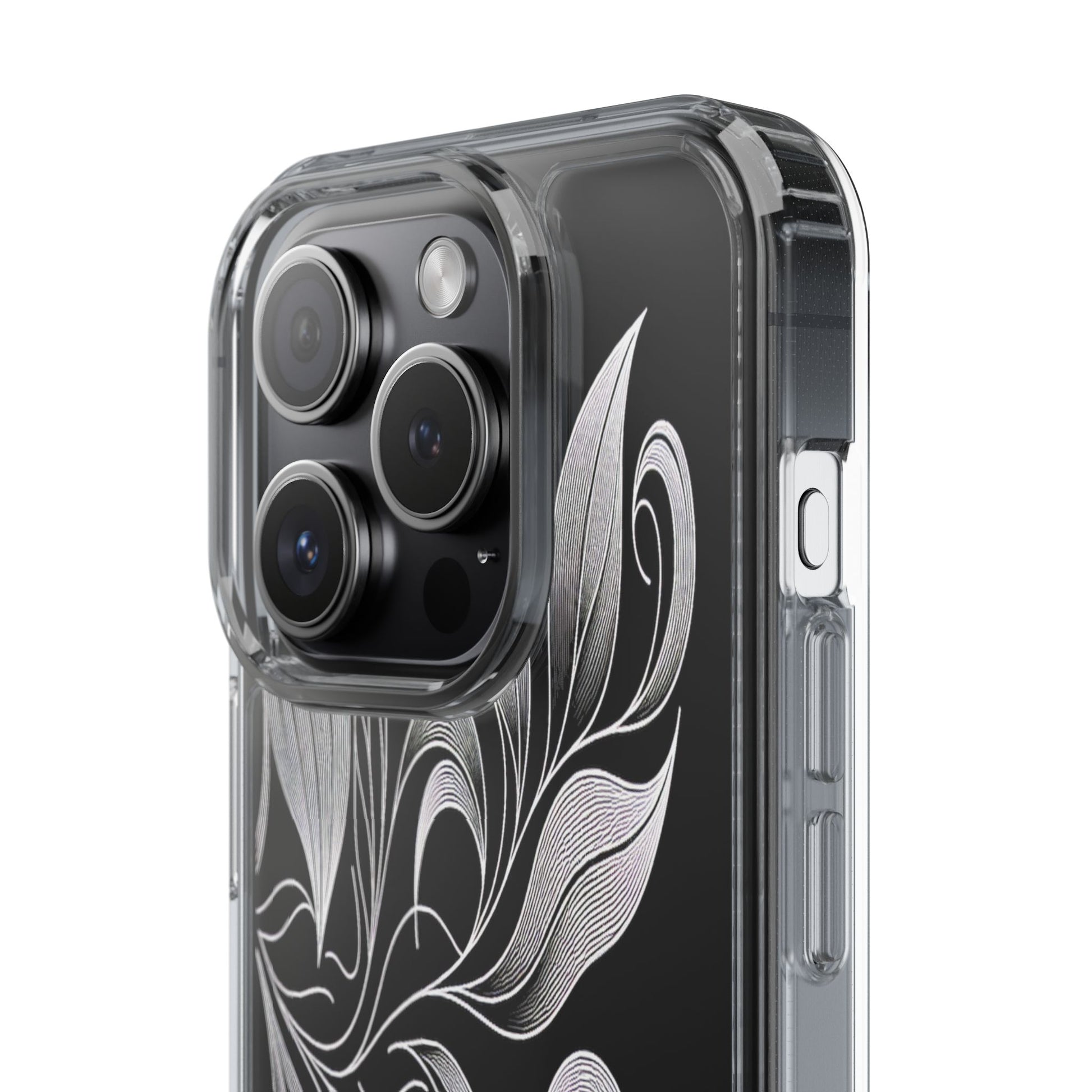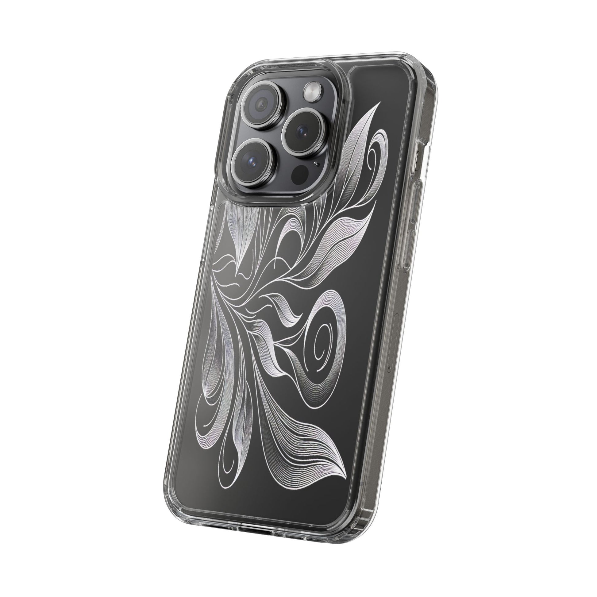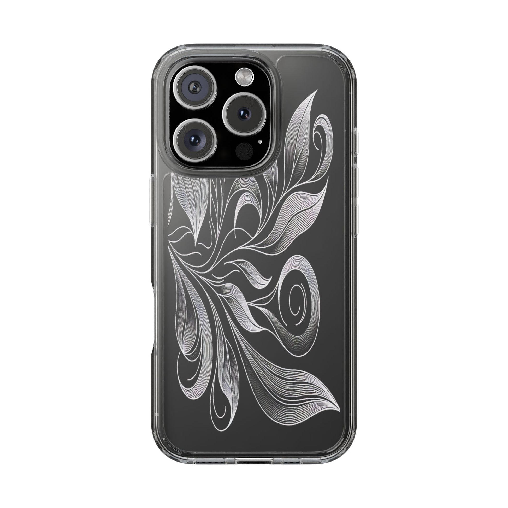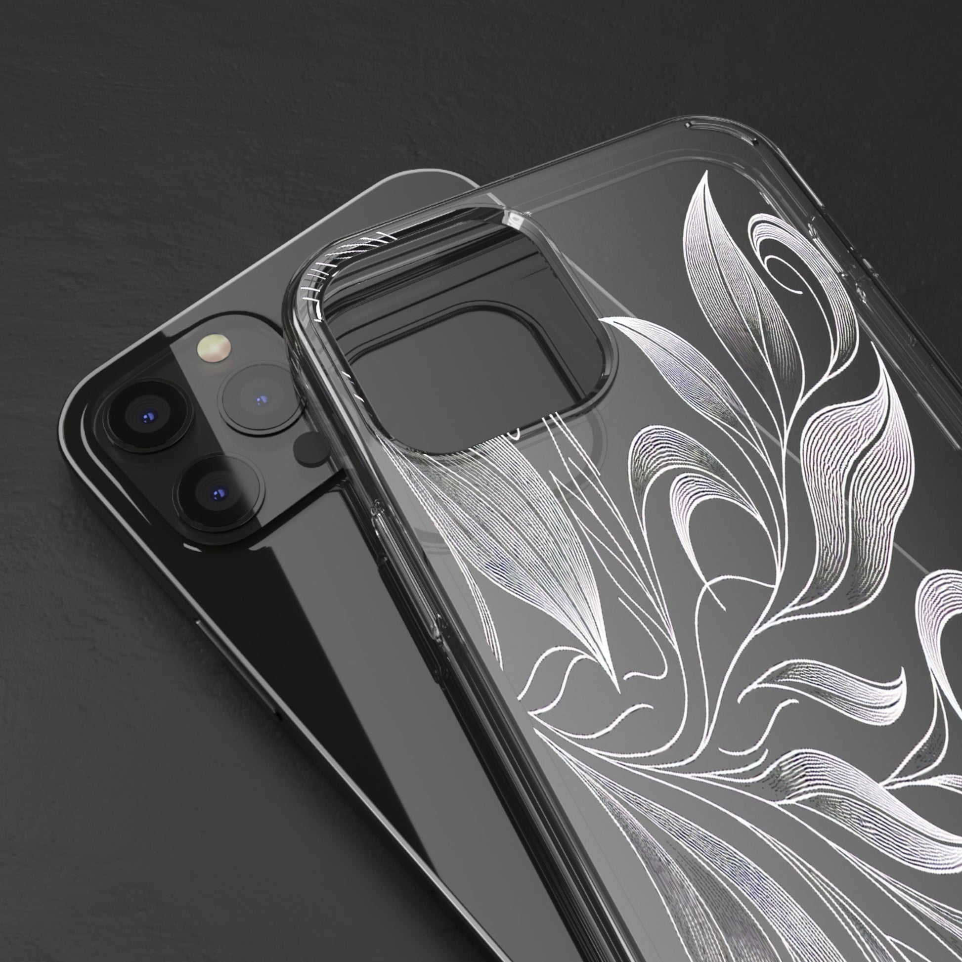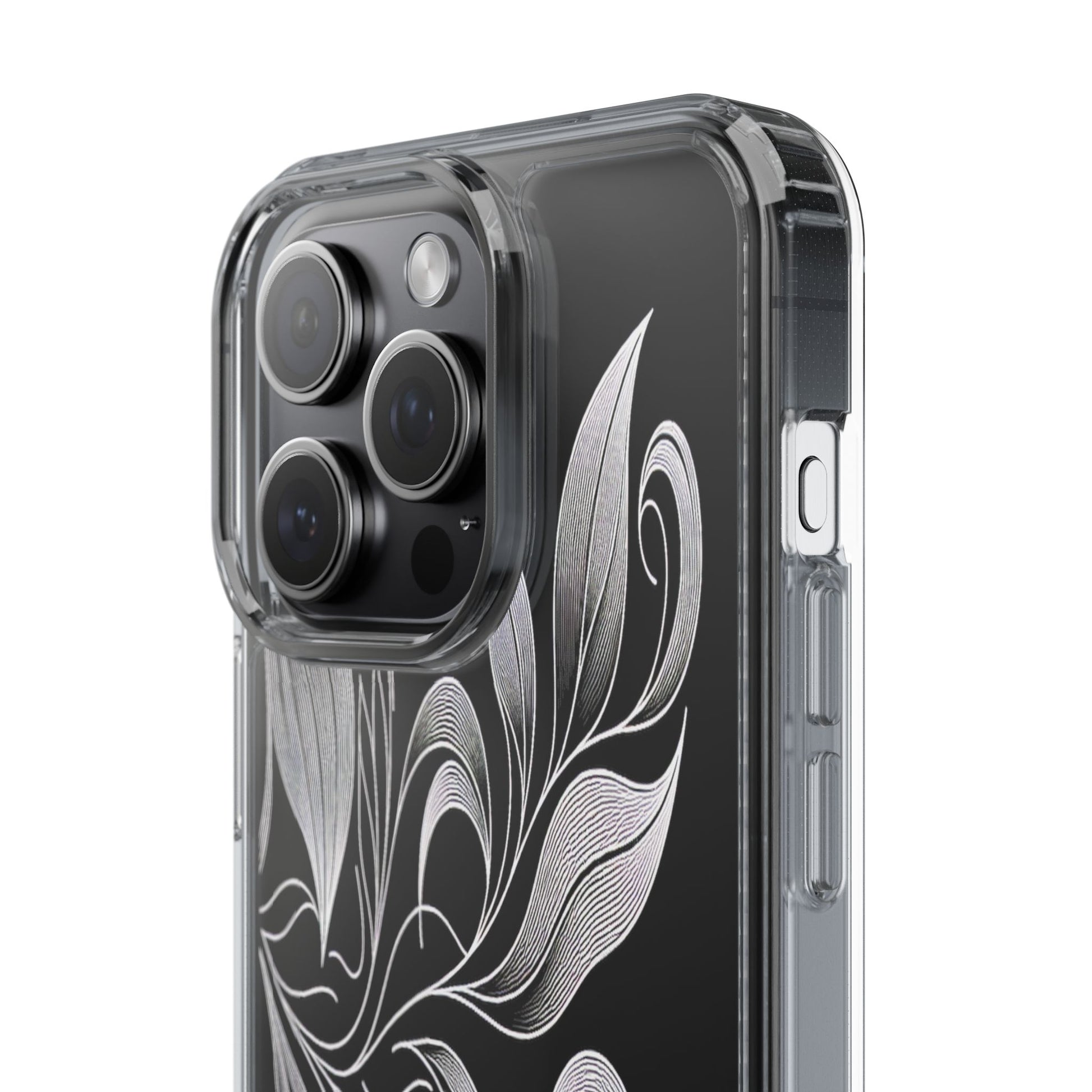 Intricate curving lines form elegant, abstract leaves and spirals on a black background. The delicate, white lines flow seamlessly, creating a dynamic and graceful pattern that evokes a sense of movement and artistic finesse. Protect your phone while showcasing its sleek design with our customizable clear phone case, designed to fit iPhones from the latest iPhone 16 to earlier models like iPhone XR, XS, and X. This slim and lightweight case is perfect for guarding against daily wear and tear, offering shock-absorbing and scratch-resistant protection.