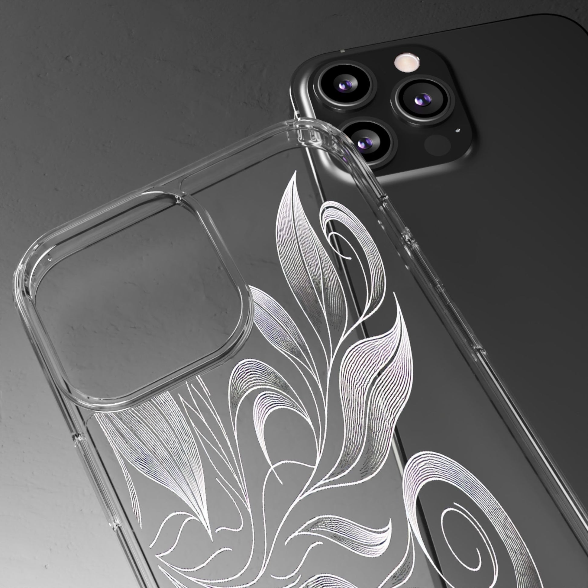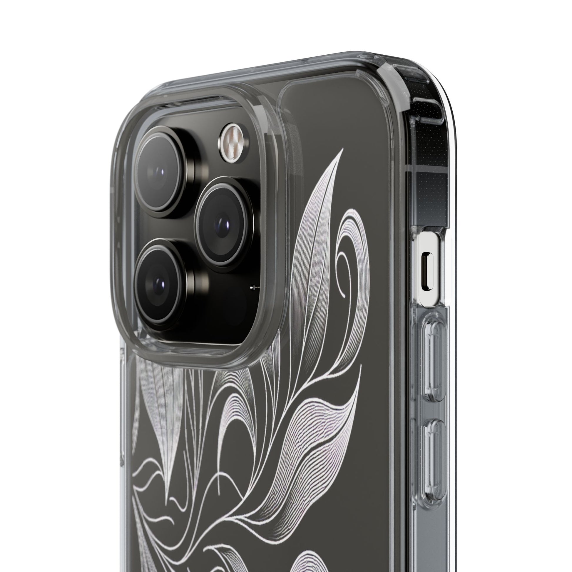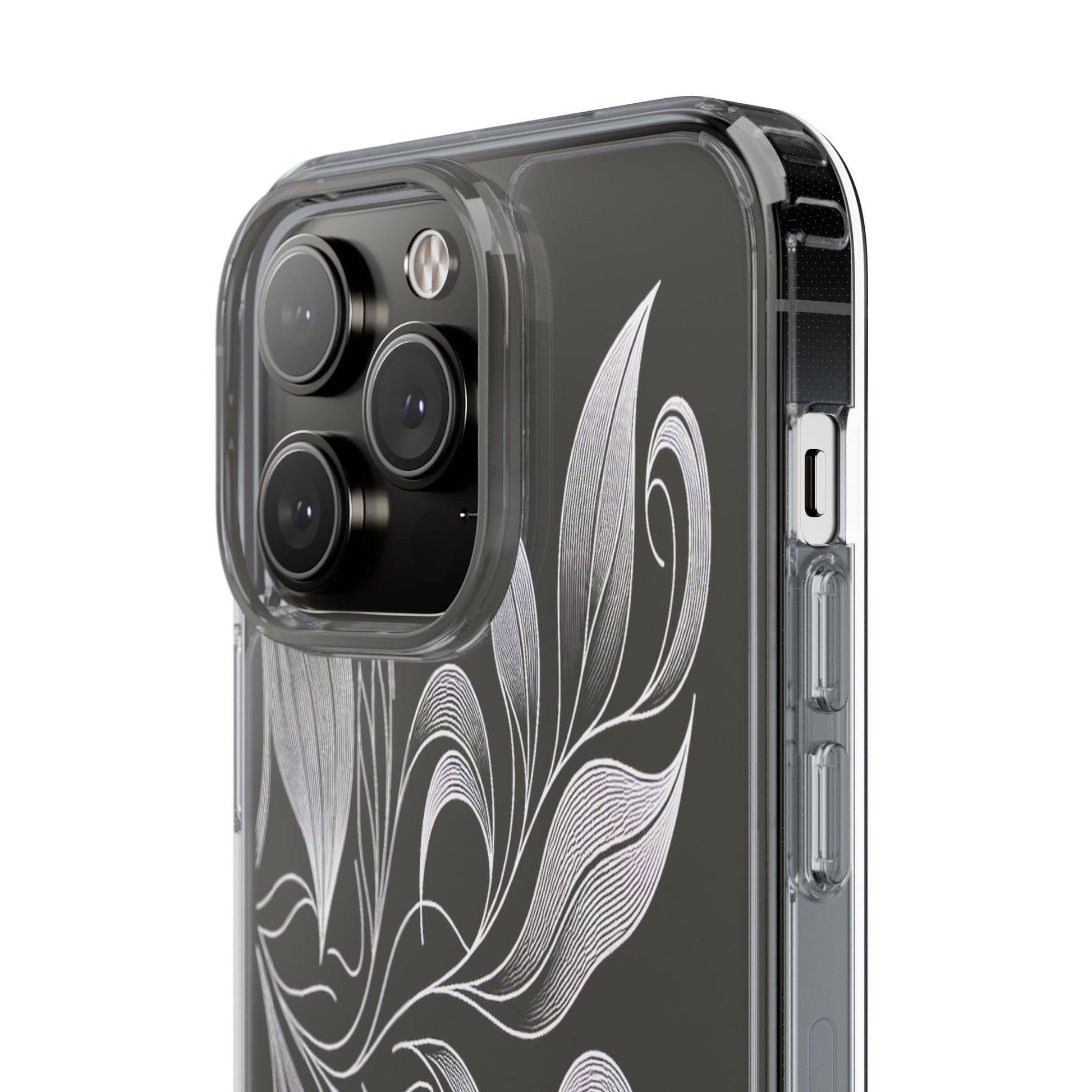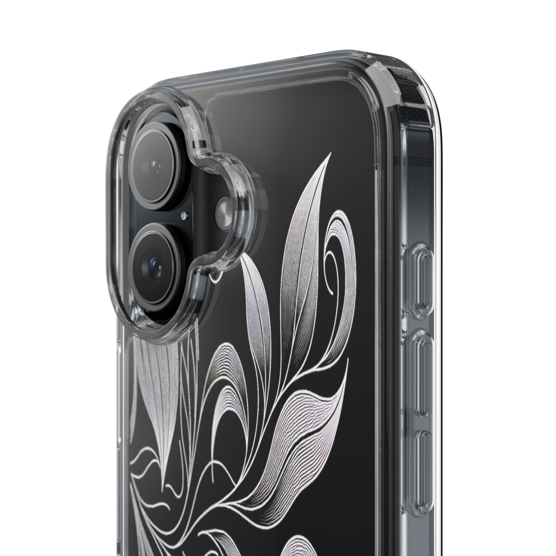 Intricate curving lines form elegant, abstract leaves and spirals on a black background. The delicate, white lines flow seamlessly, creating a dynamic and graceful pattern that evokes a sense of movement and artistic finesse. Protect your phone while showcasing its sleek design with our customizable clear phone case, designed to fit iPhones from the latest iPhone 16 to earlier models like iPhone XR, XS, and X. This slim and lightweight case is perfect for guarding against daily wear and tear, offering shock-absorbing and scratch-resistant protection.