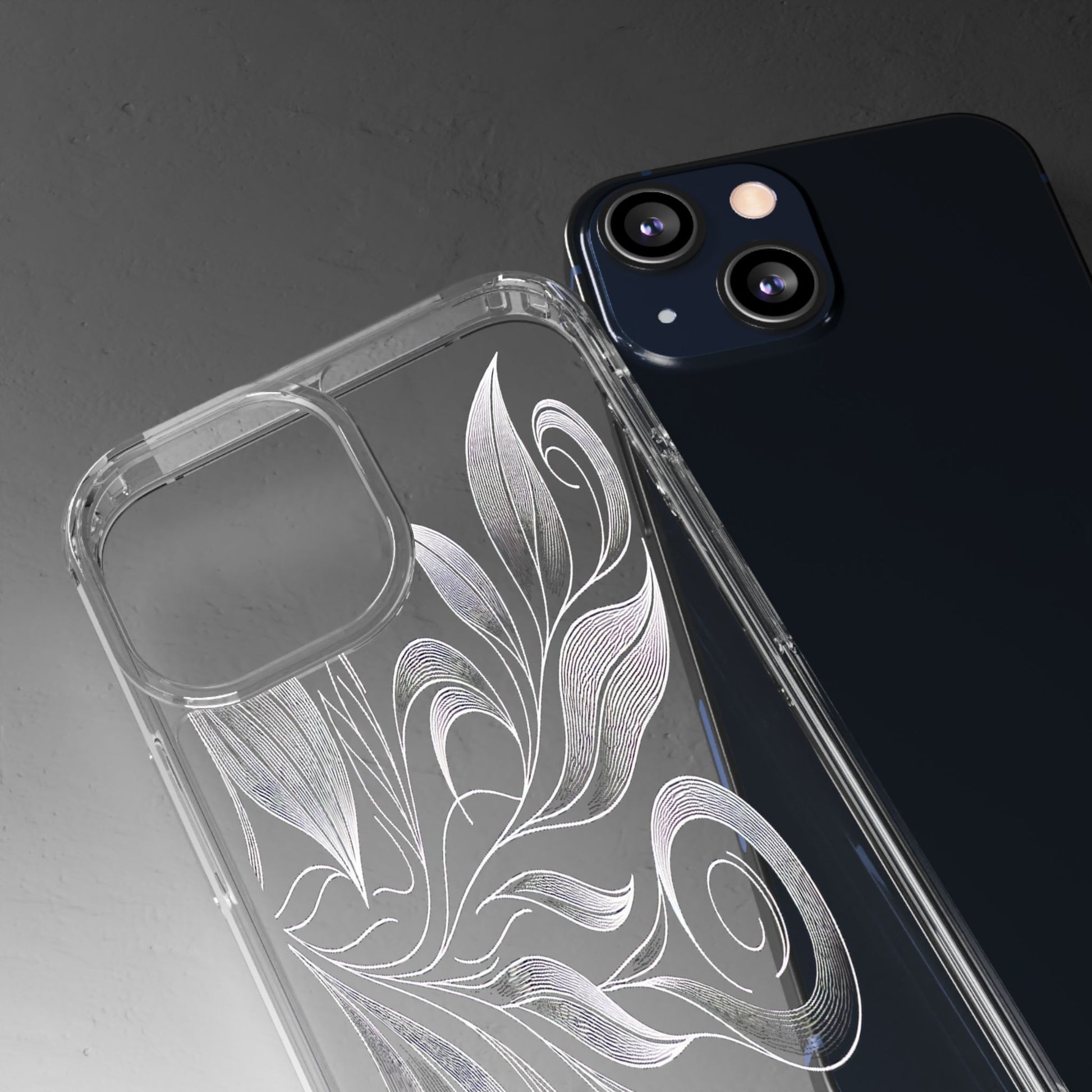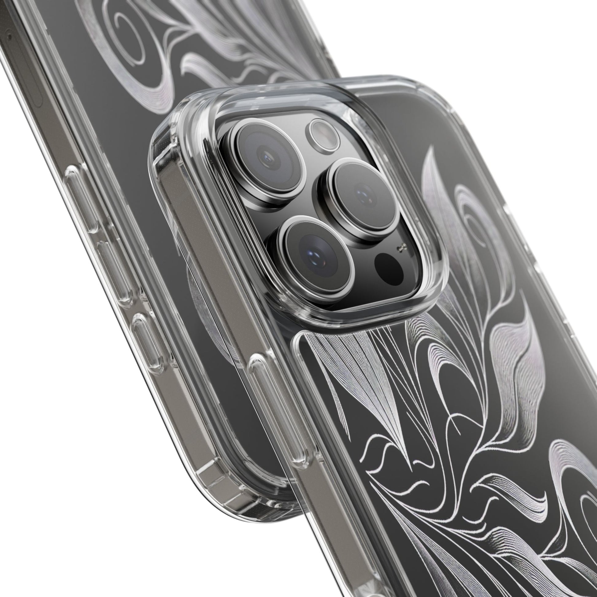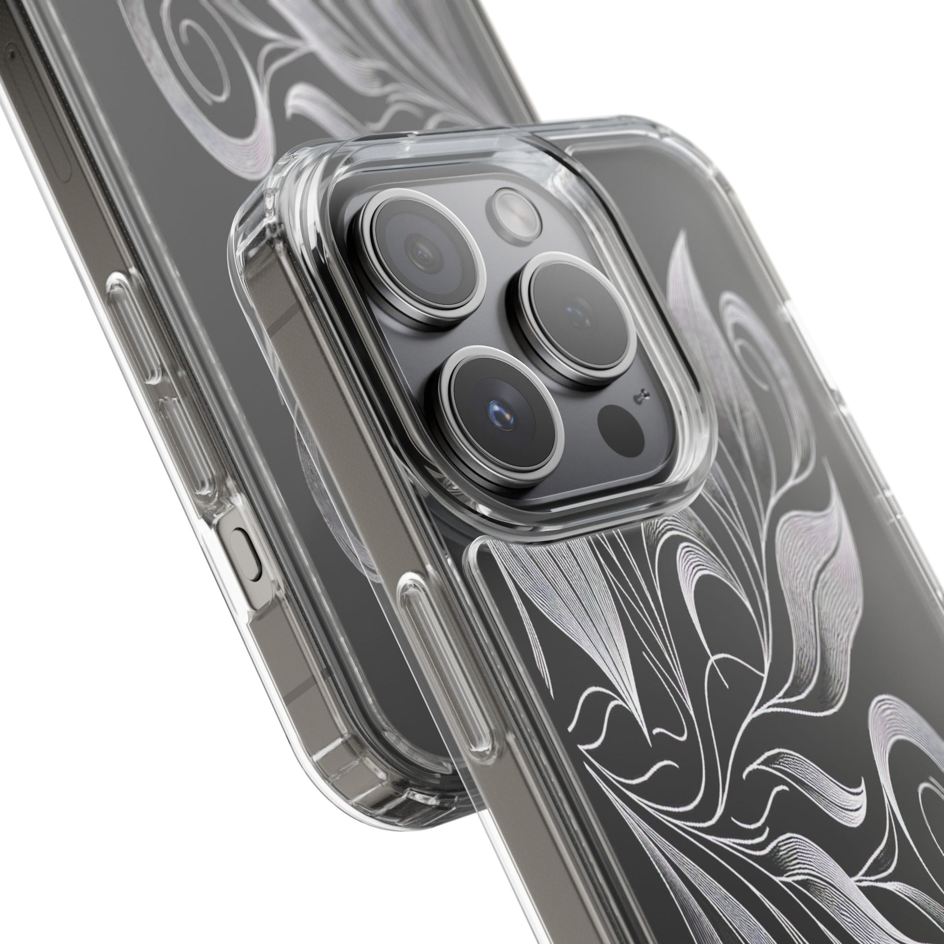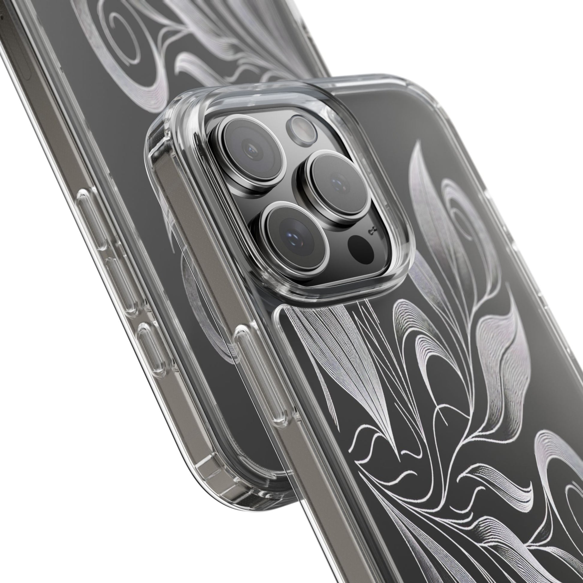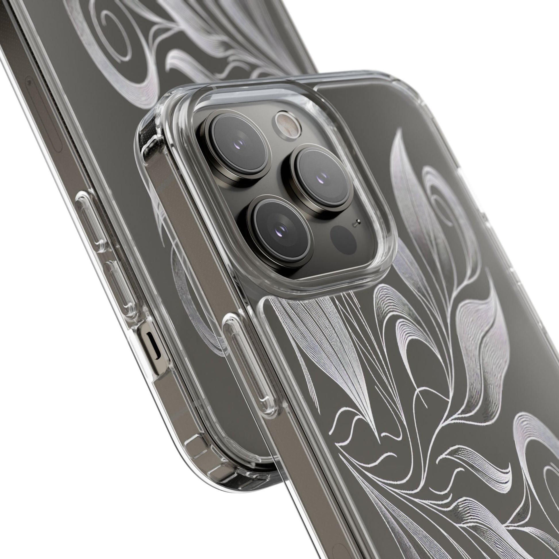 Intricate curving lines form elegant, abstract leaves and spirals on a black background. The delicate, white lines flow seamlessly, creating a dynamic and graceful pattern that evokes a sense of movement and artistic finesse. Protect your phone while showcasing its sleek design with our customizable clear phone case, designed to fit iPhones from the latest iPhone 16 to earlier models like iPhone XR, XS, and X. This slim and lightweight case is perfect for guarding against daily wear and tear, offering shock-absorbing and scratch-resistant protection.