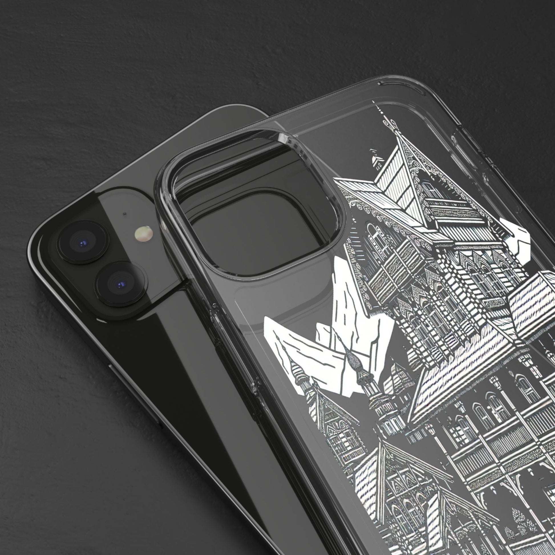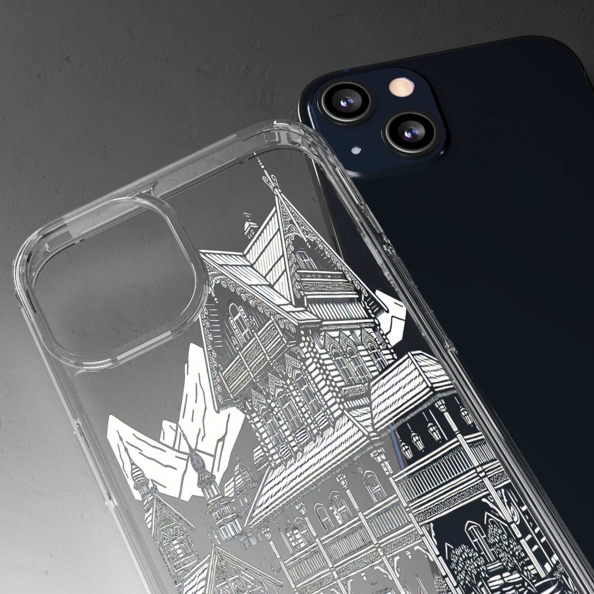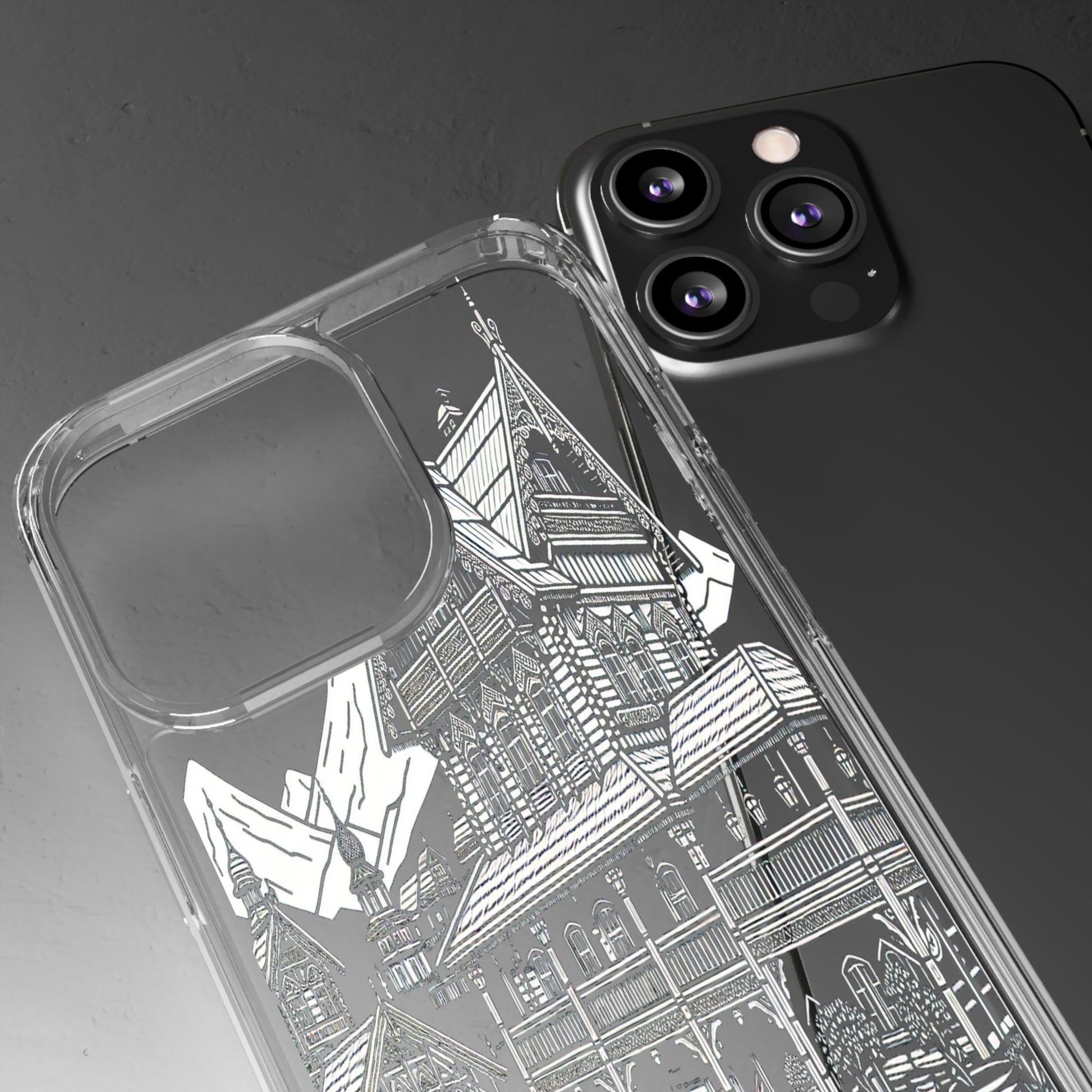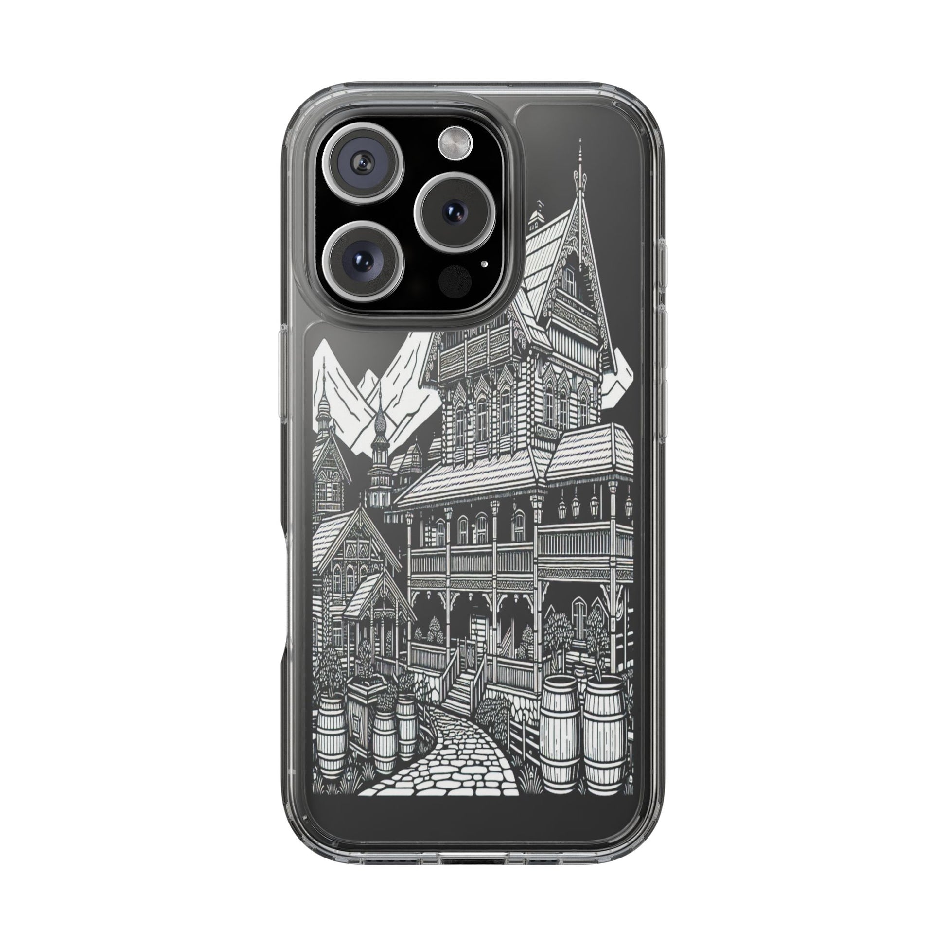 Intricate line drawing captures a grand wooden chalet with ornate balconies and carved details. Majestic mountains loom in the background, while barrels and lush greenery adorn the foreground, creating a blend of rustic charm and architectural elegance. Protect your phone while showcasing its sleek design with our customizable clear phone case, designed to fit iPhones from the latest iPhone 16 to earlier models like iPhone XR, XS, and X. This slim and lightweight case is perfect for guarding against daily wear and tear, offering shock-absorbing and scratch-resistant protection.