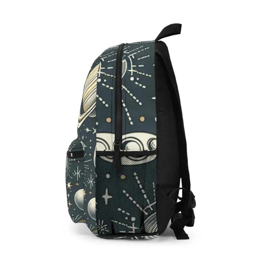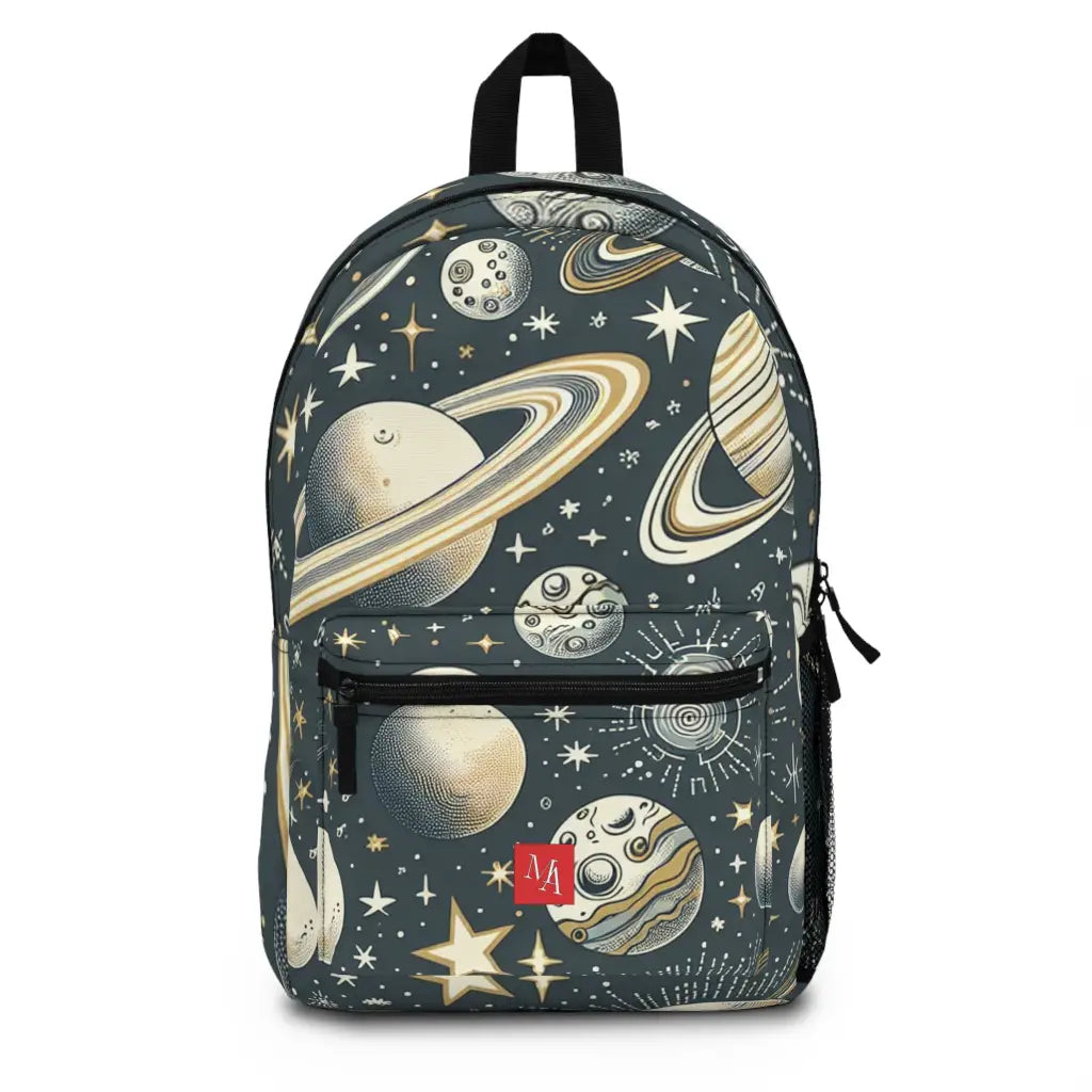 Playful celestial design with whimsy: golden planets, white stars, and shooting comets against a soft gray backdrop. The charming mix of textures and colors evokes a serene, space-inspired wonderland, perfect for igniting imagination. Introducing the ultimate backpack for fashion-forward adventurers! Our backpack boasts a striking textile design that will make a statement wherever you go. With its durable construction and spacious compartments, it is perfect for carrying all your essentials. Get ready to turn heads and stay organized with our backpack. #textiledesign #backpack #fashionforward #adventure #durable #spacious #statementpiece #organized #essentials #travel #explore