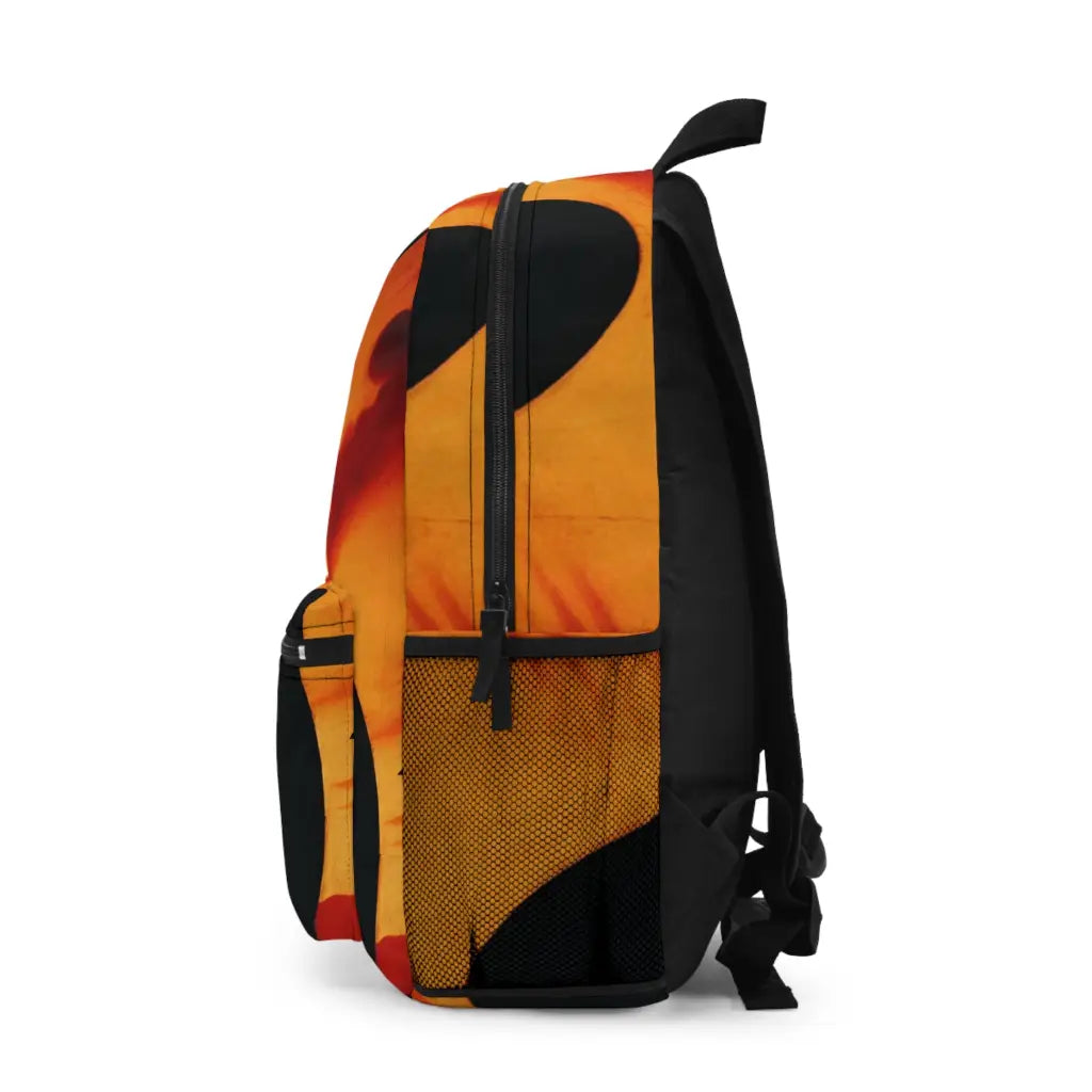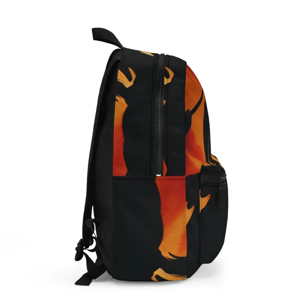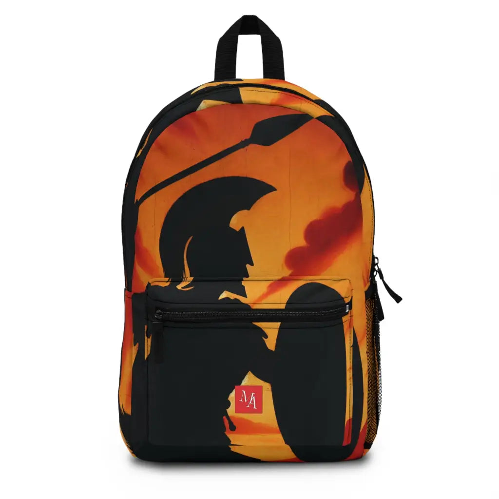 A dynamic silhouette of a warrior stands against a fiery sunset, wielding a spear and shield. Arrows pierce the sky, creating an intense, heroic scene. The bold contrast of black against a vibrant orange background enhances the dramatic, timeless energy of the moment. Introducing the ultimate backpack for fashion-forward adventurers! Our backpack boasts a striking textile design that will make a statement wherever you go. With its durable construction and spacious compartments, it is perfect for carrying all your essentials. Get ready to turn heads and stay organized with our backpack. #textiledesign #backpack #fashionforward #adventure #durable #spacious #statementpiece #organized #essentials #travel #explore