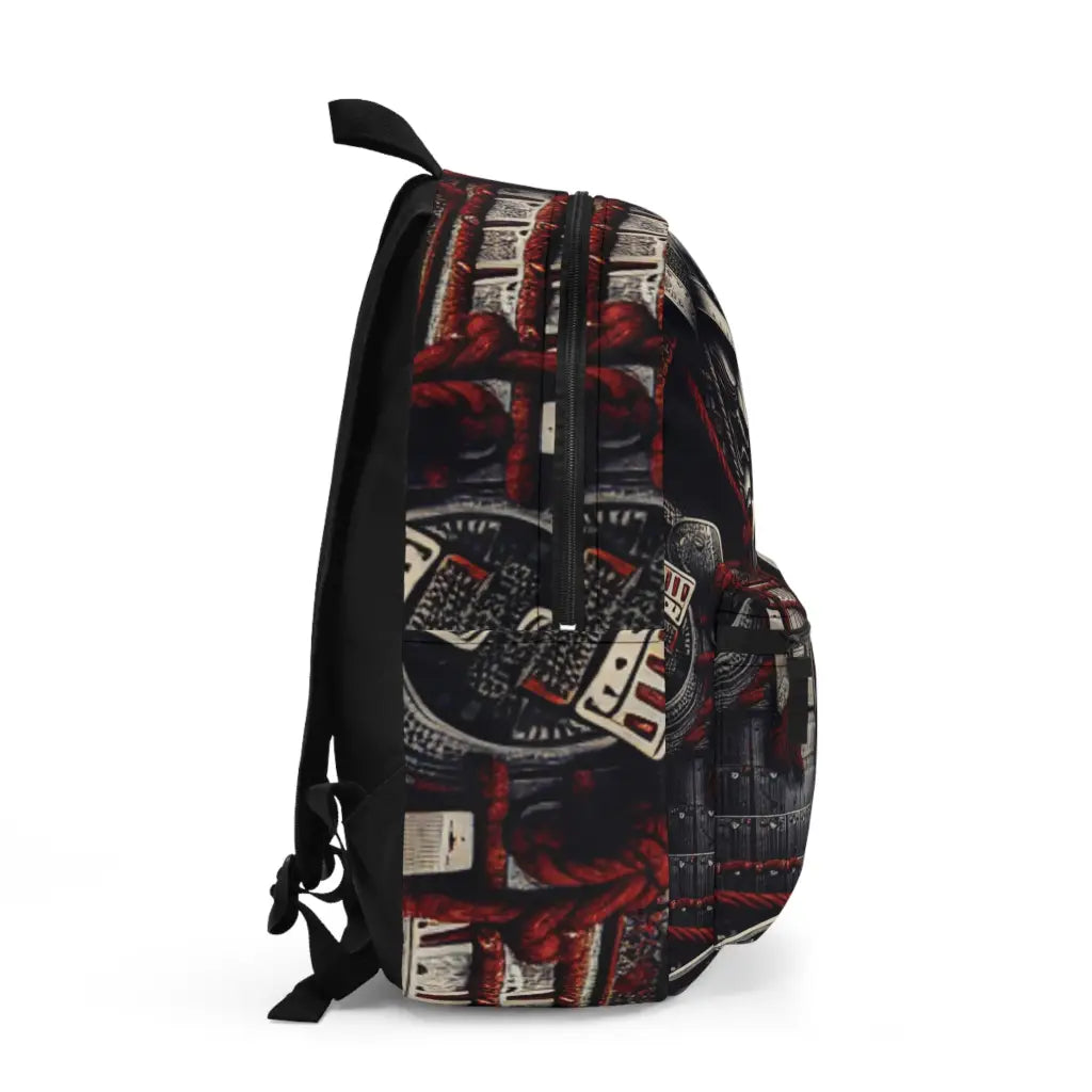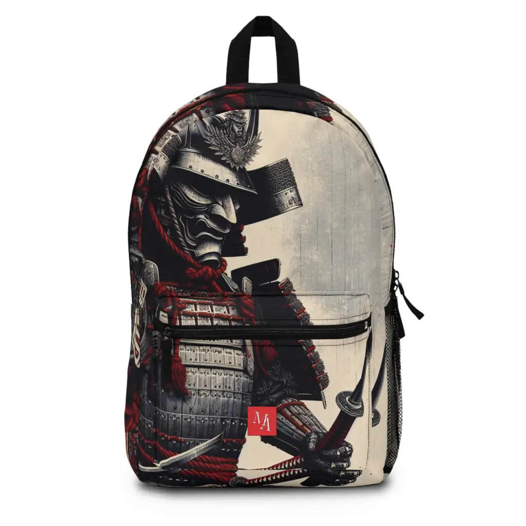 A striking depiction of a samurai, enveloped in red and white hues, exuding intensity and focus. The artist combines traditional armor with a modern, watercolor effect, creating a dynamic fusion of history and artistry. The subtle splashes enhance the warrior's fierce presence and timeless mystique. Introducing the ultimate backpack for fashion-forward adventurers! Our backpack boasts a striking textile design that will make a statement wherever you go. With its durable construction and spacious compartments, it is perfect for carrying all your essentials. Get ready to turn heads and stay organized with our backpack. #textiledesign #backpack #fashionforward #adventure #durable #spacious #statementpiece #organized #essentials #travel #explore