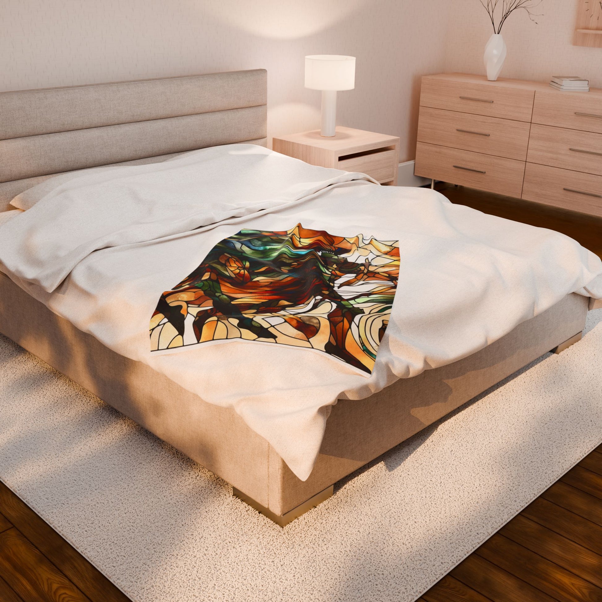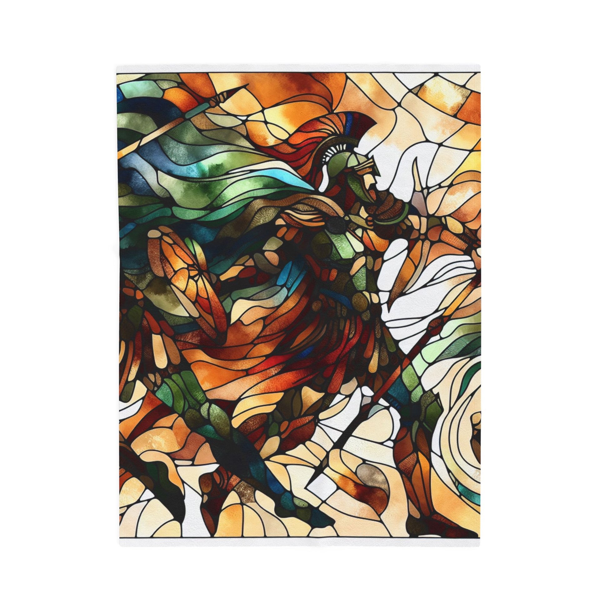 A vibrant stained-glass depiction of an ancient warrior in dynamic motion, melding earth tones with blues and greens. The intricate mosaic of flowing lines and vivid colors captures a battle scene, evoking a sense of strength and movement. Create a cozy and warm atmosphere at home with this plush velveteen blanket. It is soft to touch and perfect for any home. Customize with a one-sided print to add your personal touch or create a gift for your friends and family. Available in three sizes: 30x40", 50x60", 60x80".