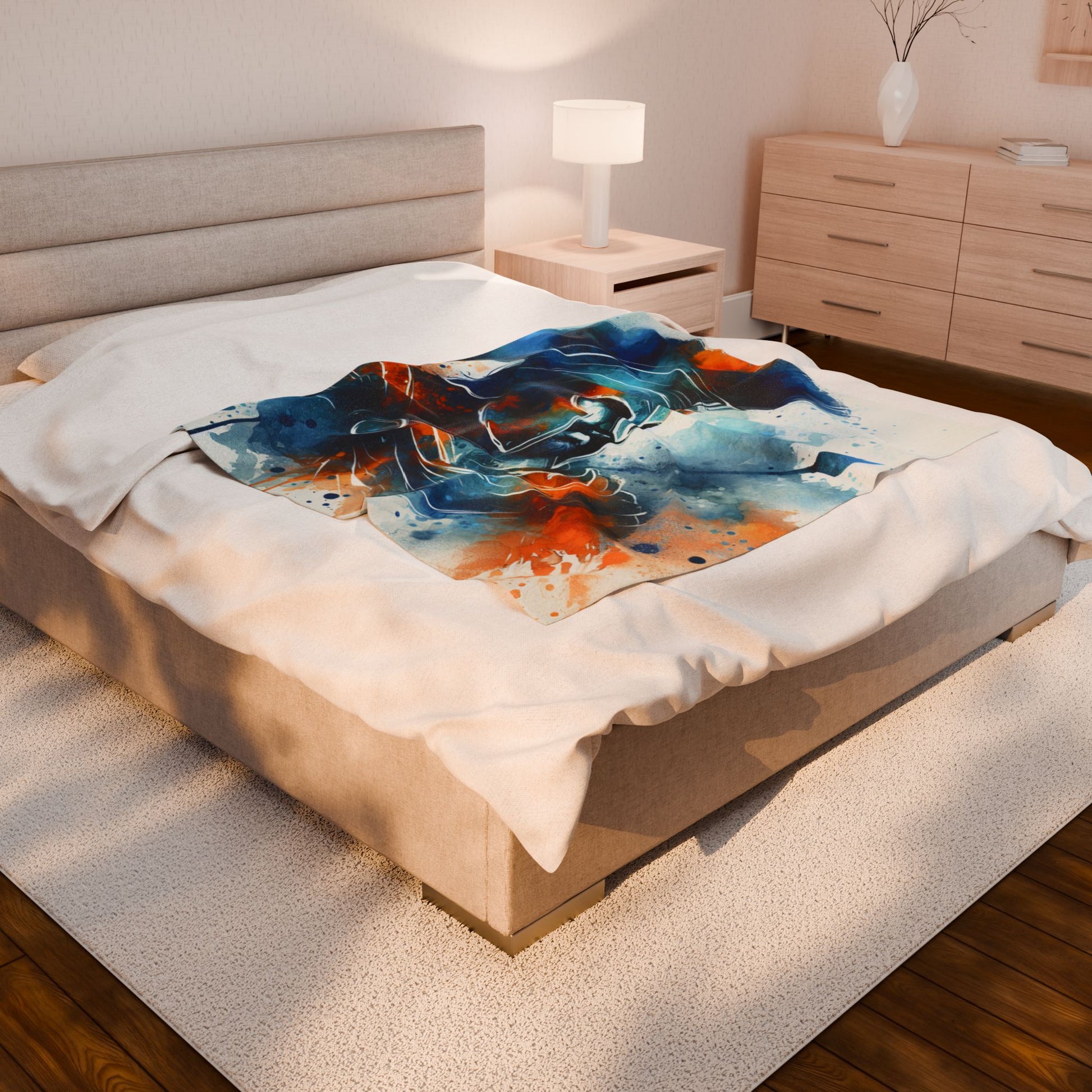 Dynamic watercolor of a Spartan warrior, blending vivid blues and fiery oranges. The helmet and plume are intricately detailed, creating a striking interplay of color and form, capturing both strength and artistry. Create a cozy and warm atmosphere at home with this plush velveteen blanket. It is soft to touch and perfect for any home. Customize with a one-sided print to add your personal touch or create a gift for your friends and family. Available in three sizes: 30x40", 50x60", 60x80".