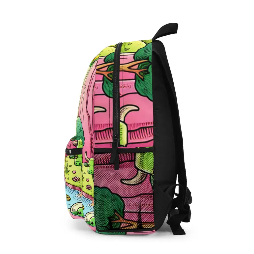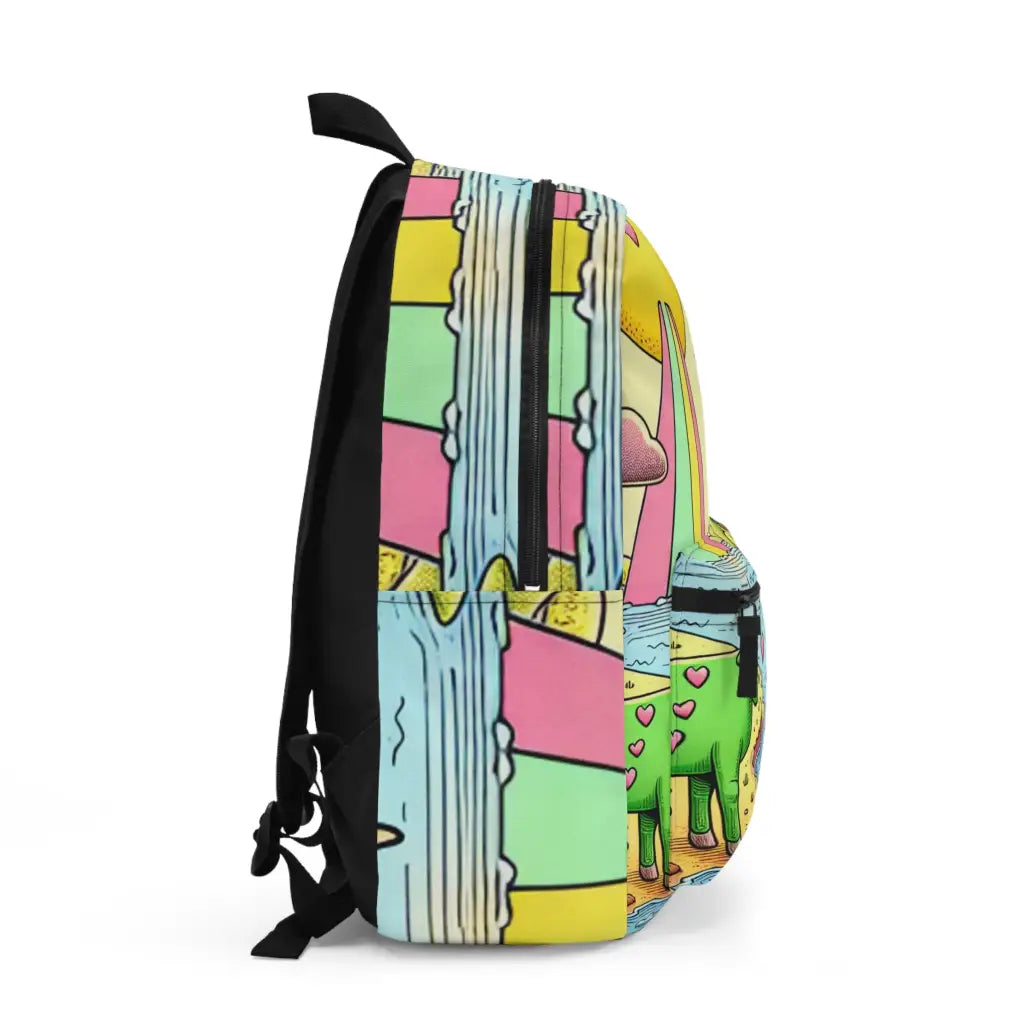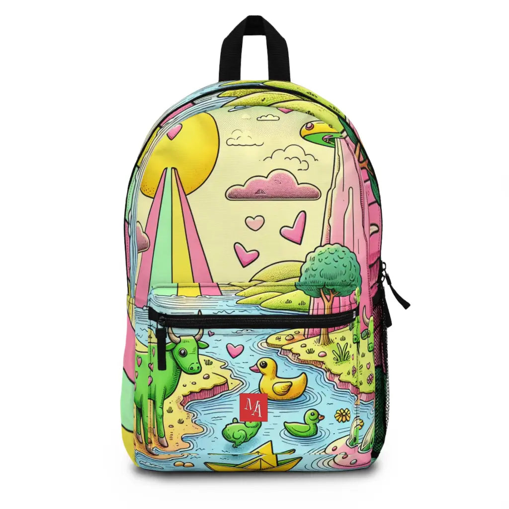 This whimsical illustration features vibrantly colored animals and landscapes, including green cows with heart markings and a paper boat on a stream. A sun, drawn with playful strokes, hovers above, while surreal pink mountains and a curious yellow rubber duck enhance the fantastical scene. Introducing the ultimate backpack for fashion-forward adventurers! Our backpack boasts a striking textile design that will make a statement wherever you go. With its durable construction and spacious compartments, it is perfect for carrying all your essentials. Get ready to turn heads and stay organized with our backpack. #textiledesign #backpack #fashionforward #adventure #durable #spacious #statementpiece #organized #essentials #travel #explore