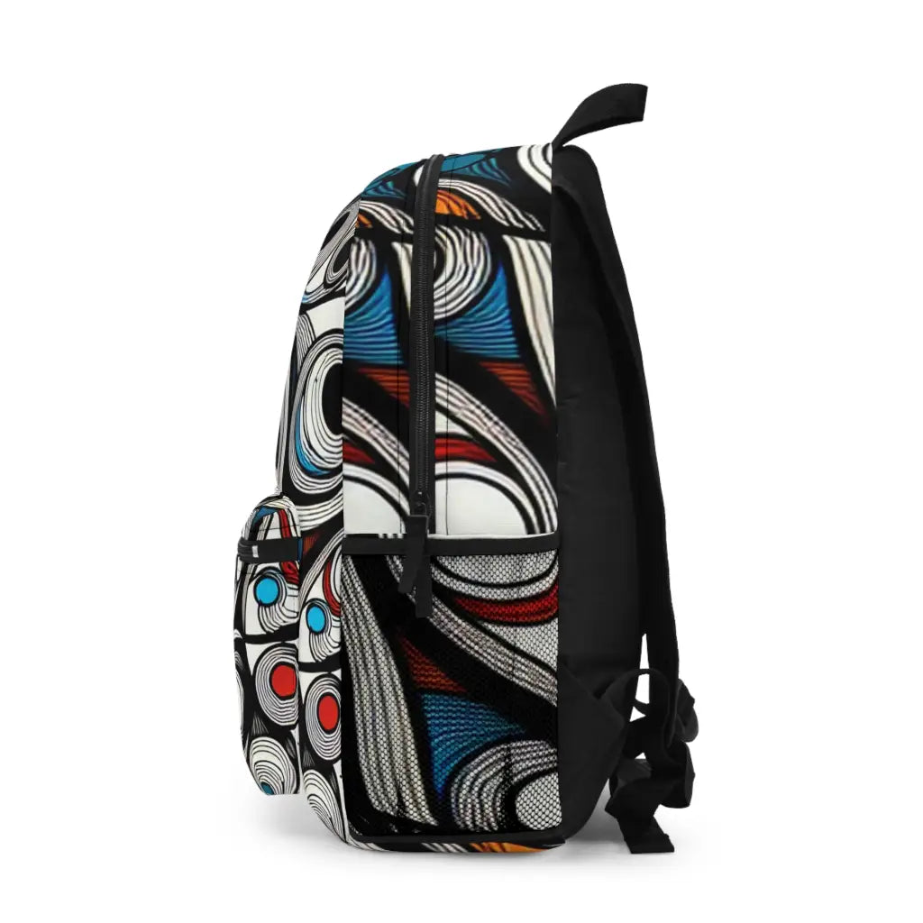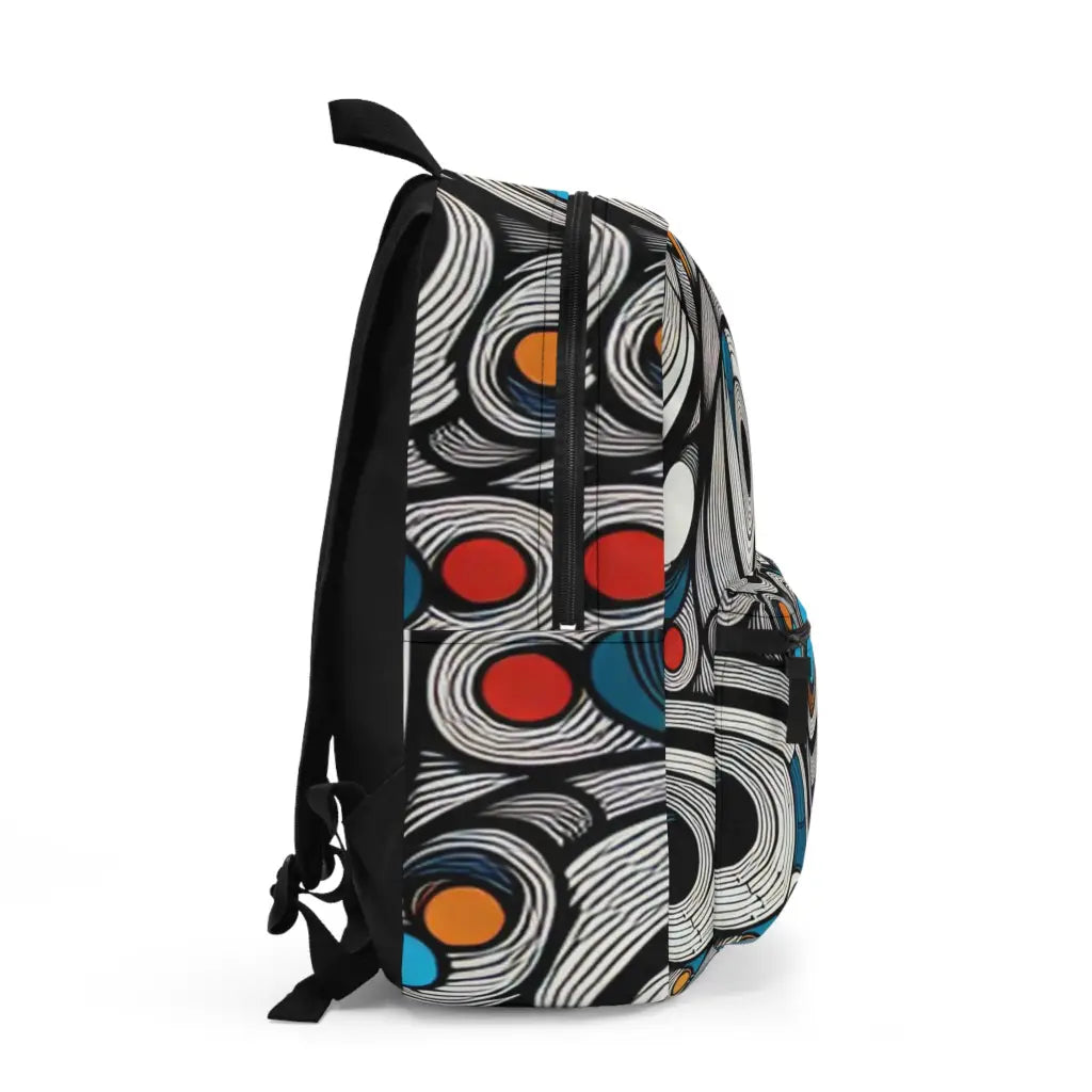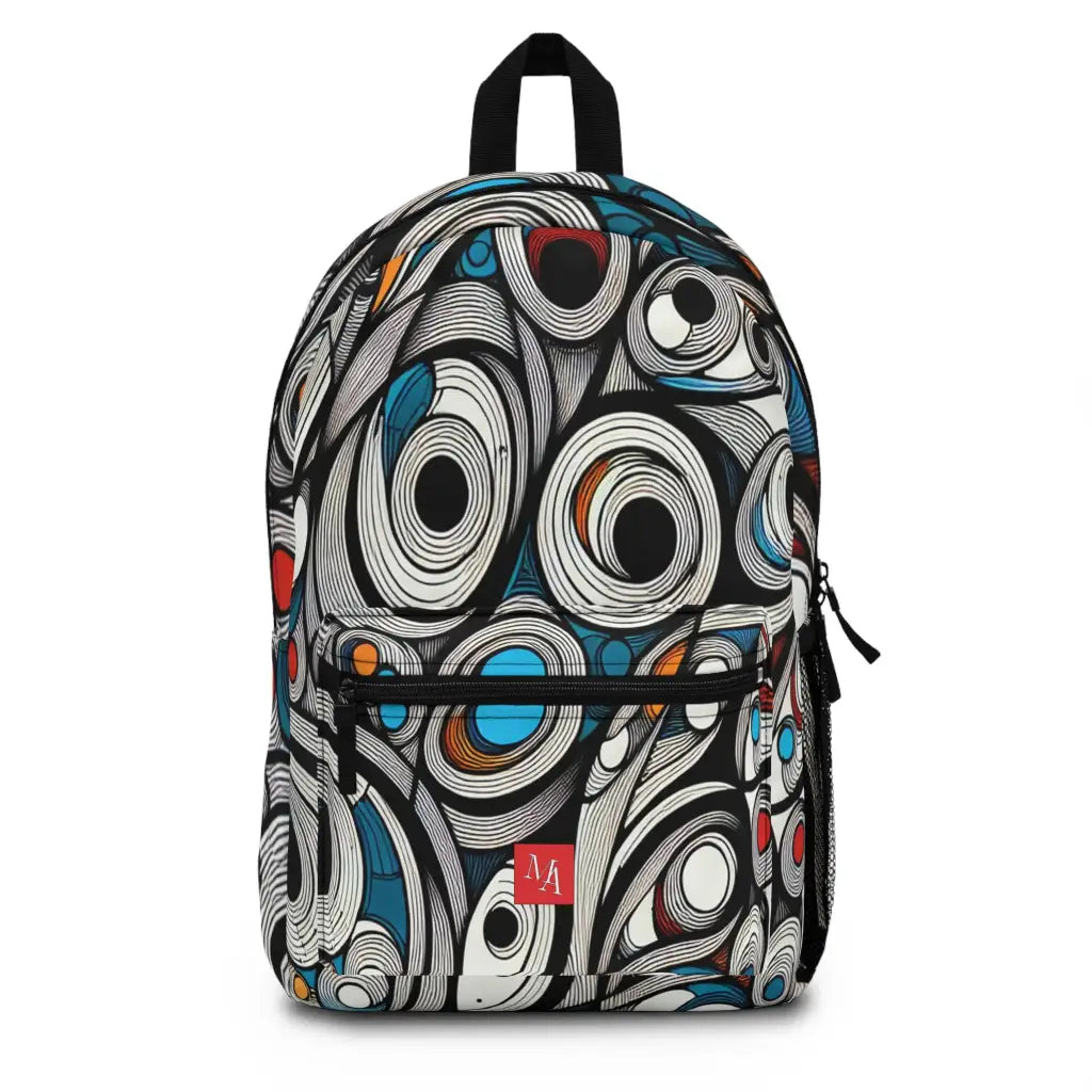 Dynamic and vibrant, this artwork features swirling organic shapes and concentric circles. Bold lines interlace with splashes of blue, red, and yellow, creating a harmonious, abstract kaleidoscope that captivates and intrigues. Introducing the ultimate backpack for fashion-forward adventurers! Our backpack boasts a striking textile design that will make a statement wherever you go. With its durable construction and spacious compartments, it is perfect for carrying all your essentials. Get ready to turn heads and stay organized with our backpack. #textiledesign #backpack #fashionforward #adventure #durable #spacious #statementpiece #organized #essentials #travel #explore