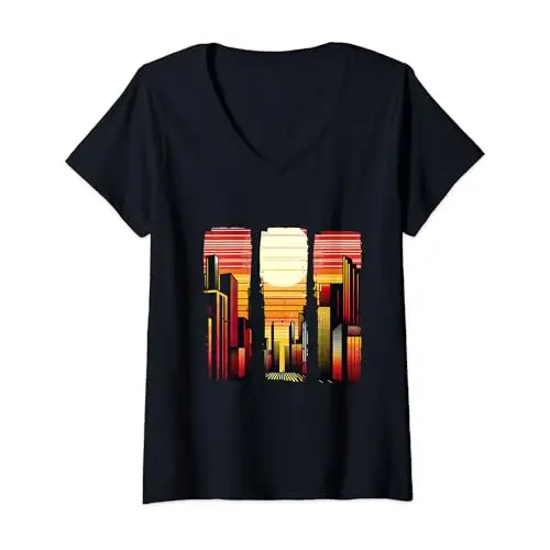 Womens Sunset Skyline Symphony Vibrant City Horizon V-Neck T-Shirt