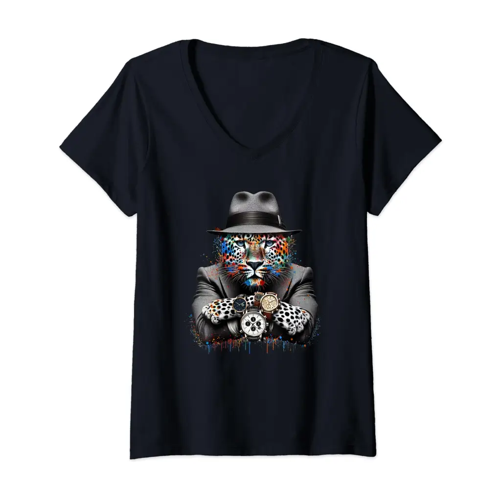 Womens Urban Drip Streetwear Hip Hop Leopard Hustle Money V-Neck T-Shirt